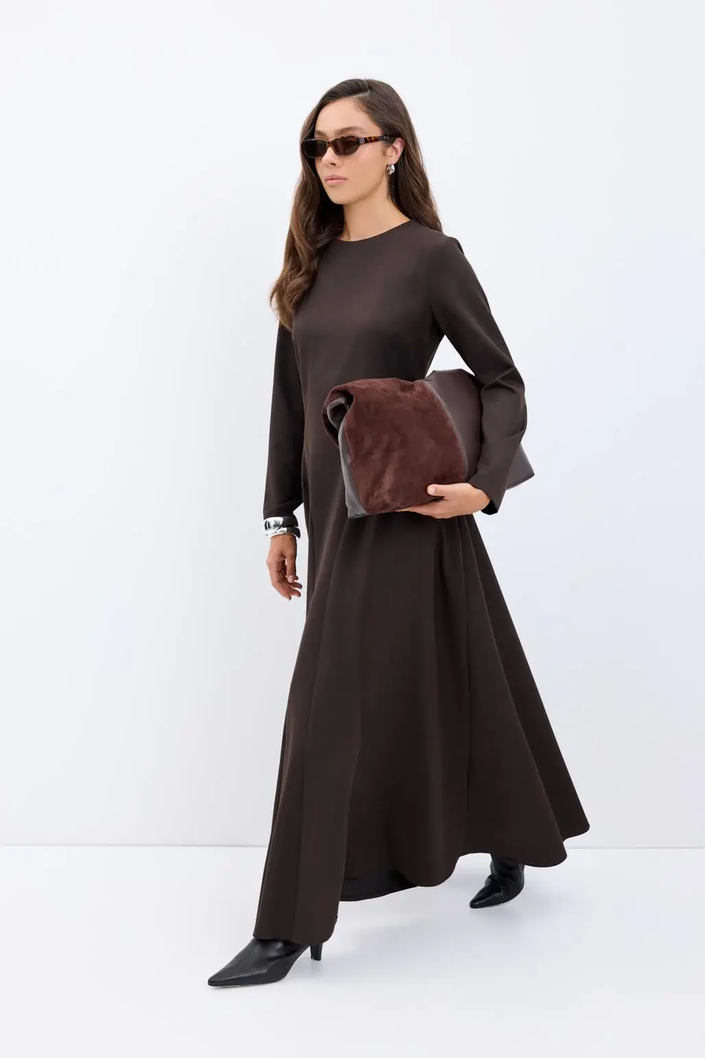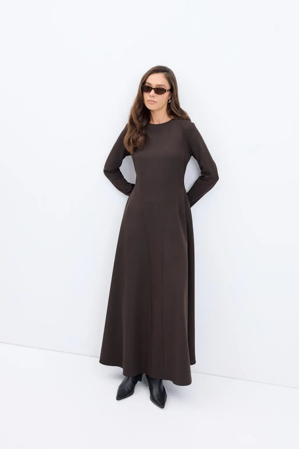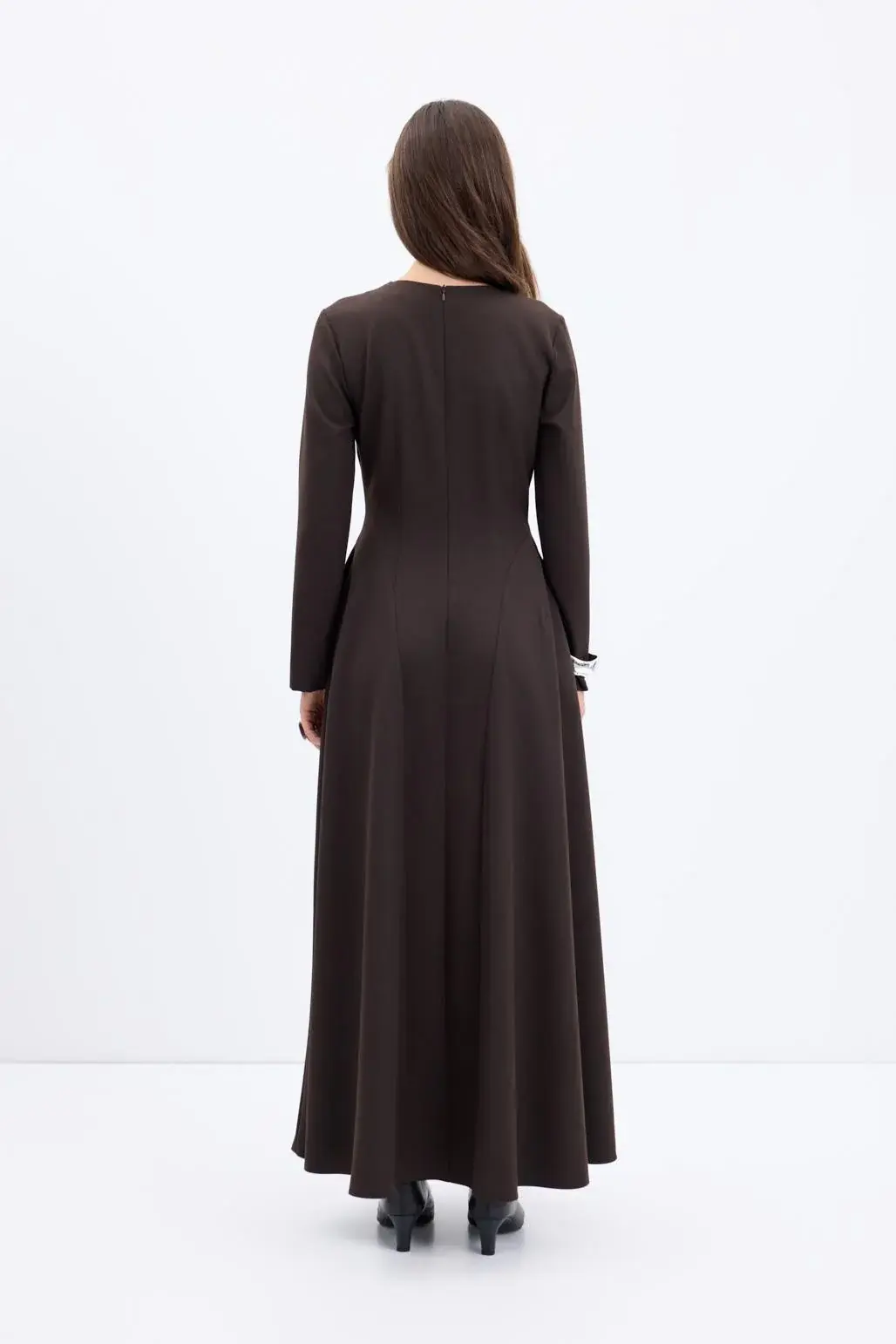 Bisiklet Yaka Parçalı Uzun Elbise Kahve, viskon karışımlı kumaşıyla yumuşak bir his sunar. Bisiklet yaka, uzun kol ve arka fermuar kapamasıyla şık ve pratik bir tasarıma sahiptir. Yan parça detayları ve seyyar kemeriyle vücuda zarif bir form verirken, kloş kesimi hareketlerine zarif bir akış katar.