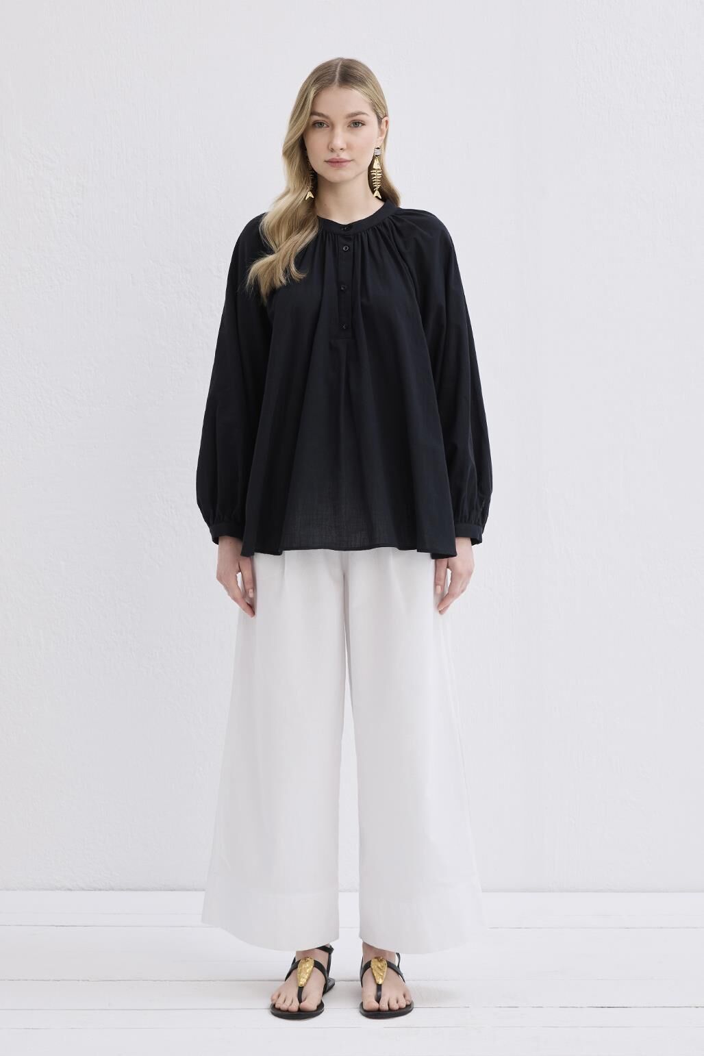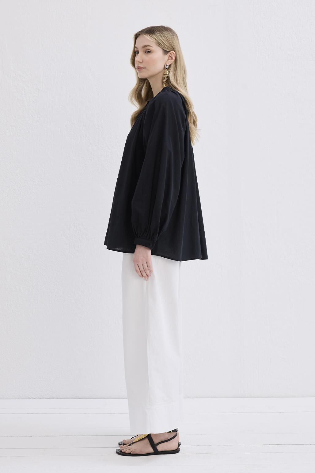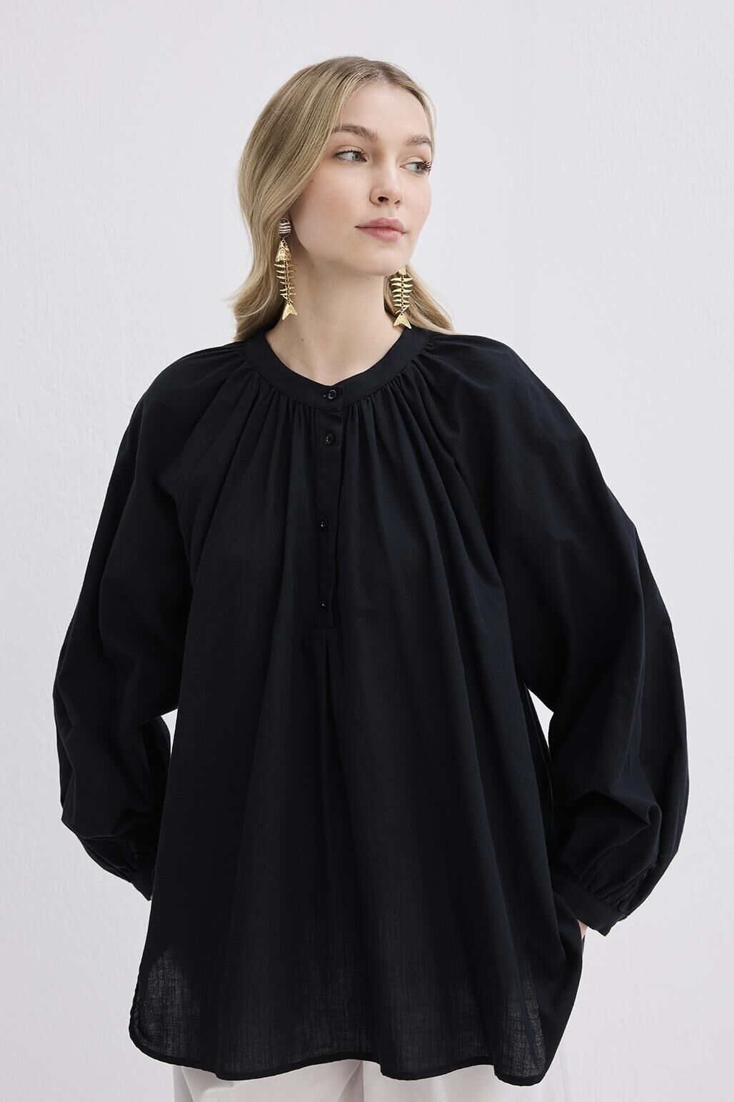 - Dik yaka, yarım patlı, omuz ve yakadan büzgülü, bilezik manşet,