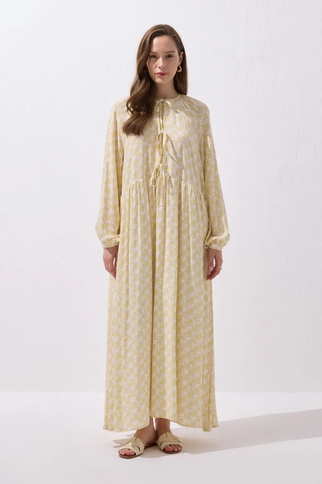 Fleur Viskon Bağlamalı Uzun Elbise Sarı, viskon kumaşı, hafifliği ve nefes alabilir yapısıyla size gün boyu konfor sunarken, bisiklet yaka ve reglan kol detayları modern bir hava katıyor. Omuzlardaki büzgü detayı ve bel kısmındaki bağlama detayı, vücut hatlarınızı zarifçe vurgular. Yarım patlı kapanma detayı ise kullanım kolaylığı sağlar. Rahat kesimi ve uzun formuyla gündüzden geceye kadar şıklığınızı koruyarak yaz kombinlerinize mükemmel bir uyum sağlar. Hem şık bir terlik hem de spor ayakkabılarla rahatça kombinleyebilirsiniz. Giy çık kolaylığını en iyi şekilde sunarak gardırobunuzun star parçası olacak!