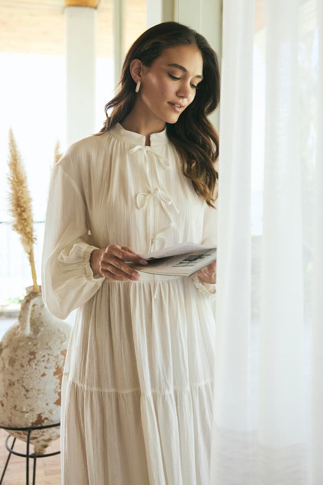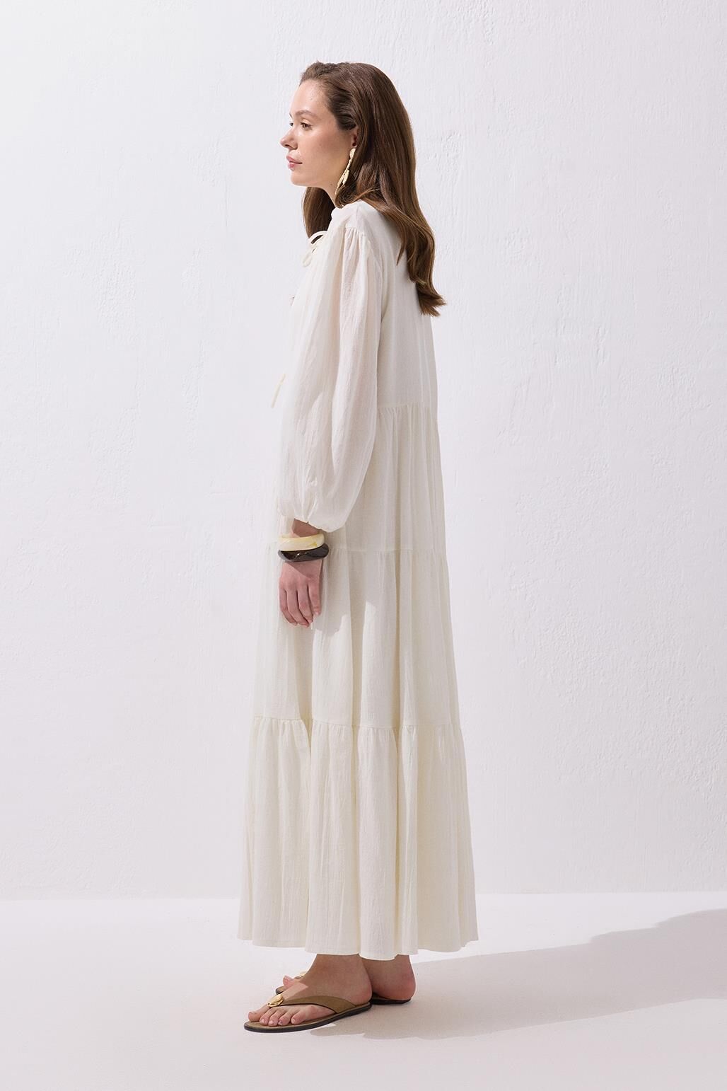Joli Bağlamalı Şile Bezi Uzun Elbise Ekru, pamuk karışımlı şile bezi kumaşı sayesinde nefes alabilirlik sağlayarak gün boyu konforlu bir kullanım sunar. Dikey yaka ve yarım pat detayı modern bir hava yaratırken, etek kısmındaki katlı kesim ve omuz büzgüleri şıklığına şıklık katar. Balon kol ve kol ucu lastikleri, elbiseye hareket özgürlüğü sunar. Yarım pat ve bağlamalı tasarımıyla, zarif bir siluet elde edilirken, her anınıza rahatlıkla uyum sağlar. Gündüz için sandaletler ve rahat ayakkabılarla, akşam için ise topuklu ayakkabılarla şıklığınızı tamamlayabilirsiniz. Yaz aylarında hem şık hem rahat bir seçenek arayanlar için ideal!