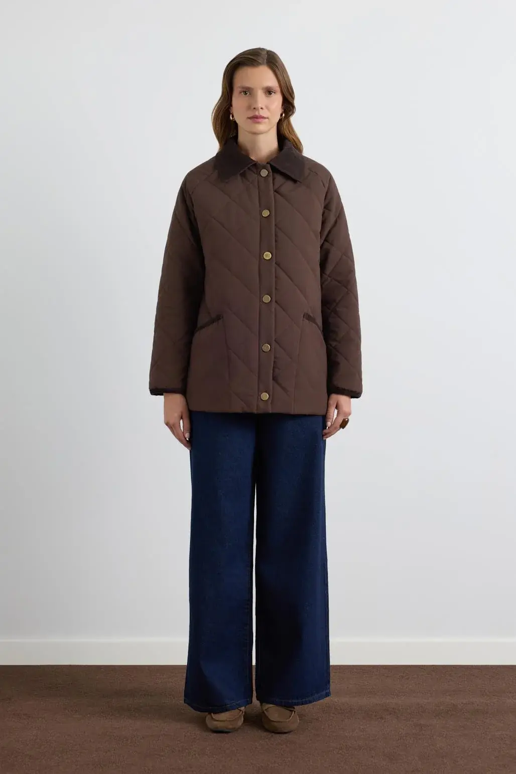 Kadife Yakalı Kapitone Ceket Mont Kahve, baklava desenli dolgusuyla şık ve işlevsel bir seçenek. PS ve pamuk karışımı kumaştan üretilen mont, kadife yaka ve biye detaylarıyla zarif bir görünüm sunuyor. Geniş cepleri günlük kullanımda pratiklik sağlarken, astarlı yapısı serin havalarda sıcak tutuyor. Düğmeli kapanışıyla klasik ve yalın bir tarza sahip.