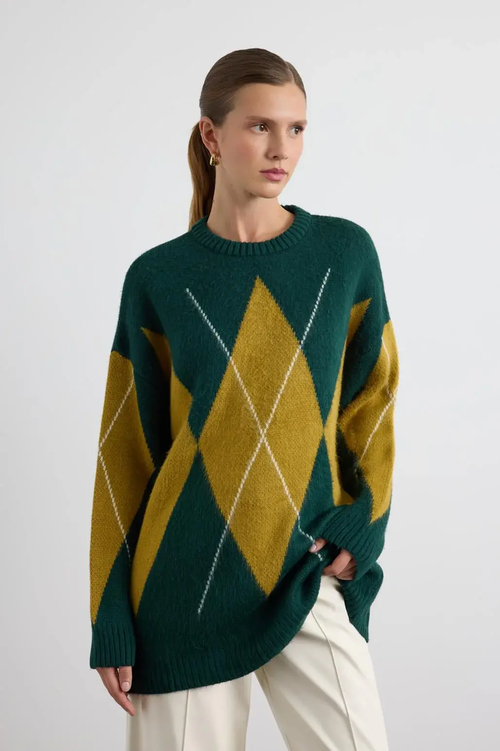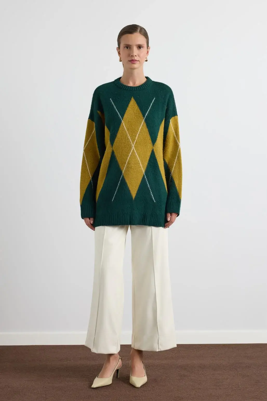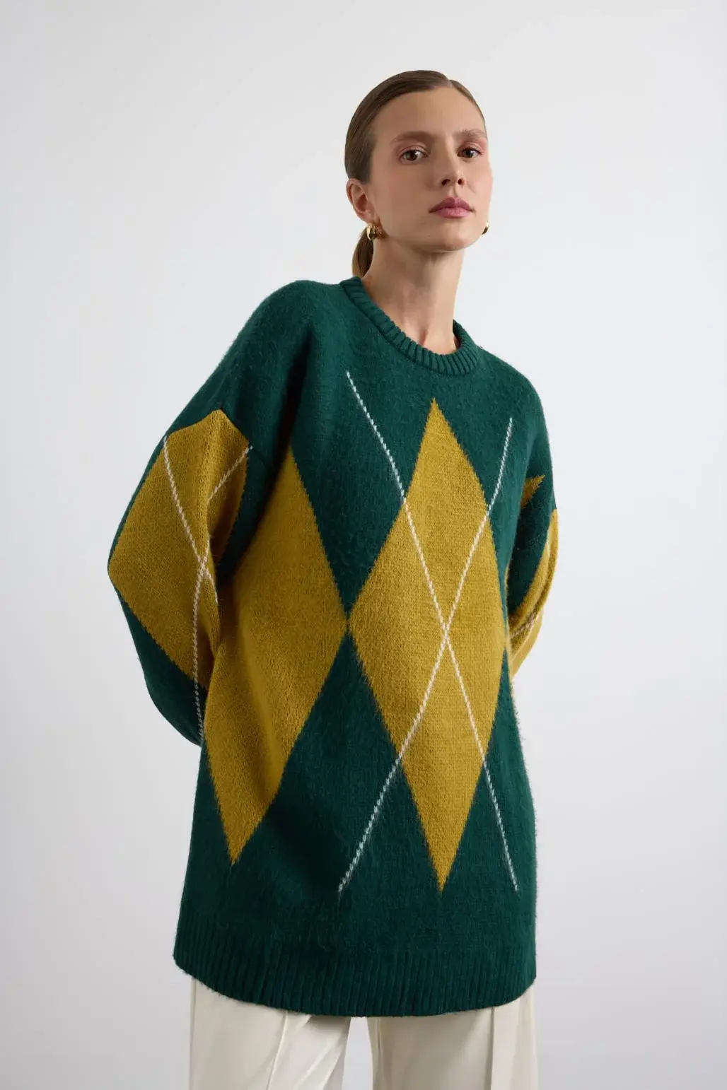 KADRİYE BAŞTÜRK BAKLAVA DESENLİ TRİKO KAZAK ACI YEŞİL