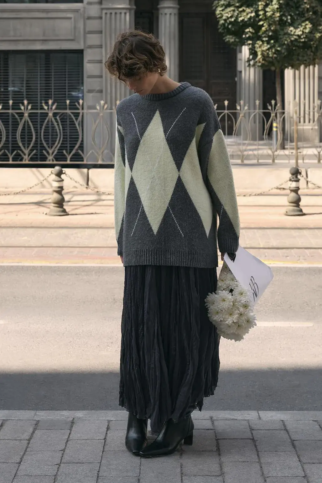 Baklava Desenli Triko Kazak Gri, sardonlu akrilik dokumasıyla yumuşak ve sıcak bir his sunar. Yaka, manşet ve etek ucundaki fitilli örgü detayları klasik ve şık bir görünüm yaratır. Baklava desen motifleriyle hareketlenen rahat kesimiyle günlük kombinlerinize ideal bir tamamlayıcıdır. Soğuk günlerde hem konfor hem şıklık sunan, dolabınızın favori kazaklarından biri olmaya adaydır.