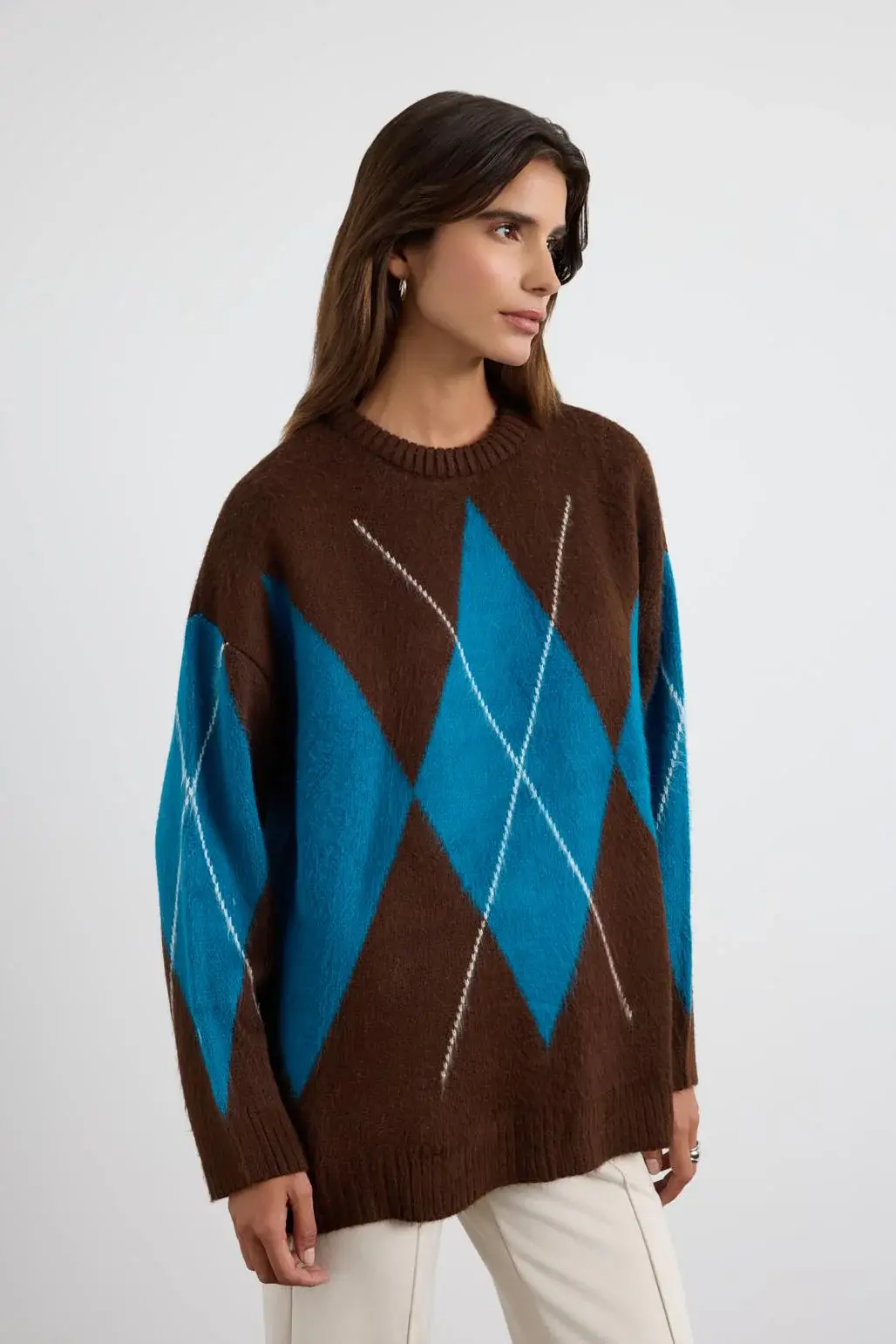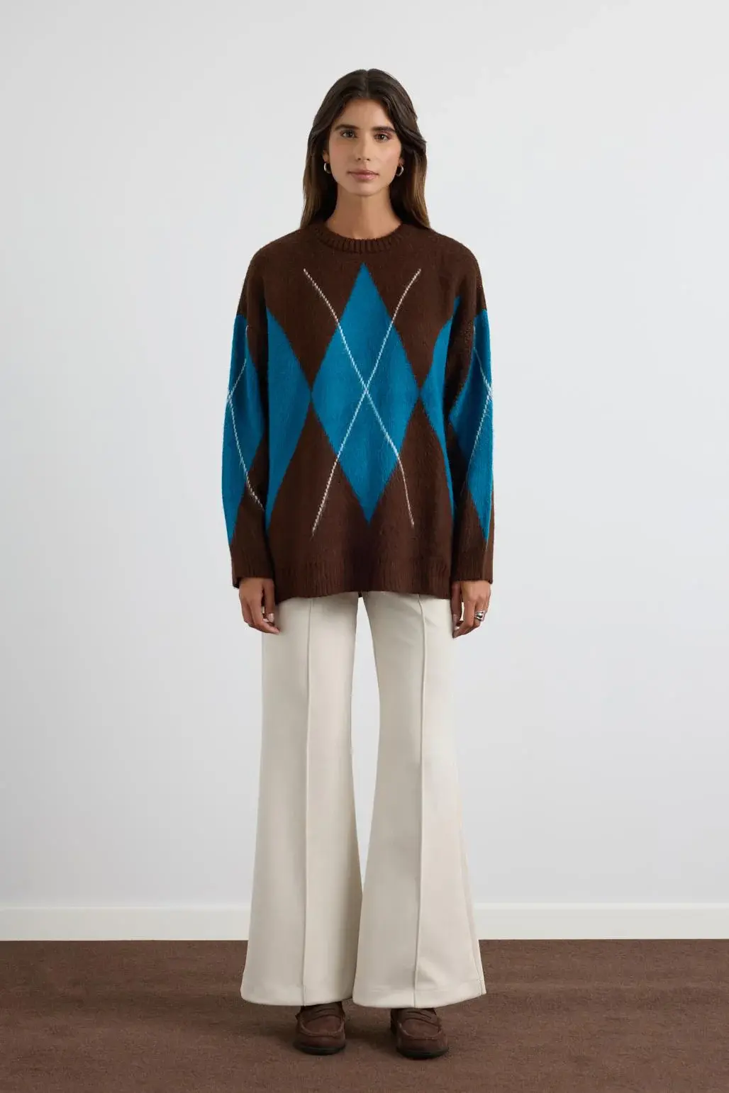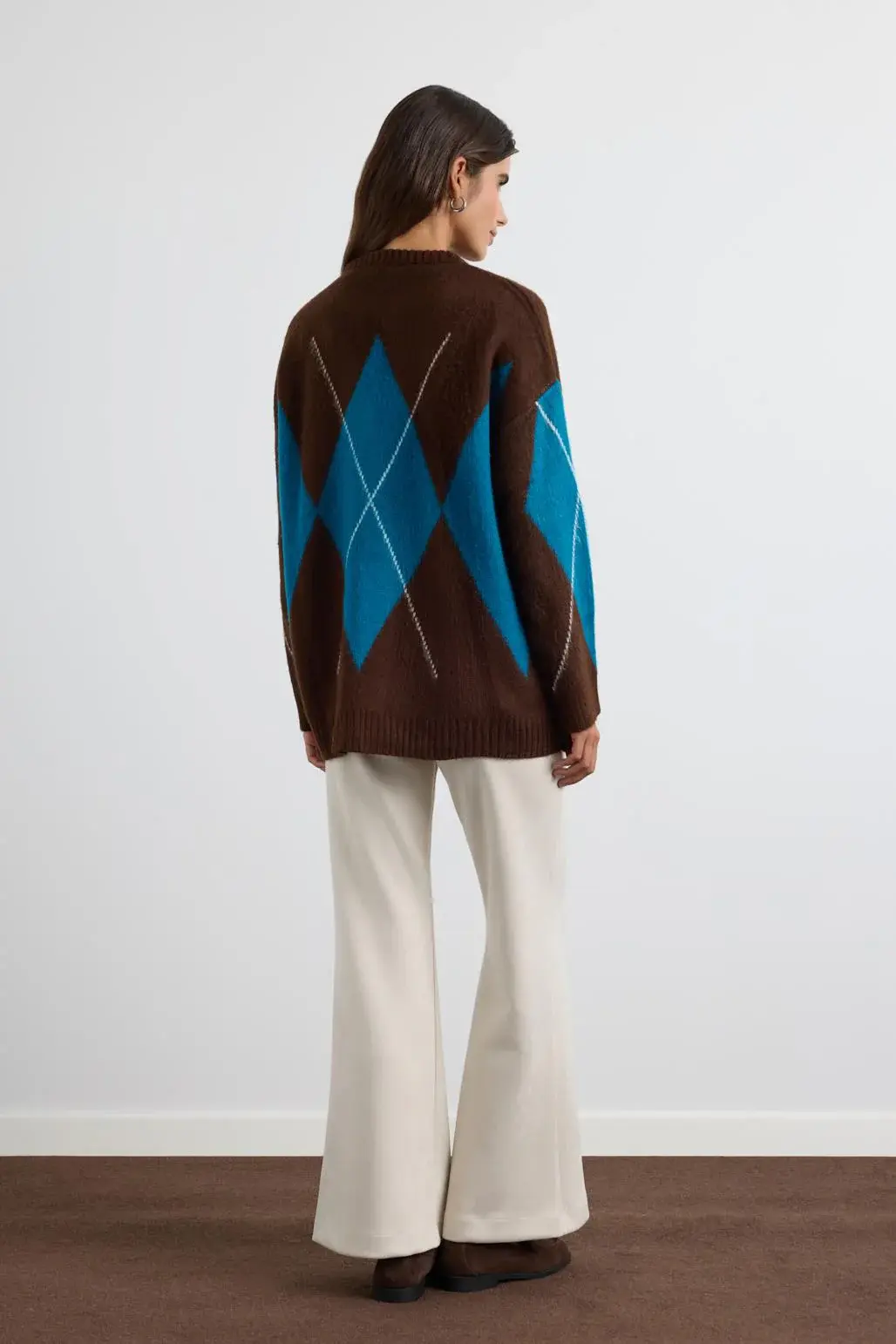 KADRİYE BAŞTÜRK BAKLAVA DESENLİ TRİKO KAZAK KAHVE