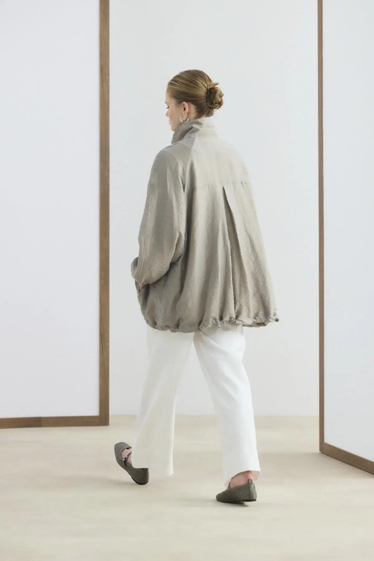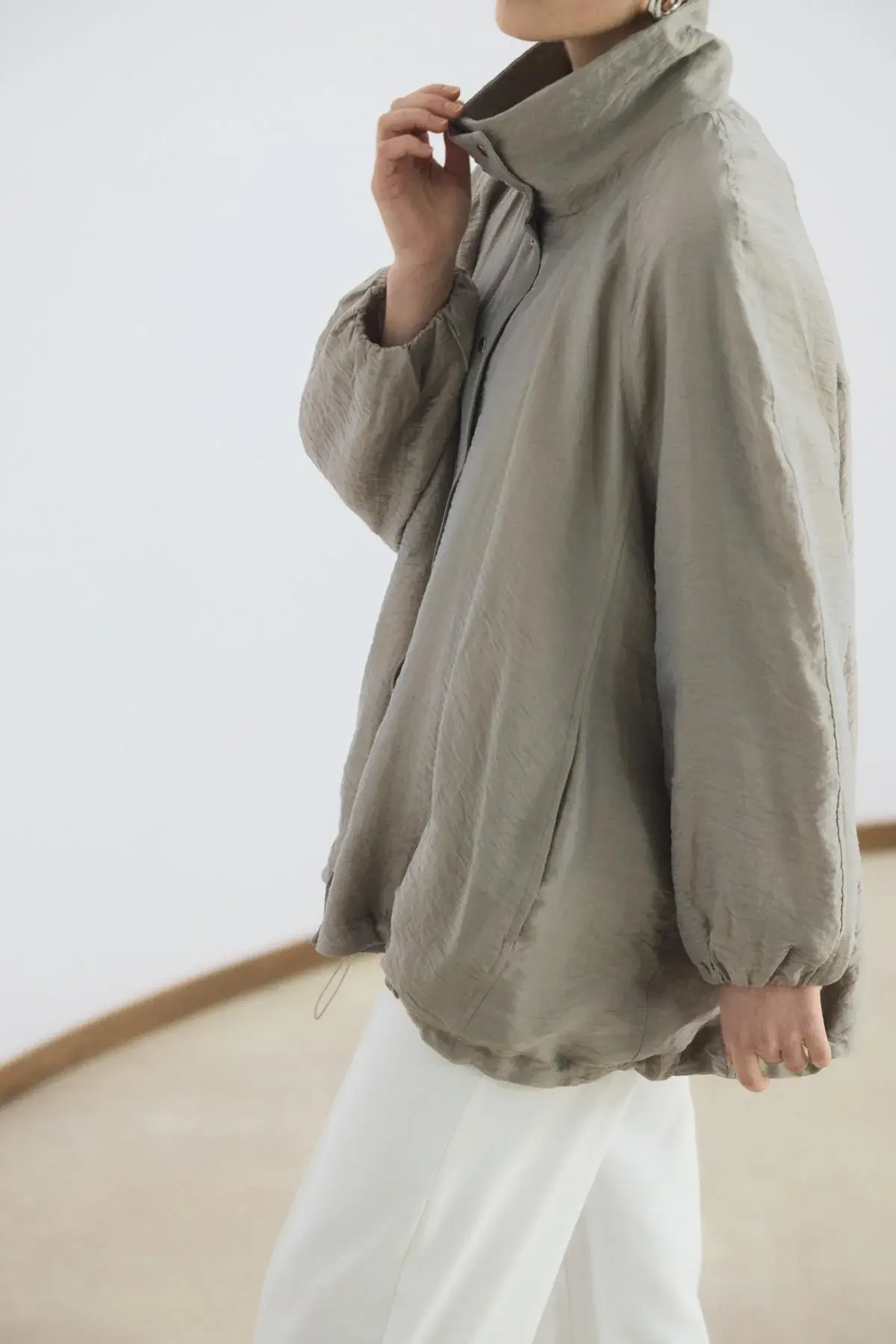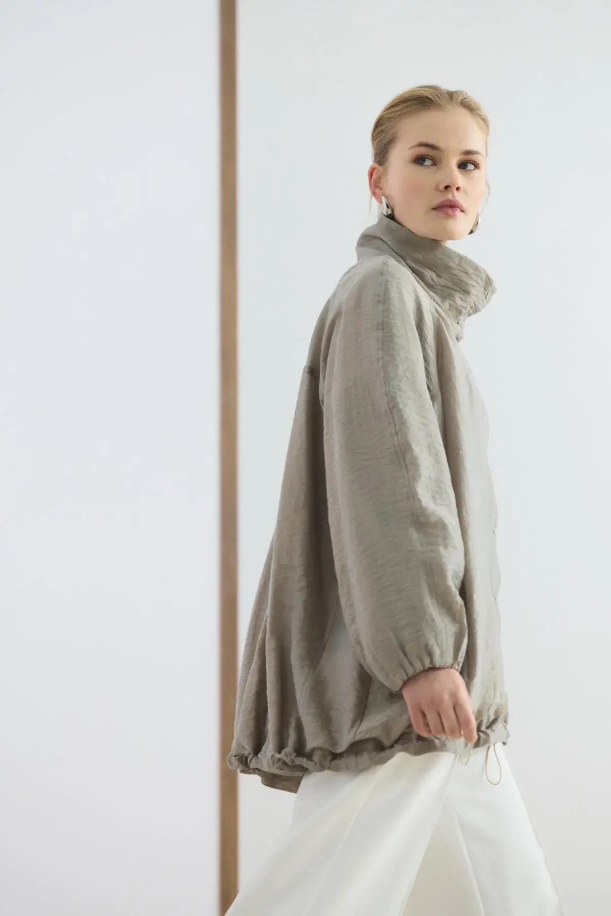 Dik Yaka Büzgülü Bomber Ceket Siyah, viskon karışımlı teknik kumaşının pürüzsüz dokusuyla üstünüzde hafif bir his bırakır. Dik yaka tasarımı, reglan balon kolları ve aşağıya doğru genişleyen evaze formu, alışılmış ceket tasarımlarına modern bir yorum katar. Çıtçıtlı kapaması, gizli metal fermuarı ve iç astarı ile kullanım kalitesini artırırken, yan cepleriyle günlük pratiklik sunar.