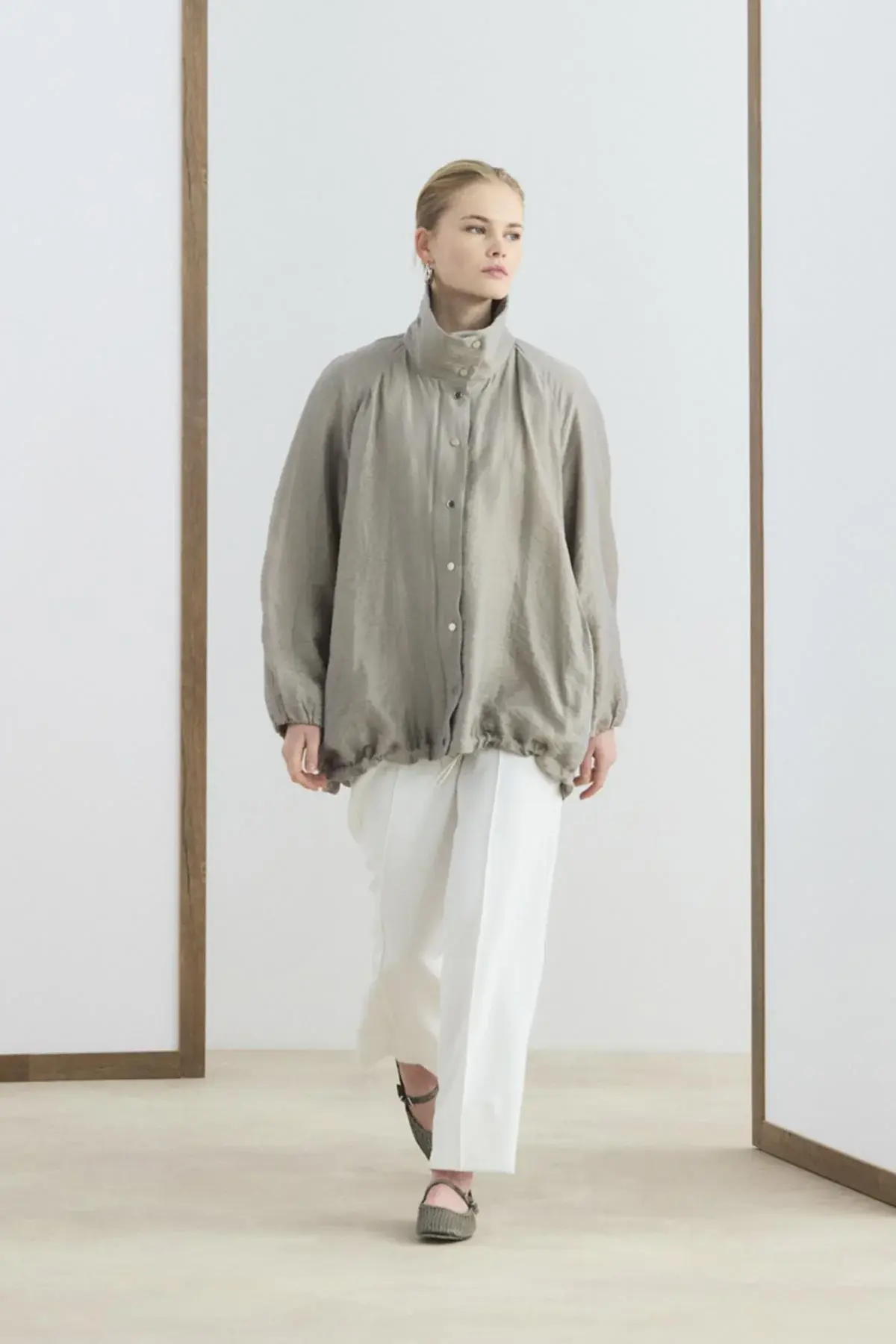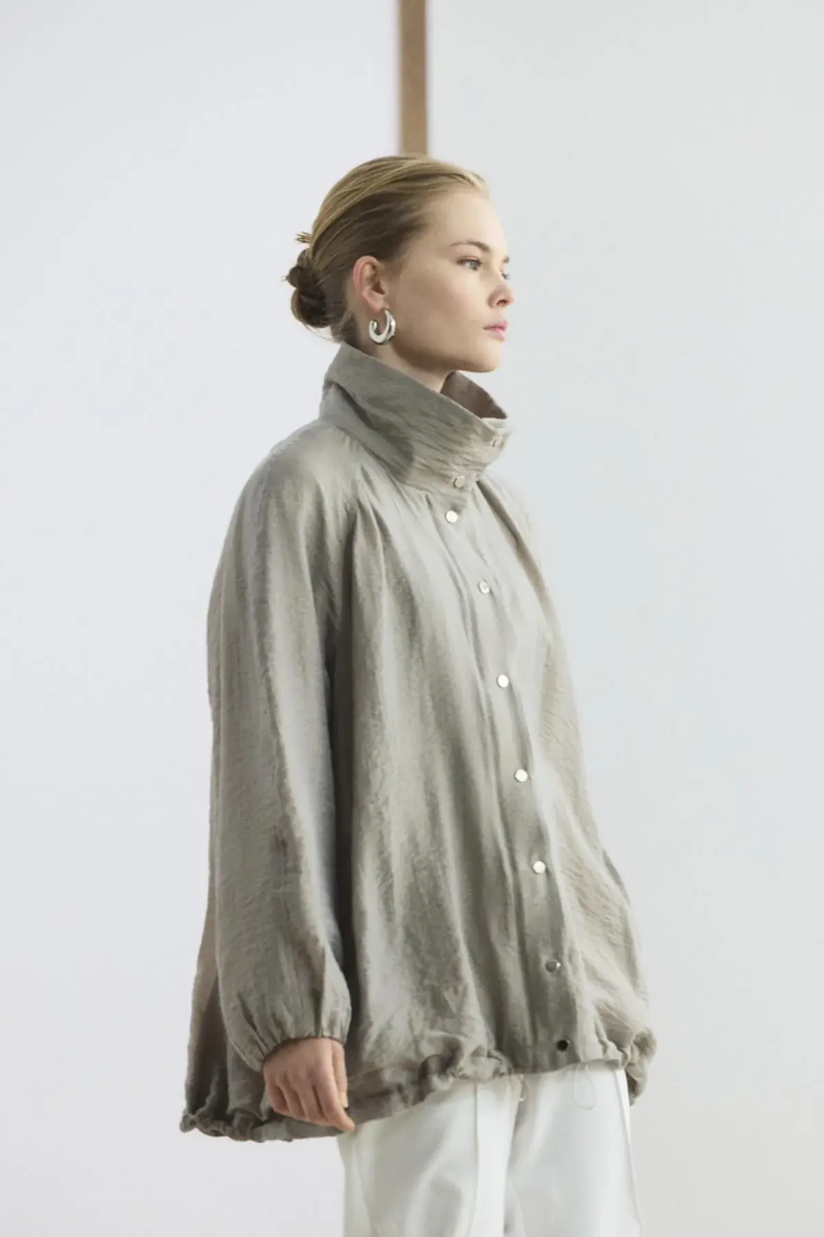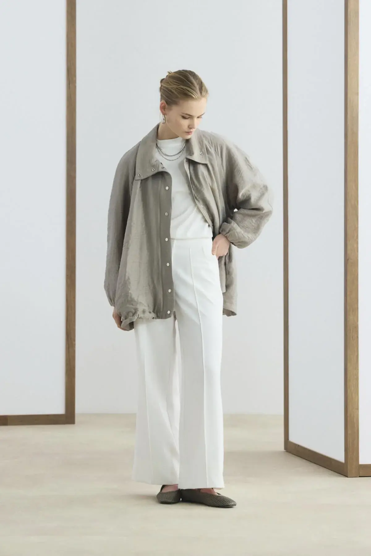Dik Yaka Büzgülü Bomber Ceket Siyah, viskon karışımlı teknik kumaşının pürüzsüz dokusuyla üstünüzde hafif bir his bırakır. Dik yaka tasarımı, reglan balon kolları ve aşağıya doğru genişleyen evaze formu, alışılmış ceket tasarımlarına modern bir yorum katar. Çıtçıtlı kapaması, gizli metal fermuarı ve iç astarı ile kullanım kalitesini artırırken, yan cepleriyle günlük pratiklik sunar.