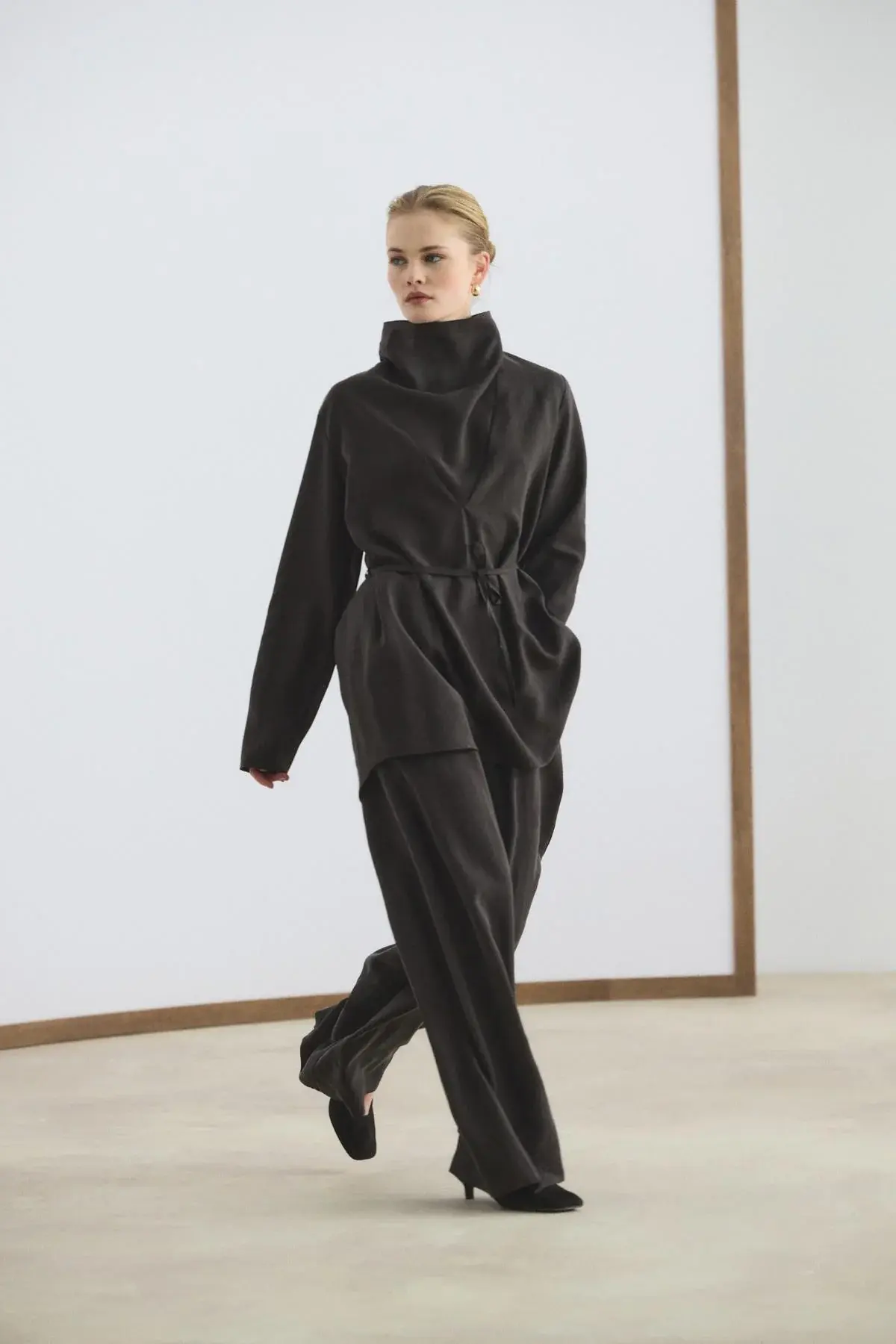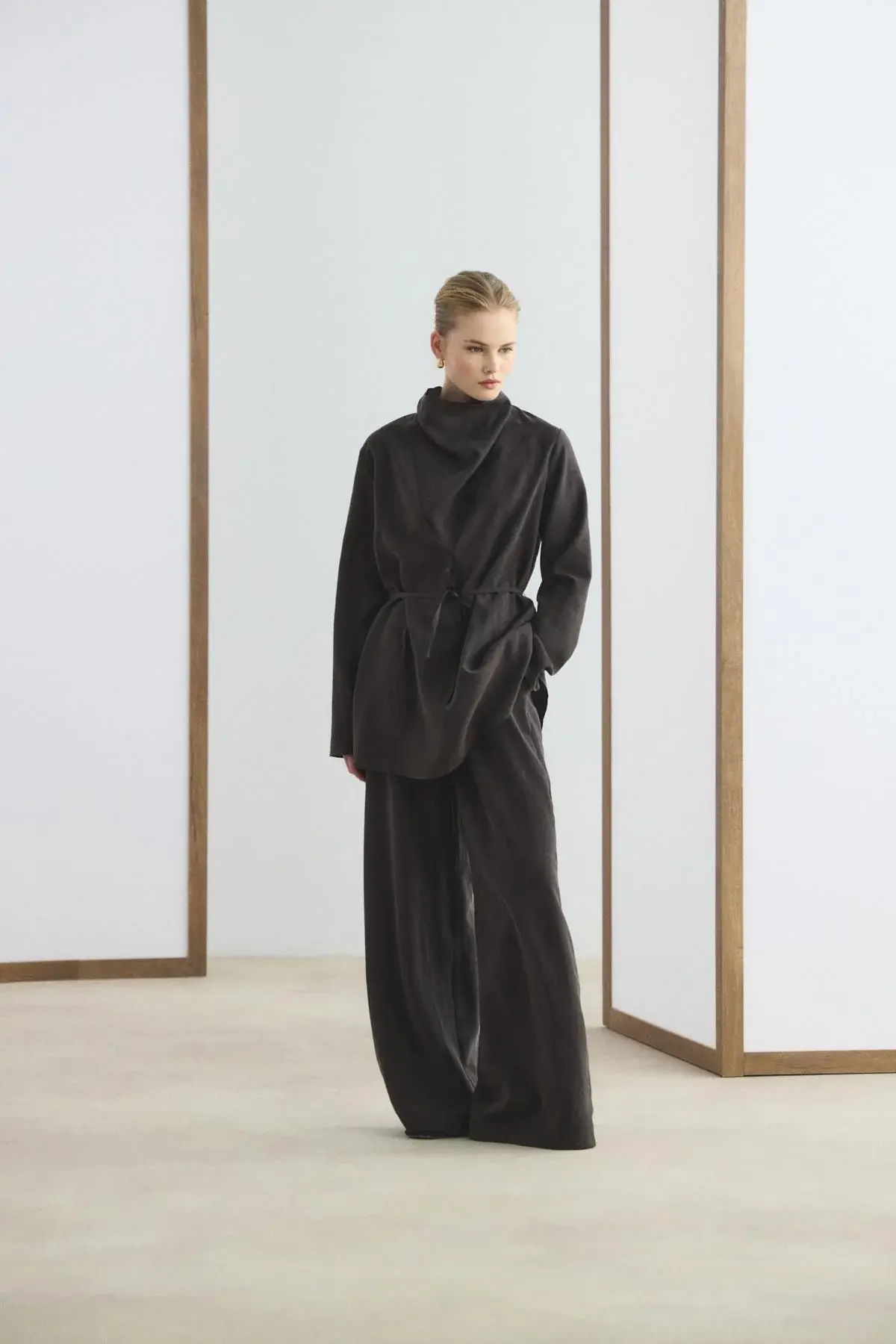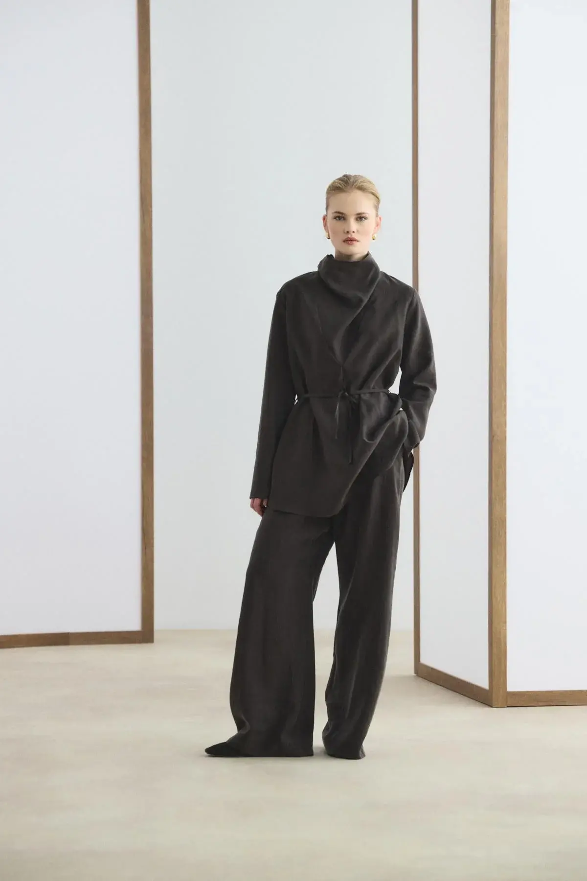 Drape Yaka Tensel Tunik Pantolon Takım Acı Kahve, tencel karışımlı kumaşının dökümlü yapısı ve nefes alan dokusuyla gün boyu ferah bir kullanım sunar. Modern drape yaka tasarımı ve düşük omuz kesimi, takıma şık bir duruş kazandırırken biye kemer detayı bel hattını zarifçe vurgular. Bol paça pantolonu, tam tur lastikli beli ve cepli yapısıyla konforlu bir hareket özgürlüğü sağlar.