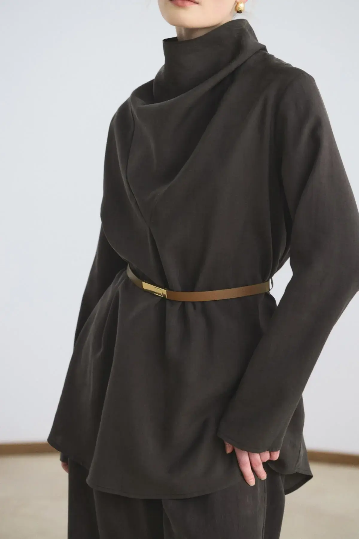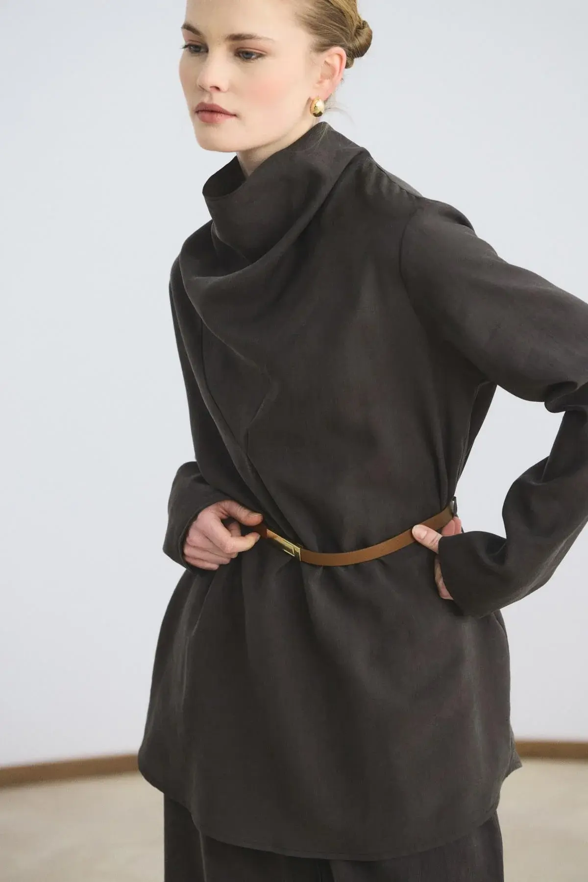 KADRİYE BAŞTÜRK DRAPE YAKA TENSEL TUNİK PANTOLON TAKIM ACI KAHVE