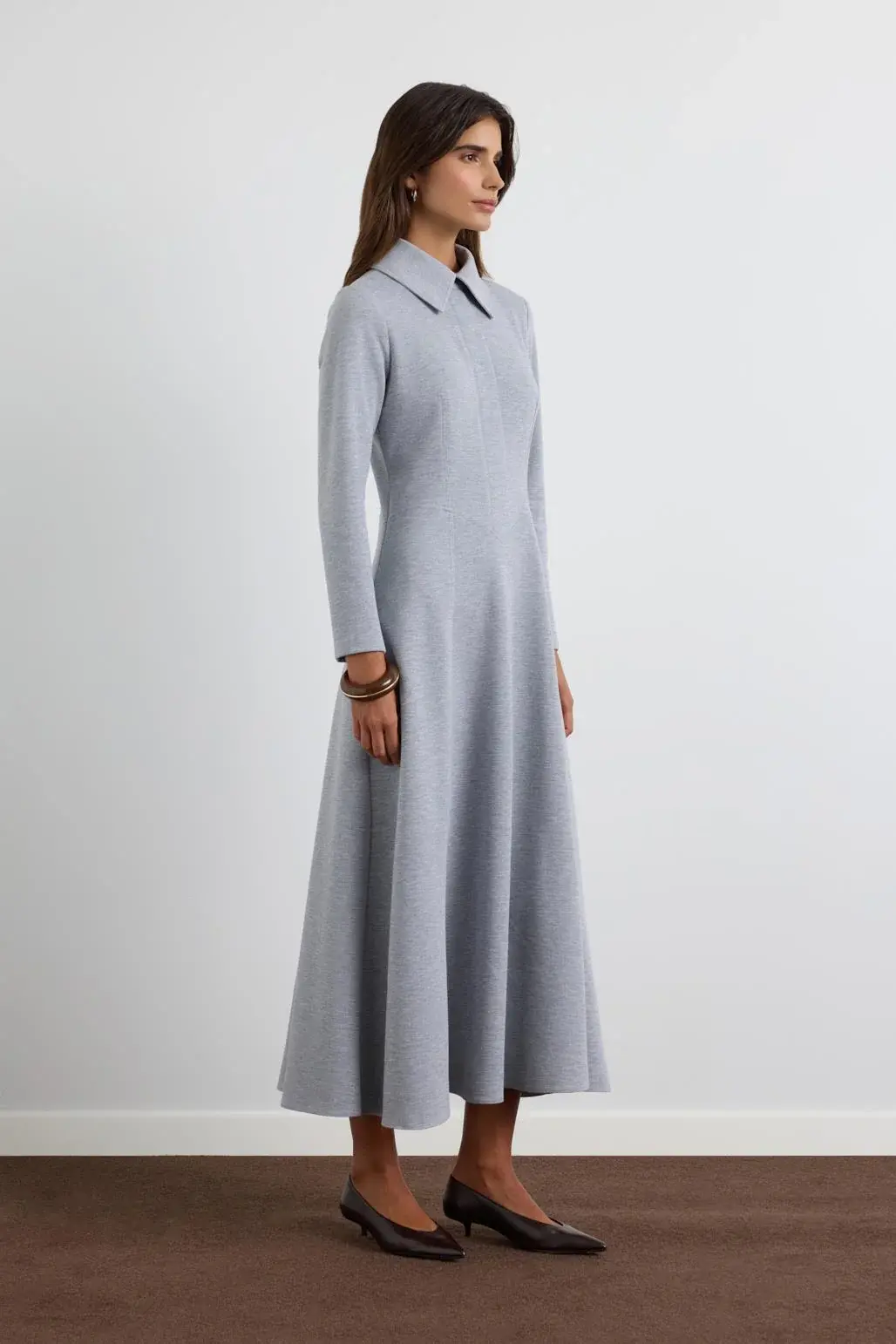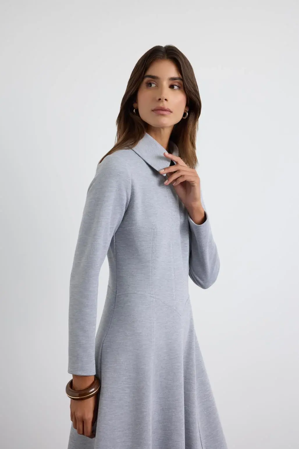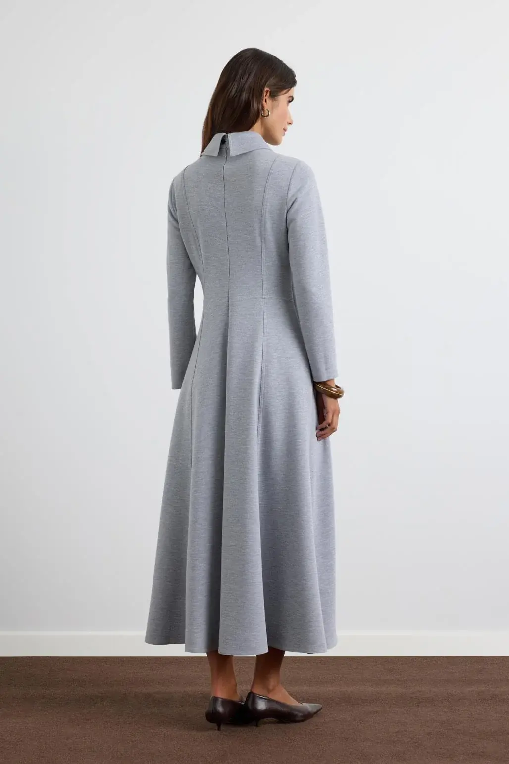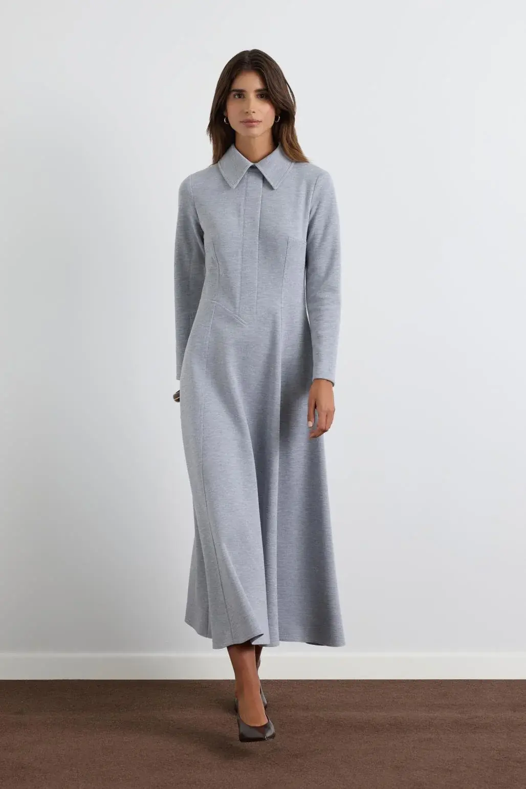 Geniş Yakalı Örme Elbise Gri, çift yüzlü pamuk kumaştan yapılmış; geniş yakası ve zarif süs pat detayıyla görünümünüze sade ama dikkat çekici bir hava katıyor. Uzun kloş kesimi, özgürce hareket etmenizi sağlarken, arka fermuarı sayesinde giyip çıkarmak da son derece pratik.