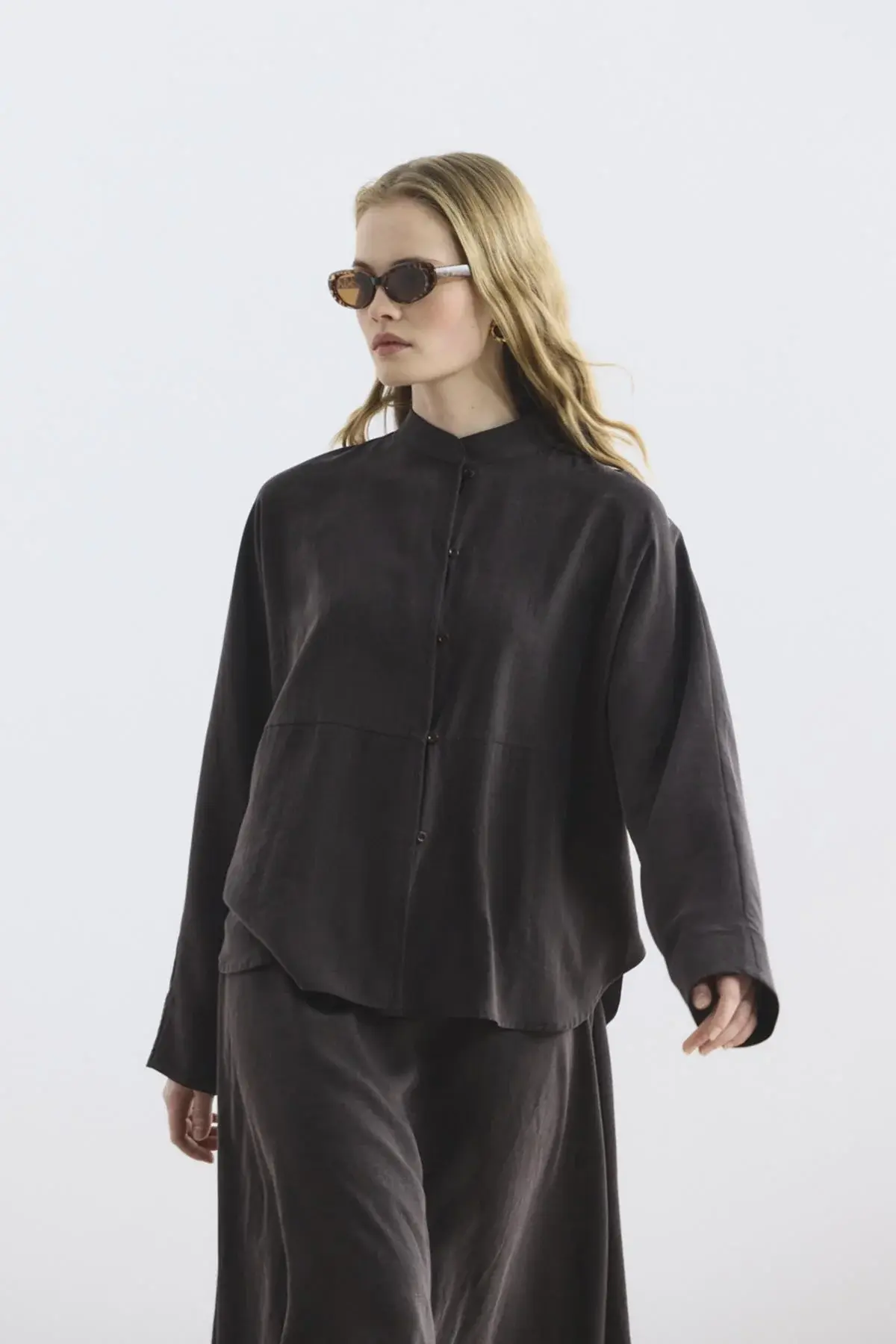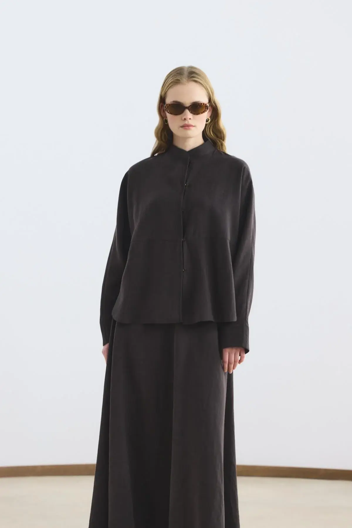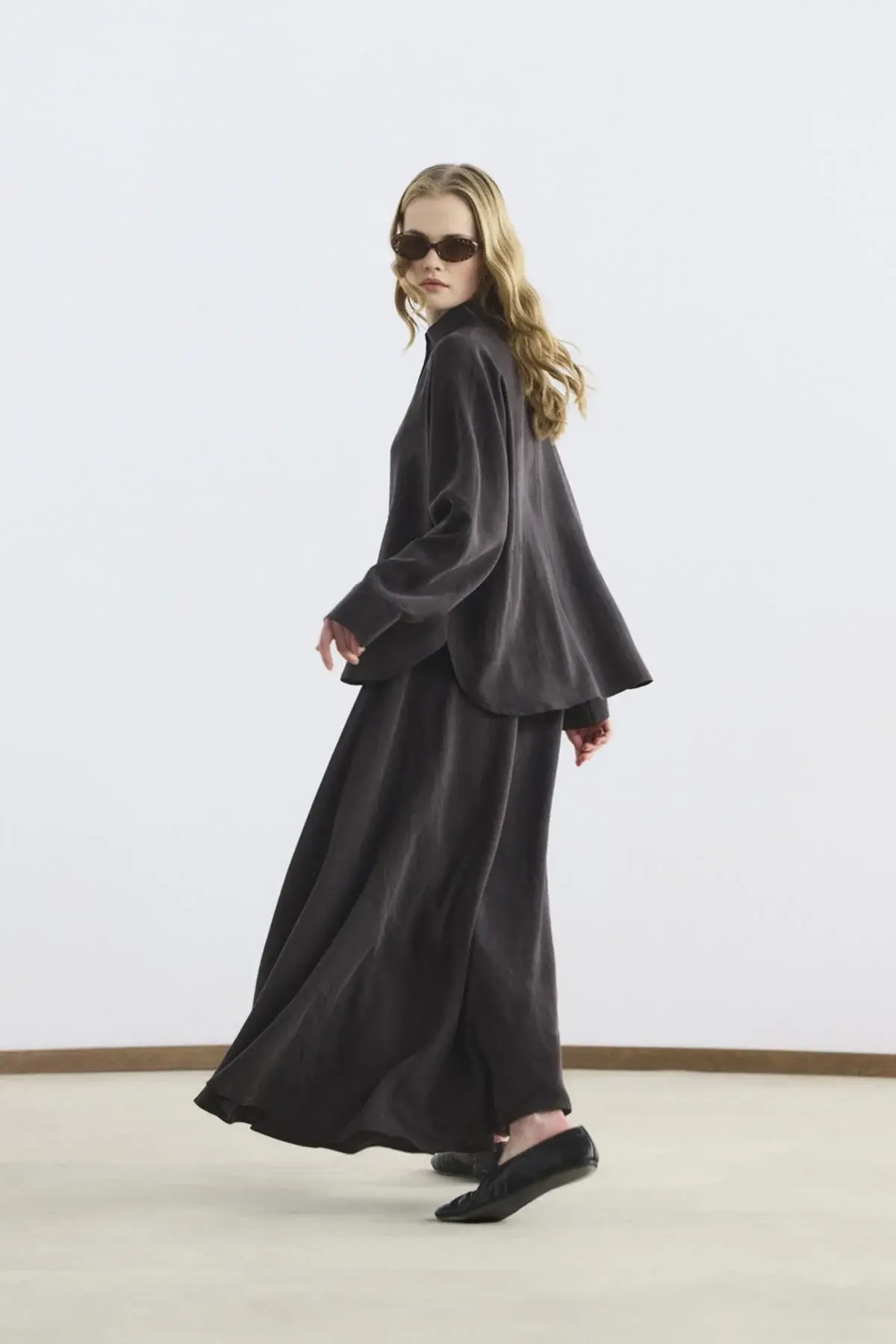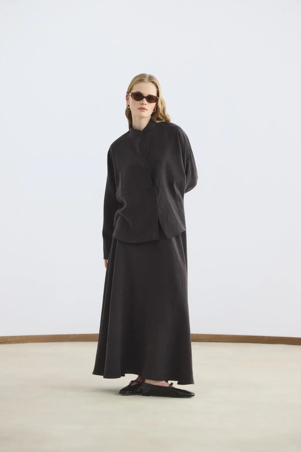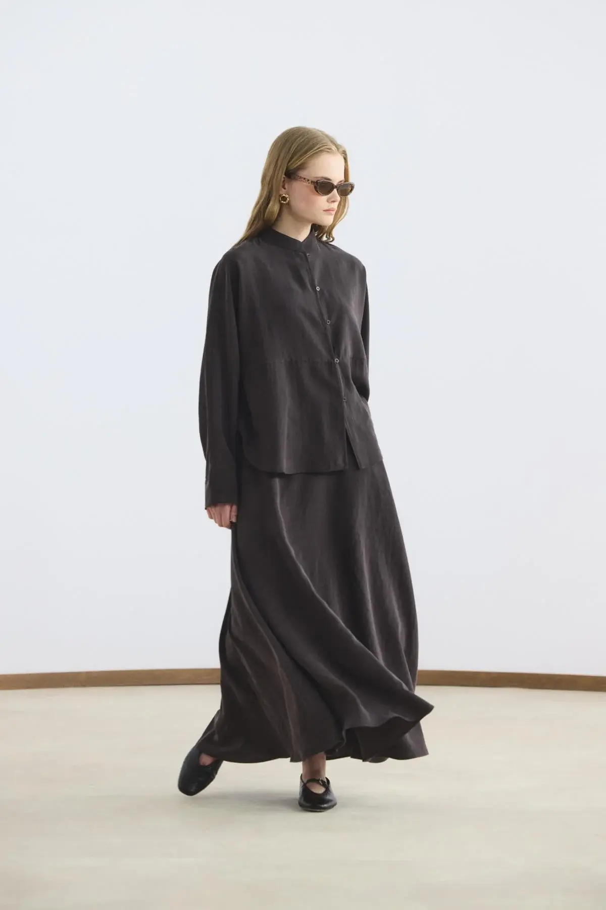 Hakim Yaka Tensel Gömlek Etek Takım Açık Gri, tencel karışımlı kumaşının dökümlü yapısı ve yumuşak dokusuyla gün boyu konforlu bir kullanım sunar. Hakim yaka tasarımı, gizli pat ve brit düğme detaylarıyla birleşerek takıma modern bir duruş kazandırırken, yarasa kol kesimi ve önü kesikli tunik tasarımı hareket özgürlüğü sağlar. Yüksek bel kloş eteği, kemer detayı ve yandan gizli fermuarı ile zarif bir silüet oluşturur.