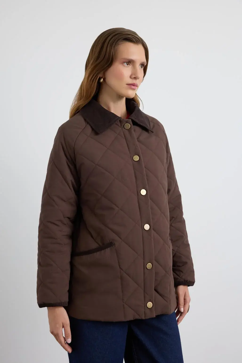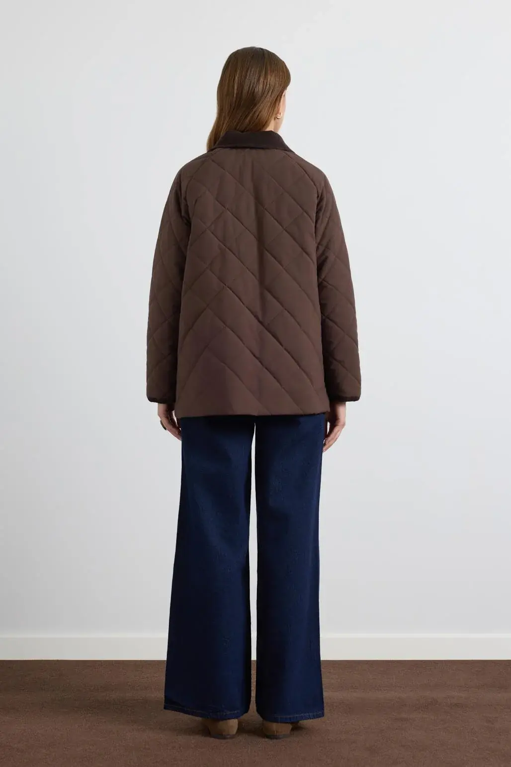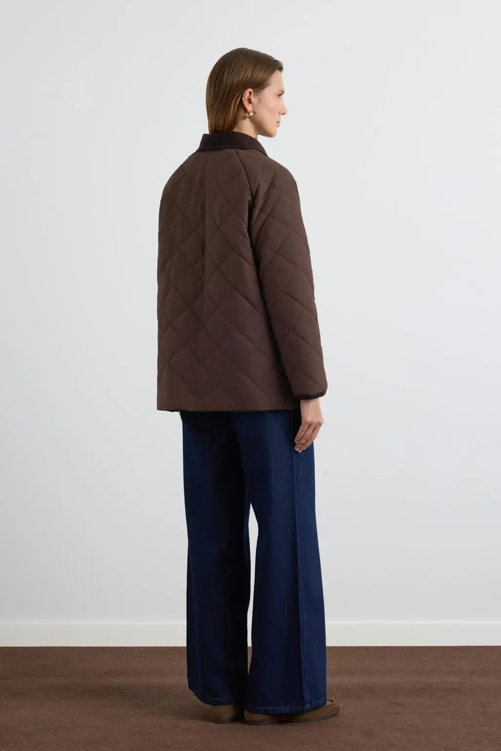 Kadife Yakalı Kapitone Ceket Mont Kahve, baklava desenli dolgusuyla şık ve işlevsel bir seçenek. PS ve pamuk karışımı kumaştan üretilen mont, kadife yaka ve biye detaylarıyla zarif bir görünüm sunuyor. Geniş cepleri günlük kullanımda pratiklik sağlarken, astarlı yapısı serin havalarda sıcak tutuyor. Düğmeli kapanışıyla klasik ve yalın bir tarza sahip.