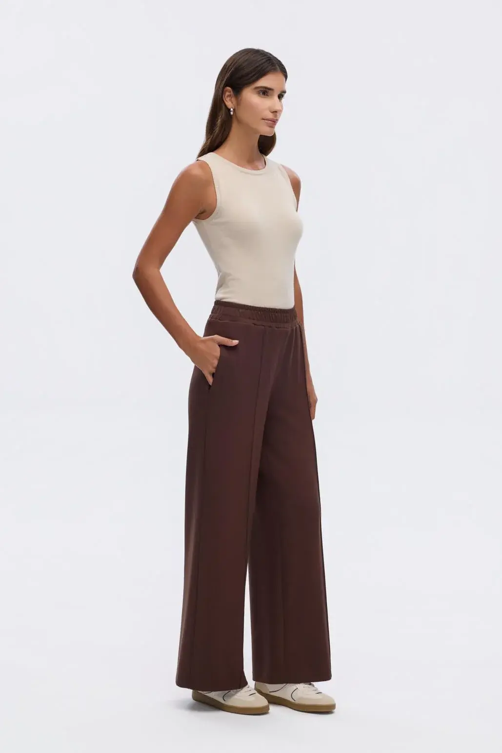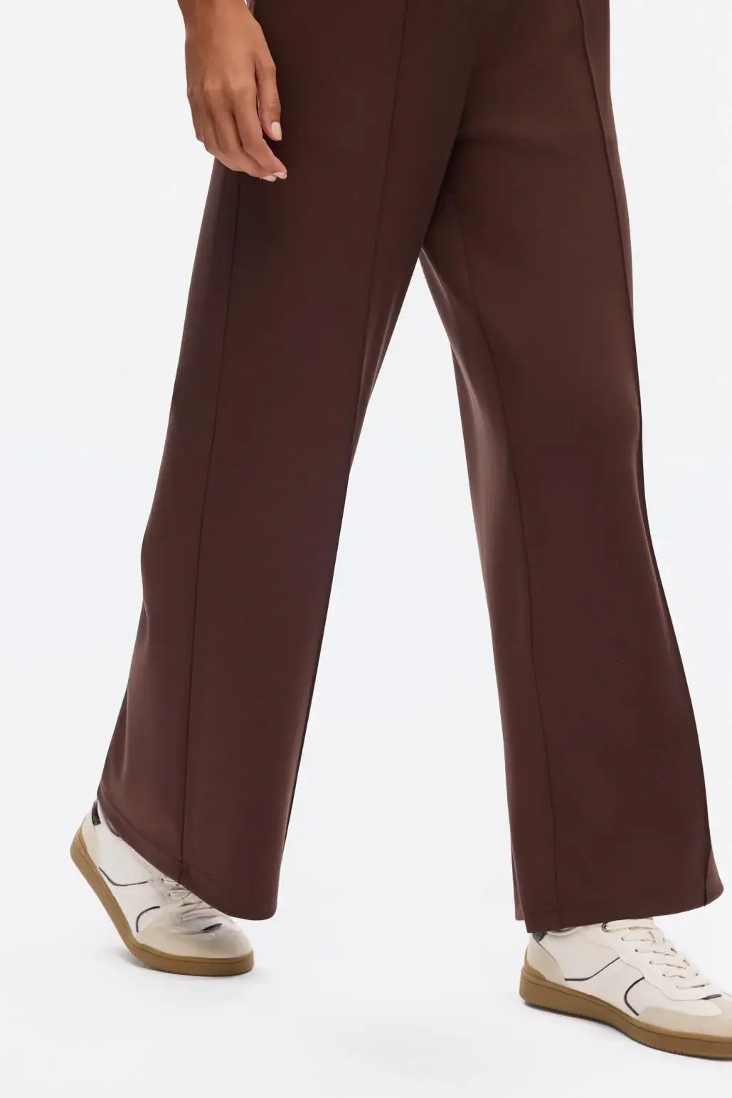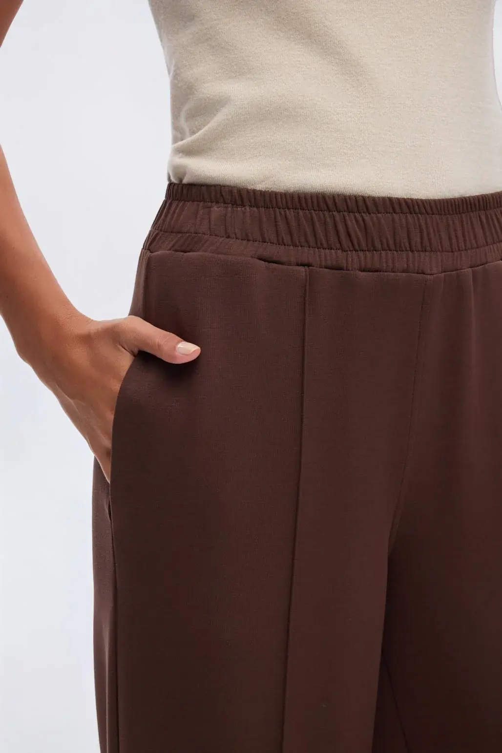 Modal Örme Bol Kesim Pantolon Kahve, esnek ve yumuşak dokulu kumaşı sayesinde rahat ve konforlu olmanızı sağlar. Yüksek bel ve önden dikiş detayı ile fit, toparlayıcı bir görünüm vadeder.