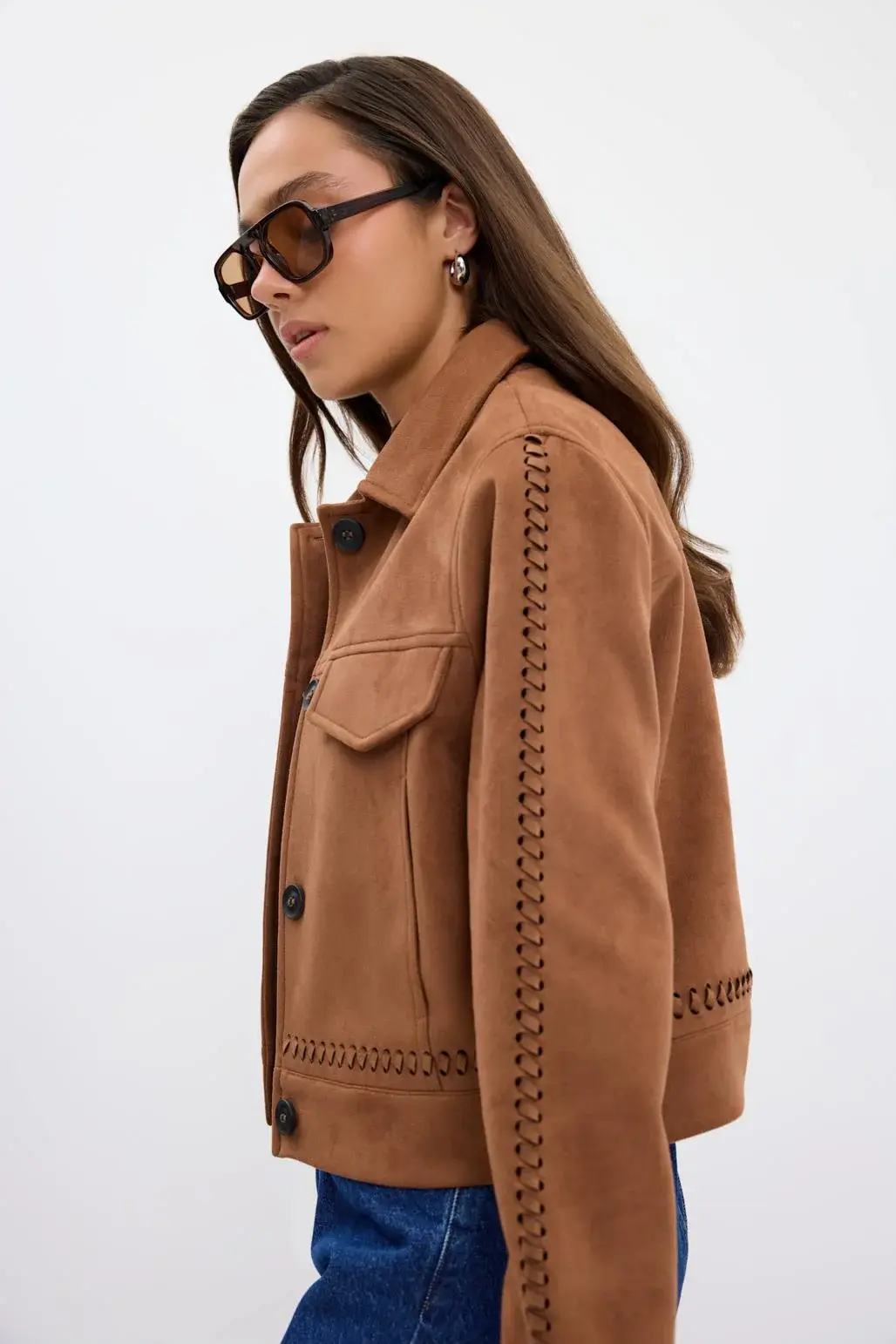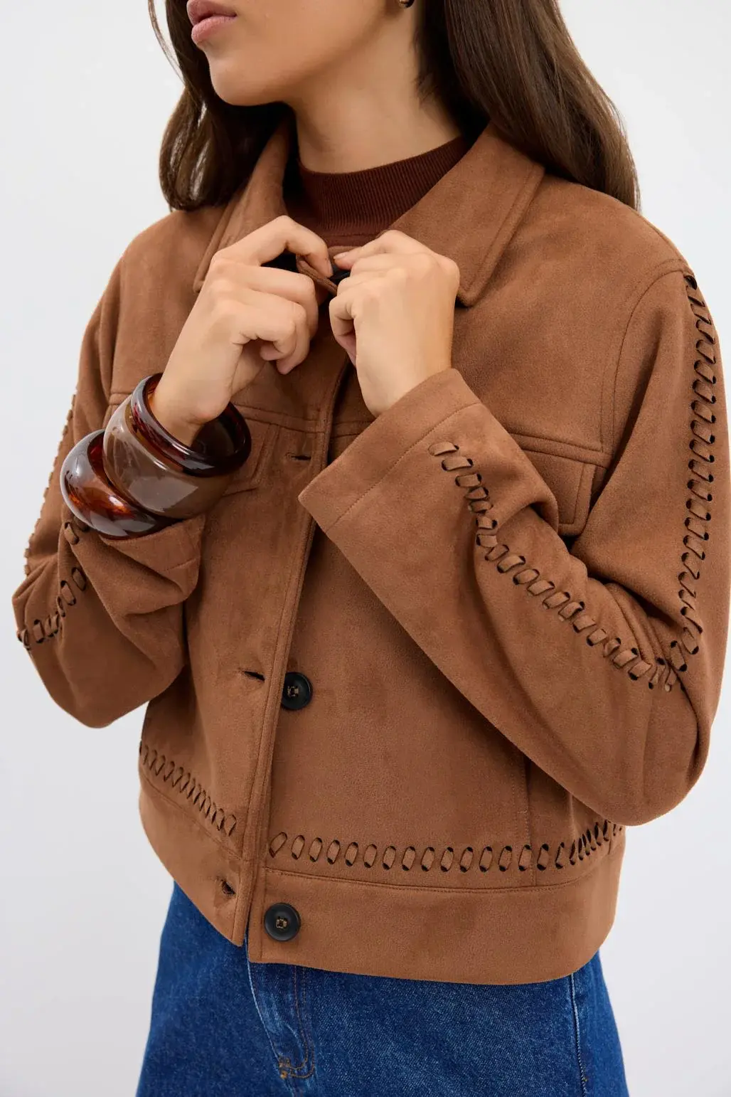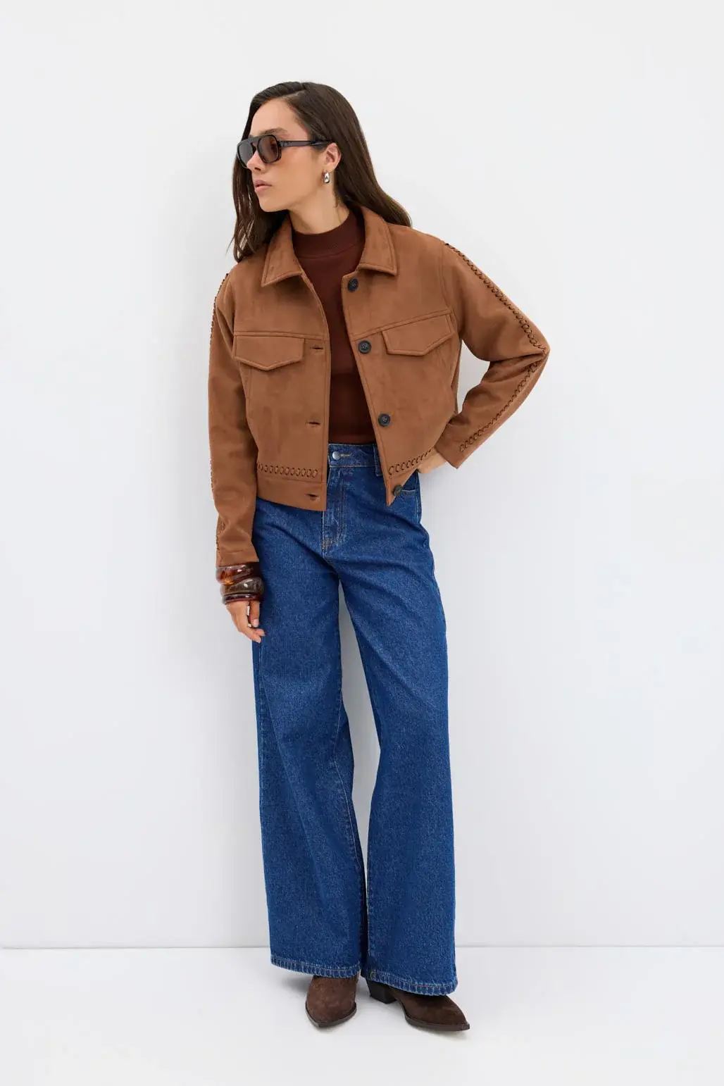 KADRİYE BAŞTÜRK ÖRGÜ DETAYLI CEPLİ KISA SÜET CEKET TABA