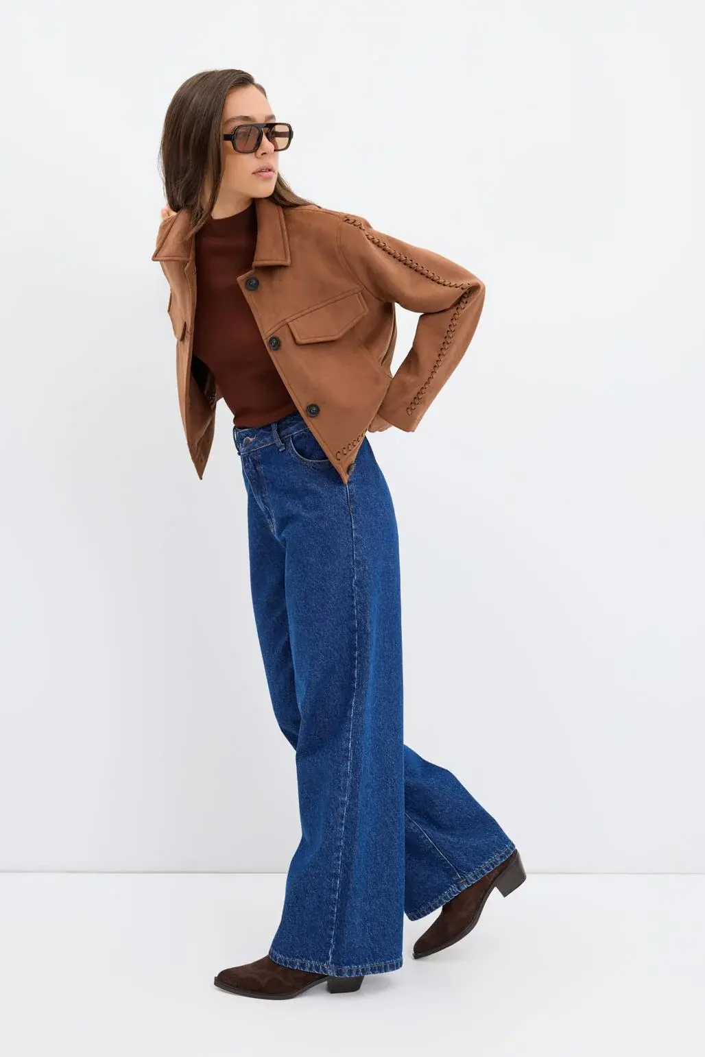 Örgü Detaylı Cepli Kısa Süet Ceket Taba, süet görünümlü kumaşıyla yumuşak bir doku sunarken, klasik yakası ve kısa formuyla zamansız bir görünüm sağlar. Lazer kesim örgü detayları tasarıma hareket katarken, ön kısmındaki süs kapaklı cepler ve yandan işlevsel cepler hem şıklık hem de pratiklik sunar. Kendinden astarlı yapısıyla ekstra katman gerektirmeden konfor sağlar.