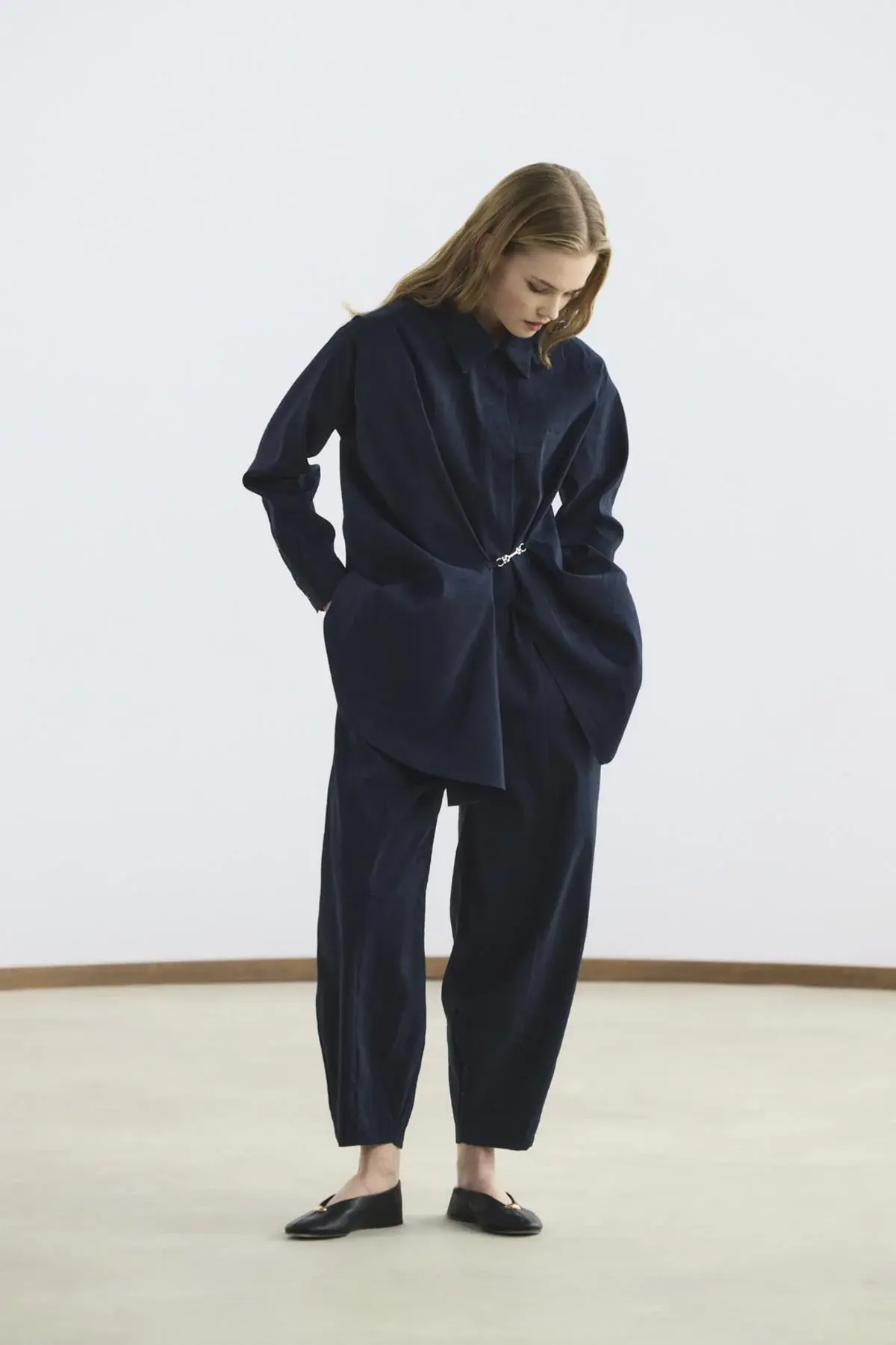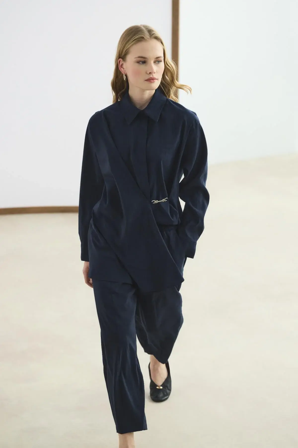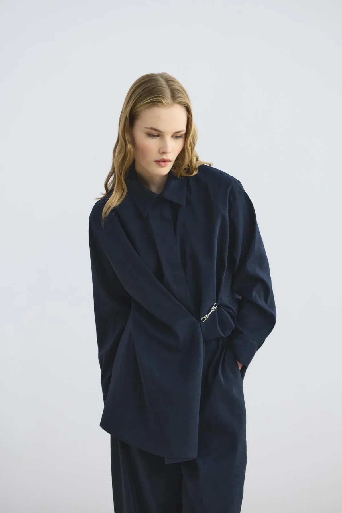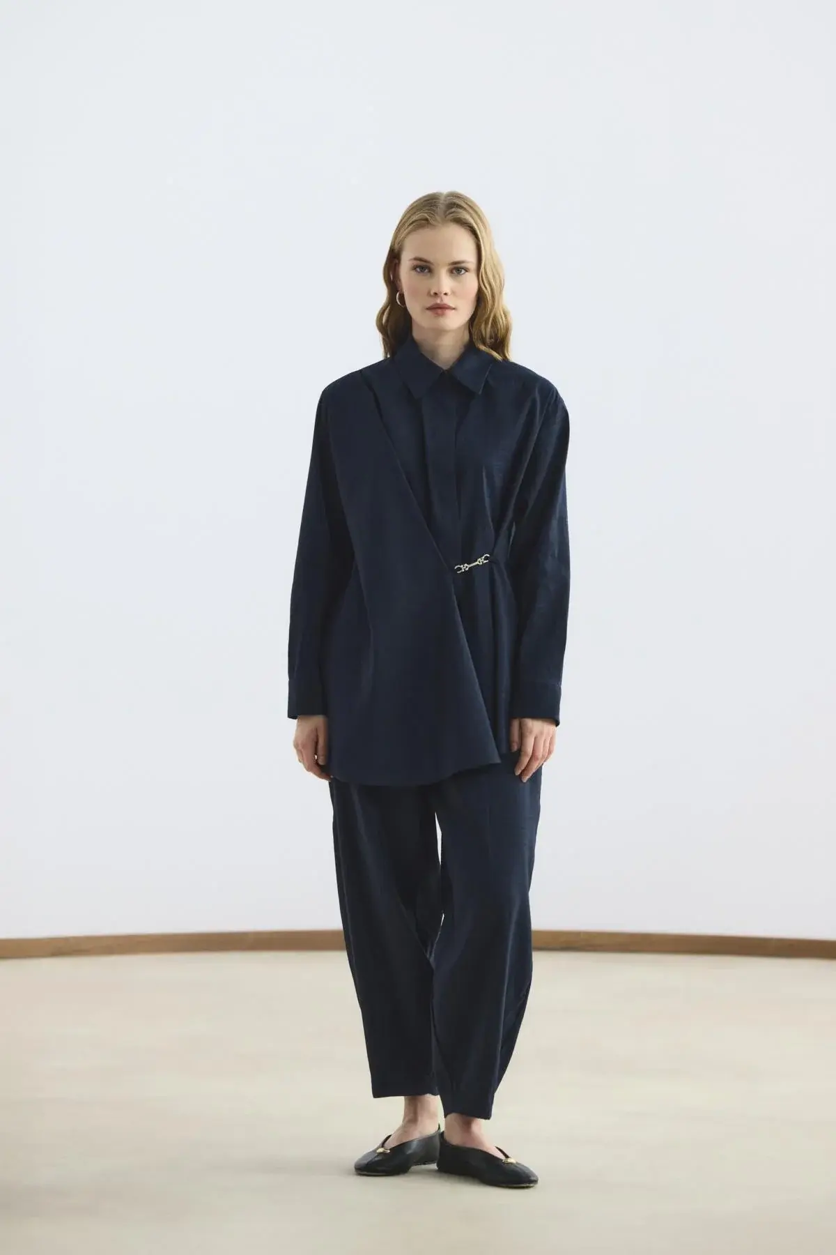 Toka Detaylı Anvelop Gömlek Pantolon Takım Lacivert, dökümlü kumaşının zarif düşüşüyle hoş bir görünüm oluşturur. Gömlek yaka tasarımını taçlandıran metalik parça detaylı tokası ve düğmeli manşetleri, takıma rafine bir hava verirken; yüksek bel, tam tur lastikli pantolonu hareketlerinize uyum sağlar. Önü düğme kapamalı anvelop kesimi, hem klasik hem de modern bir şıklığı aynı anda sunar.