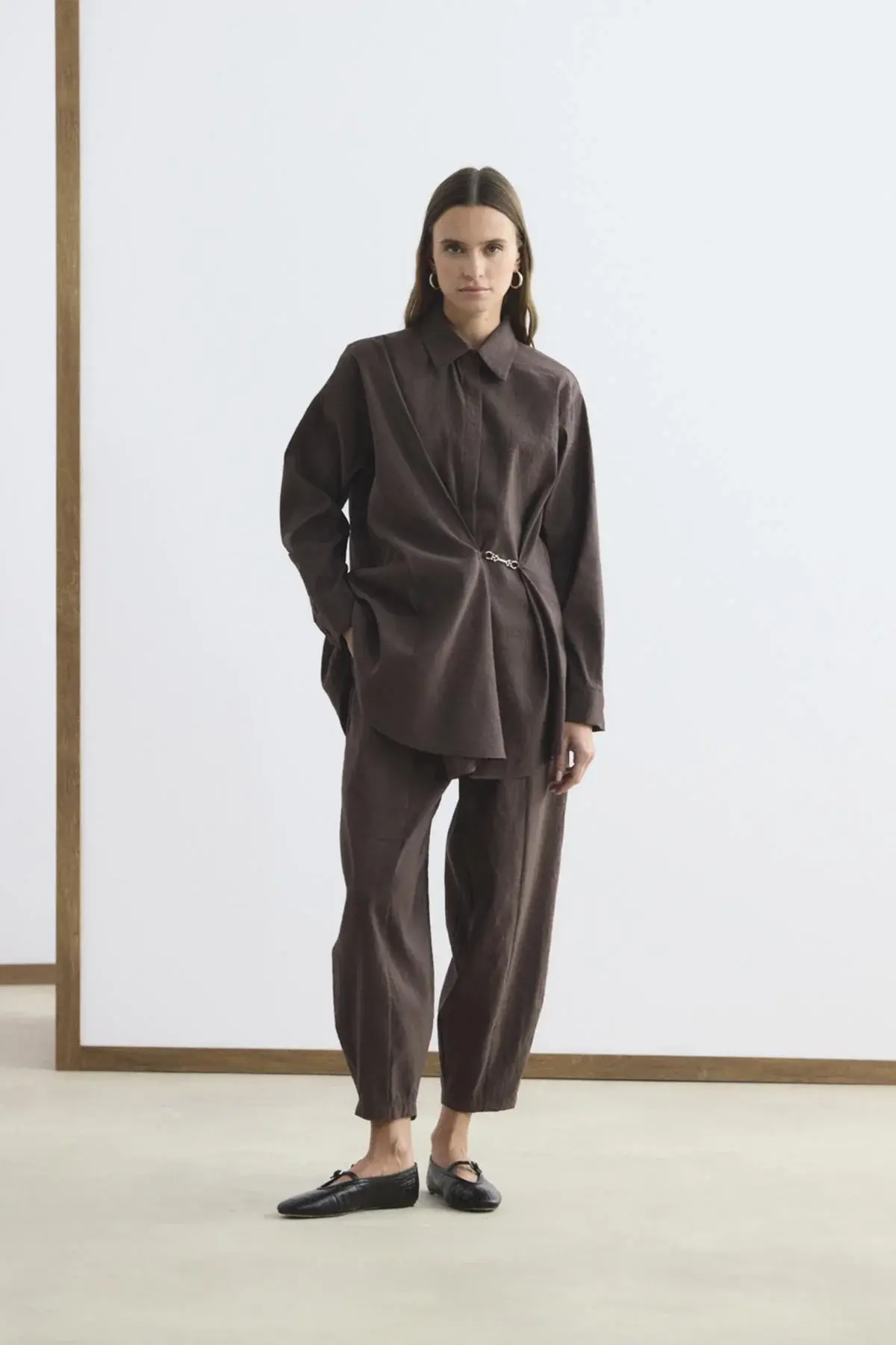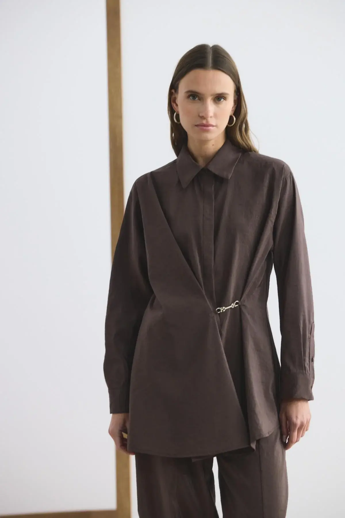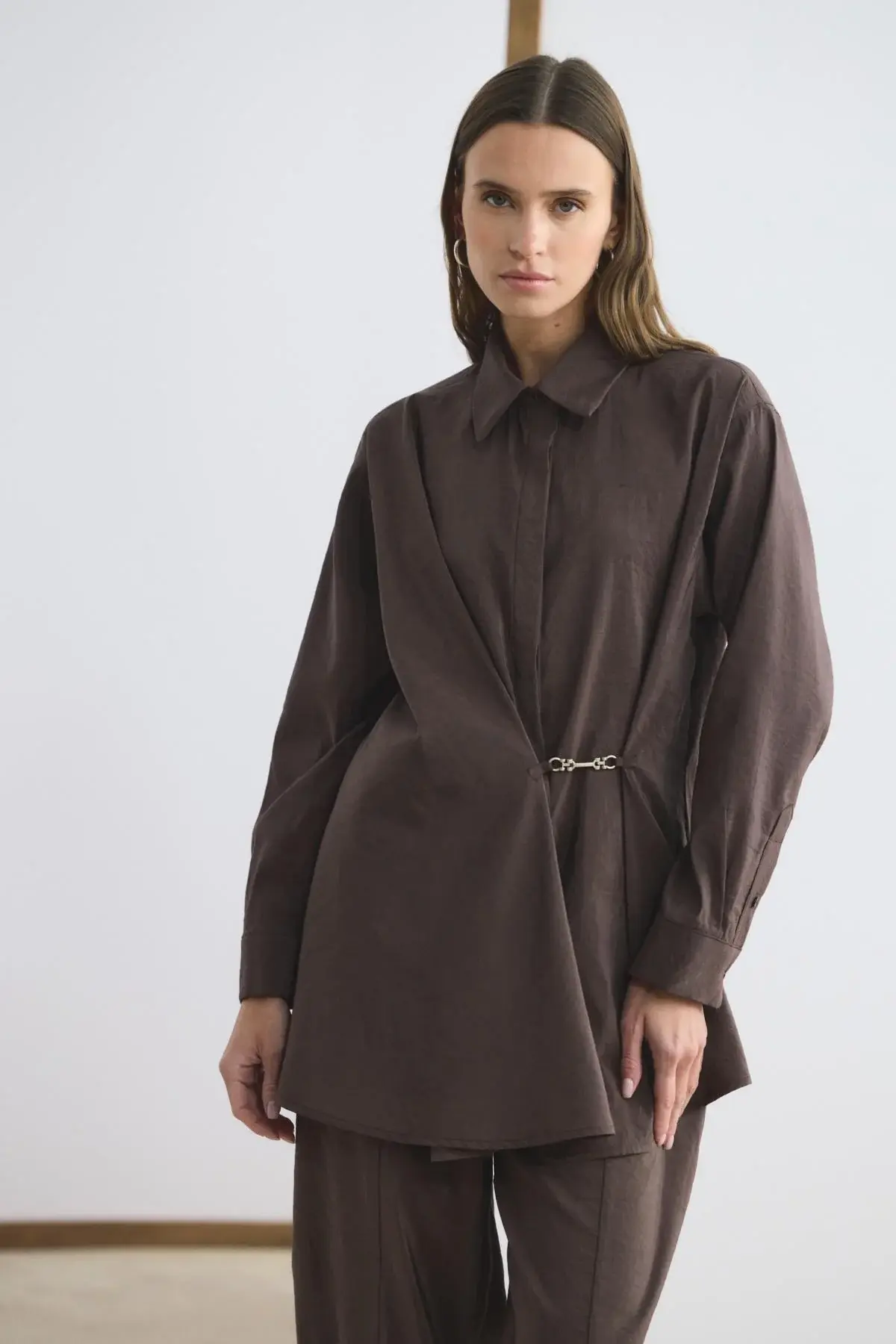 KADRİYE BAŞTÜRK TOKA DETAYLI ANVELOP GÖMLEK PANTOLON TAKIM KAHVERENGİ