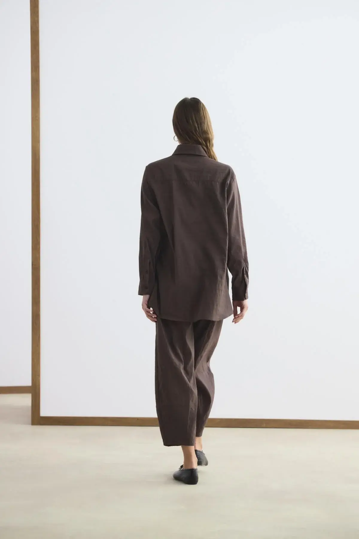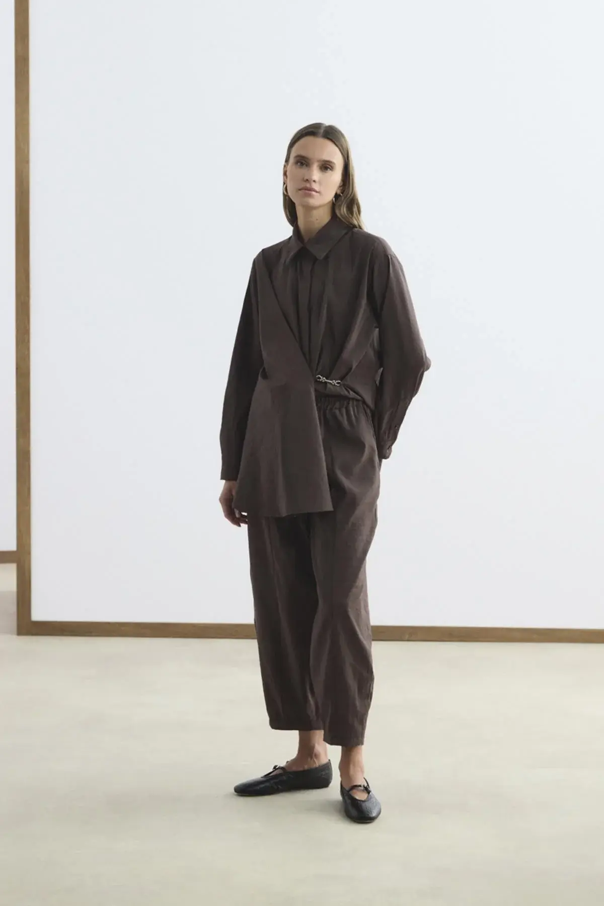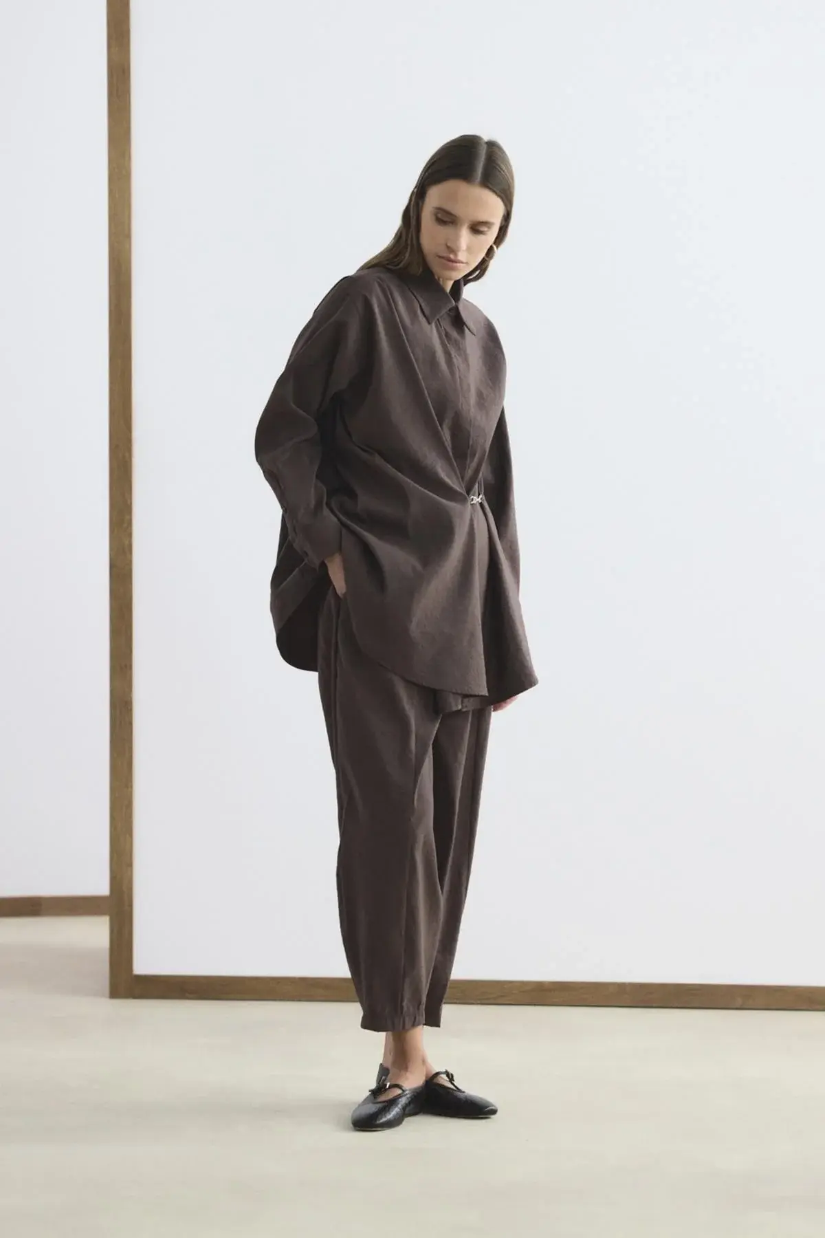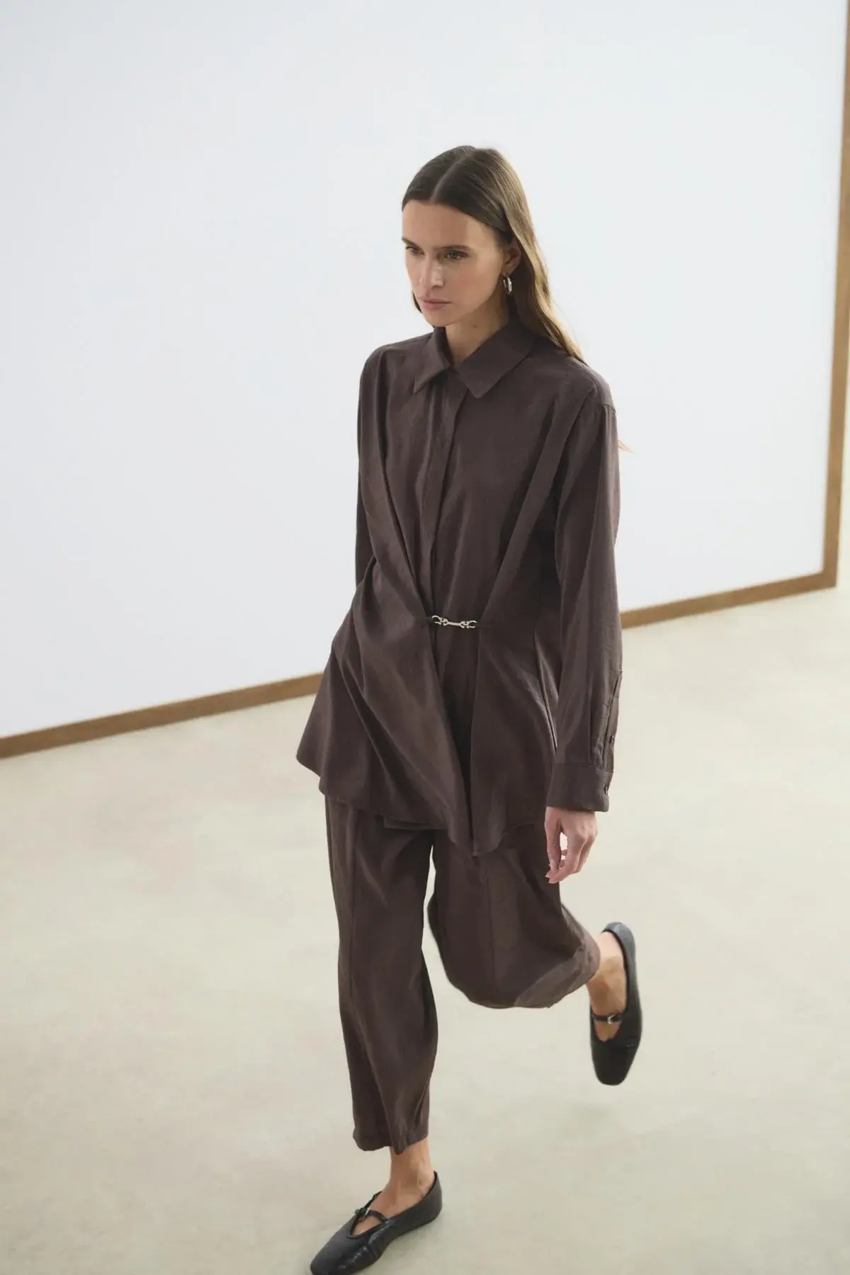 KADRİYE BAŞTÜRK TOKA DETAYLI ANVELOP GÖMLEK PANTOLON TAKIM KAHVERENGİ