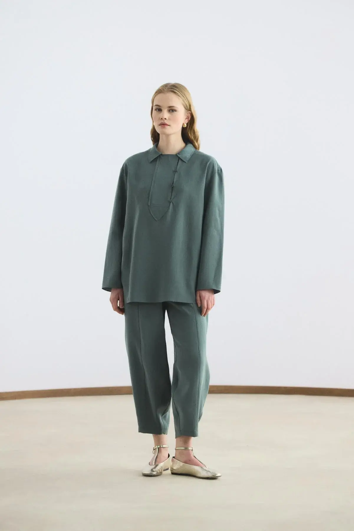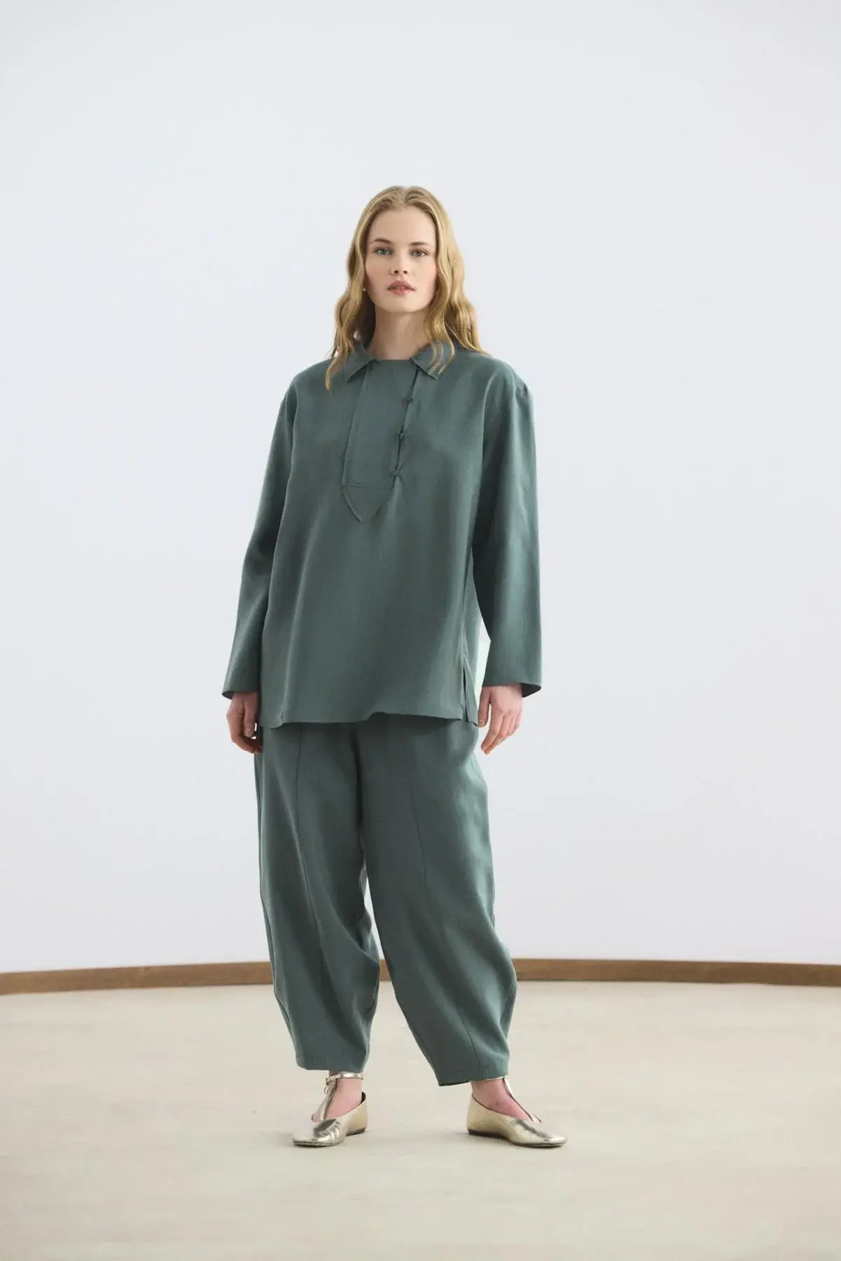 Yaka Detaylı Tensel Tunik Pantolon Takım Antrasit, tencel karışımlı kumaşının dökümlü yapısı ve yumuşak dokusu ile gün boyu konforlu bir kullanım sunar. Gömlek yaka tasarımını şık bir şekilde tamamlayan brit düğme detayları ve düşük omuz kesimi, takıma modern bir görünüm kazandırır. Yandan yırtmaçlı tunik, belden lastikli ve cepli havuç kesim pantolon ile birlikte hareket özgürlüğünüzü artırır.