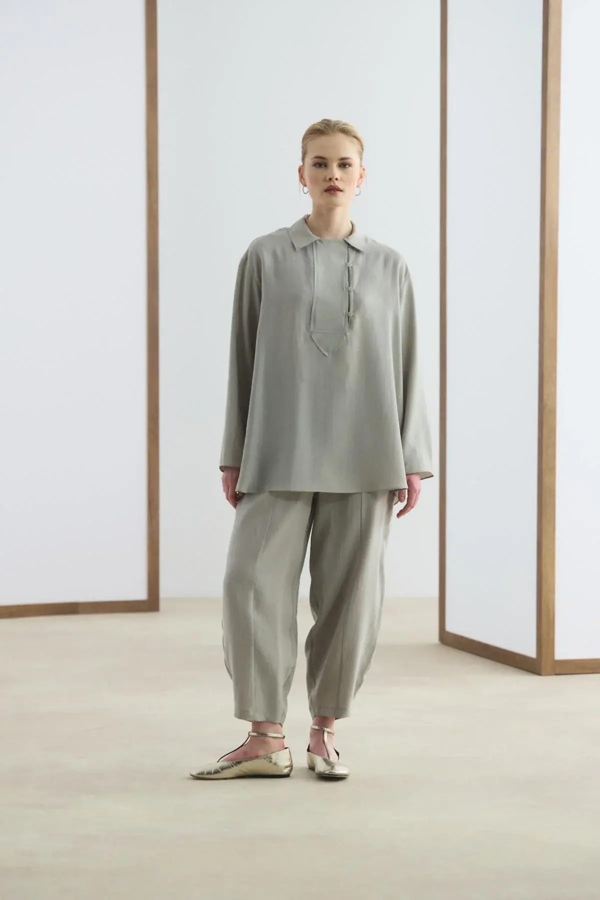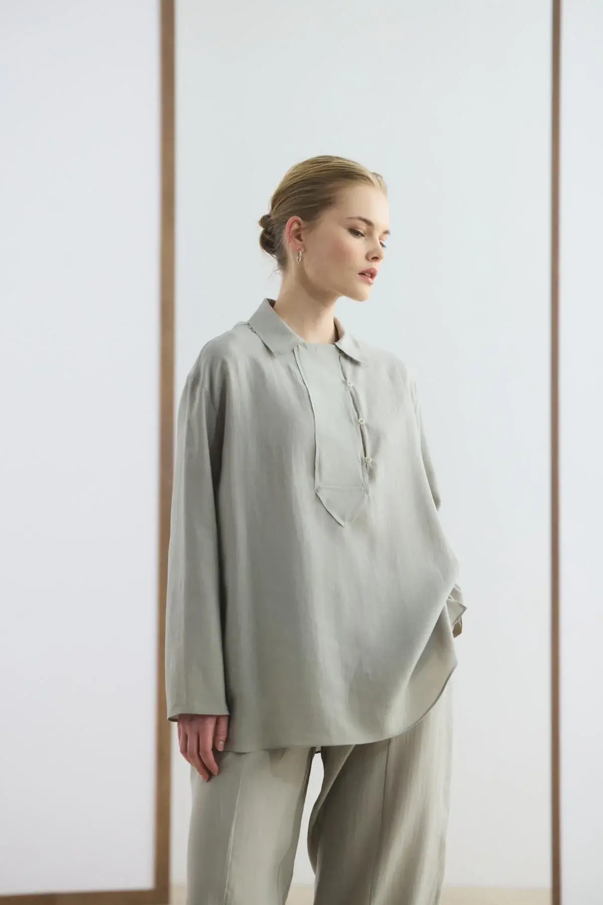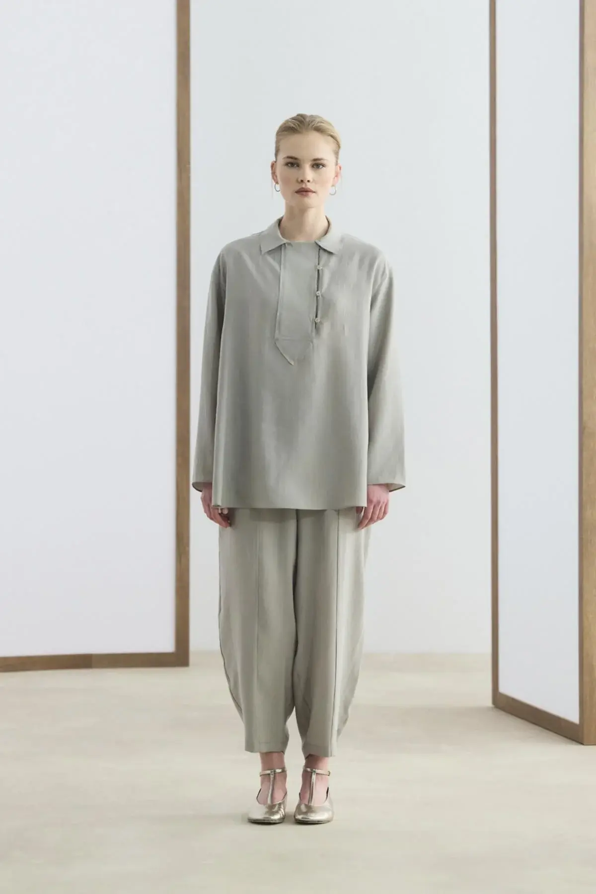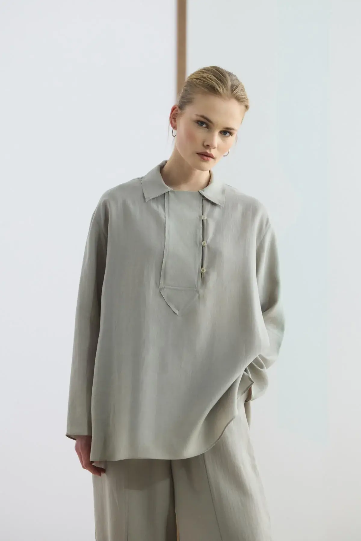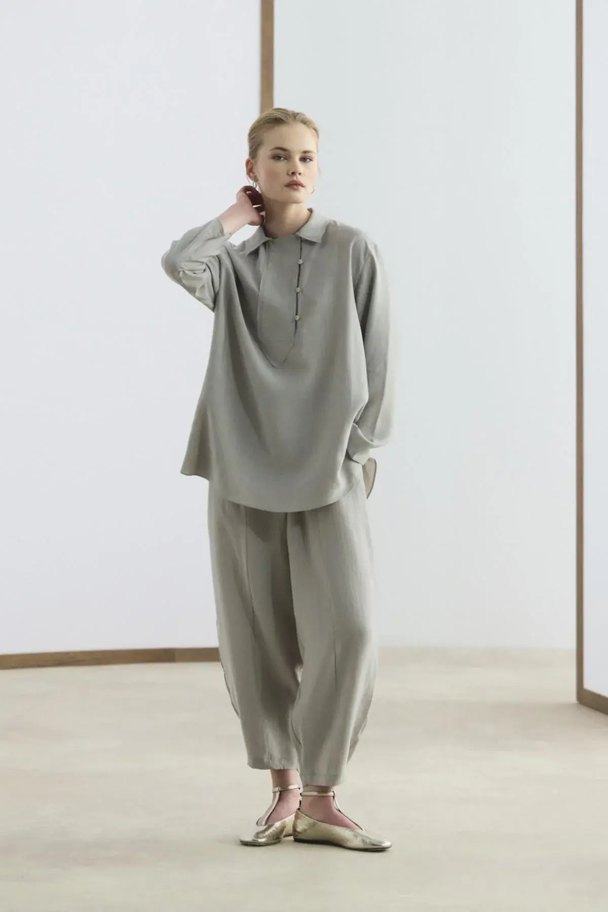 Yaka Detaylı Tensel Tunik Pantolon Takım Taş, tencel karışımlı kumaşının dökümlü yapısı ve yumuşak dokusu ile gün boyu konforlu bir kullanım sunar. Gömlek yaka tasarımını şık bir şekilde tamamlayan brit düğme detayları ve düşük omuz kesimi, takıma modern bir görünüm kazandırır. Yandan yırtmaçlı tunik, belden lastikli ve cepli havuç kesim pantolon ile birlikte hareket özgürlüğünüzü artırır.