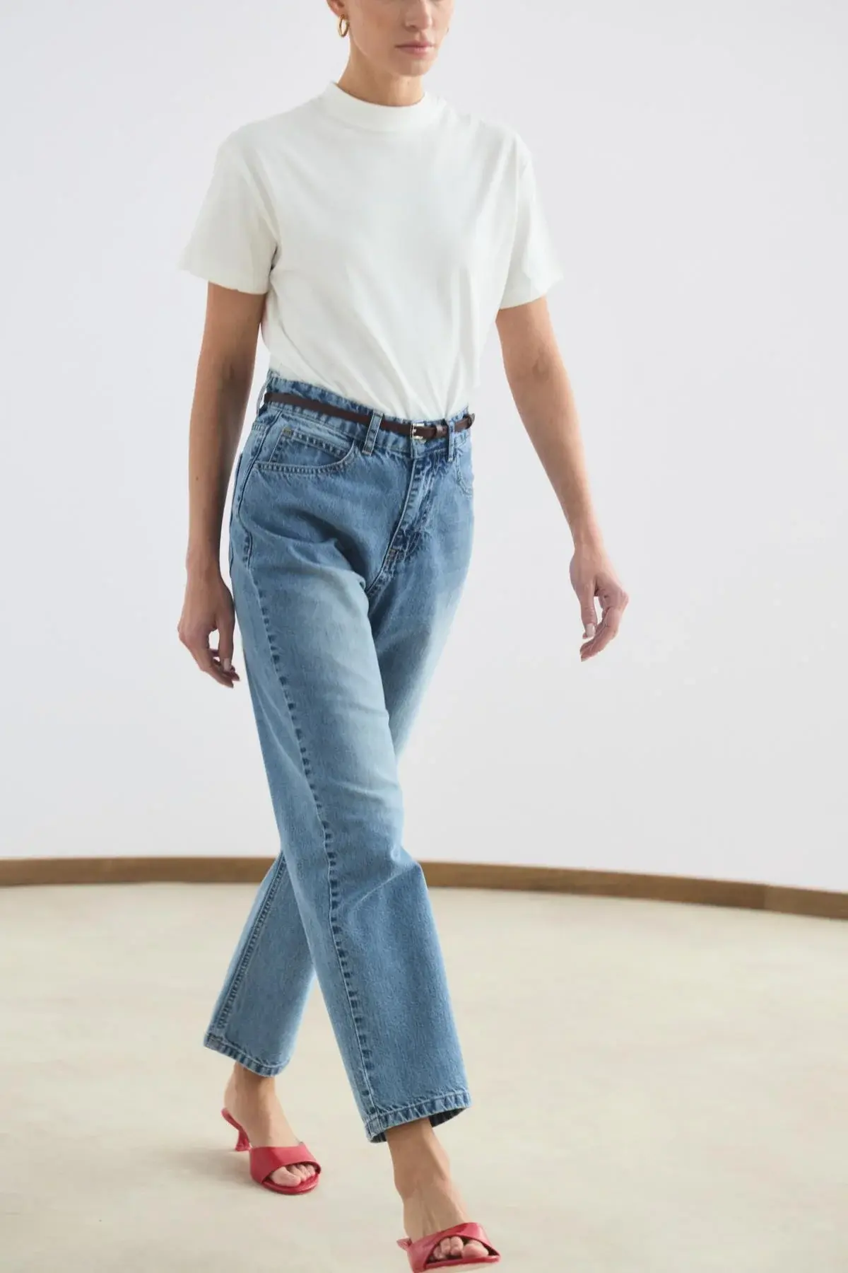 Yüksek Bel Düz Paça Kot Pantolon Açık Mavi, gabardin kumaşının dayanıklı ve formunu koruyan yapısıyla stilinize güçlü bir temel oluşturur. Bel hattını zarifçe vurgulayan yüksek bel tasarımı, düz paça kesimiyle birleşerek bacak boyunu daha uzun ve dengeli gösteren zamansız bir silüet sunar. Cepli klasik yapısı ve sağlam fermuar kapaması, günlük kullanımda işlevselliği ön plana çıkarır.