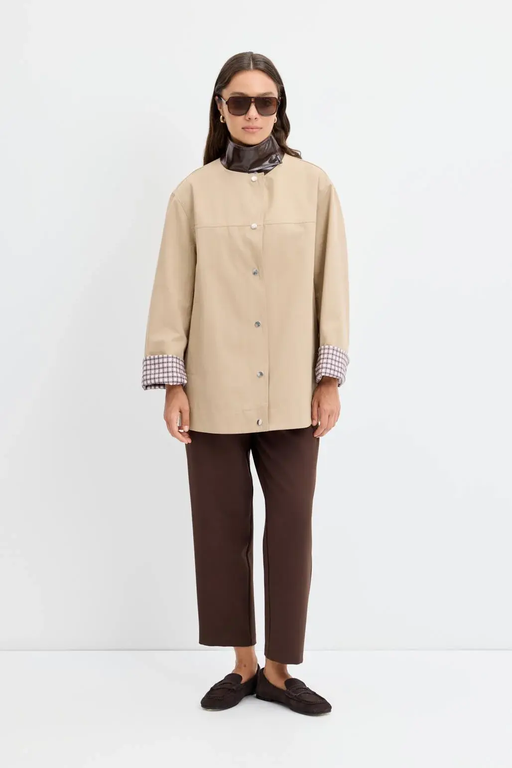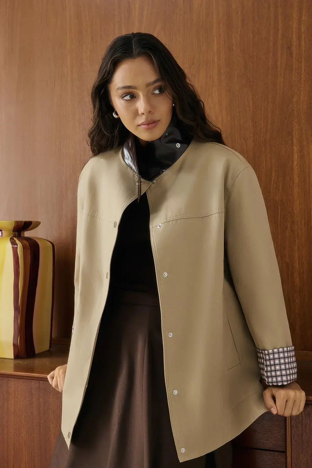 Kontrast Yakalı Ekose Astarlı Ceket Taş, pamuk karışımlı gabardin kumaştan üretilmiş düz kesim bir modeldir. Parlak deri görünümlü yüksek yakası cekete modern ve şık bir dokunuş katarken, uyumlu desenli astarı iç kısmında konfor sağlar. Önden kesikli tasarımı ve katlanabilir kol uçları pratik kullanım sunar. Çıtçıt kapama detayı ise hızlı ve kolay kapanma imkânı verir.