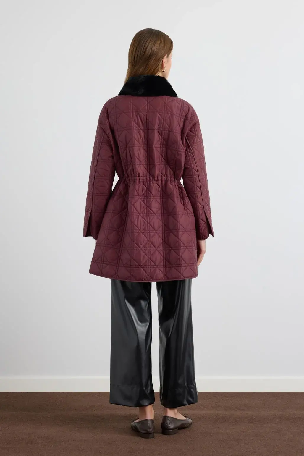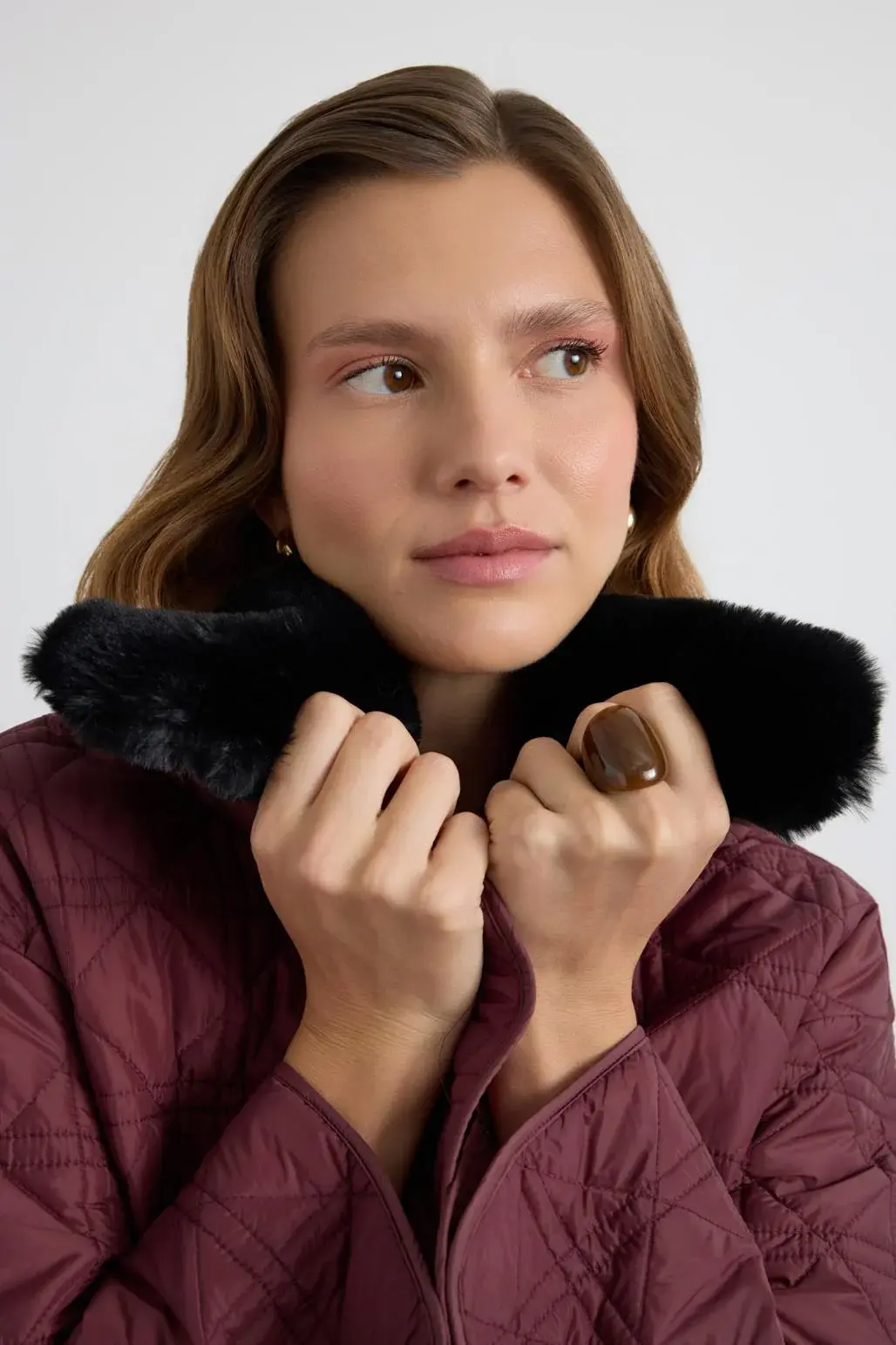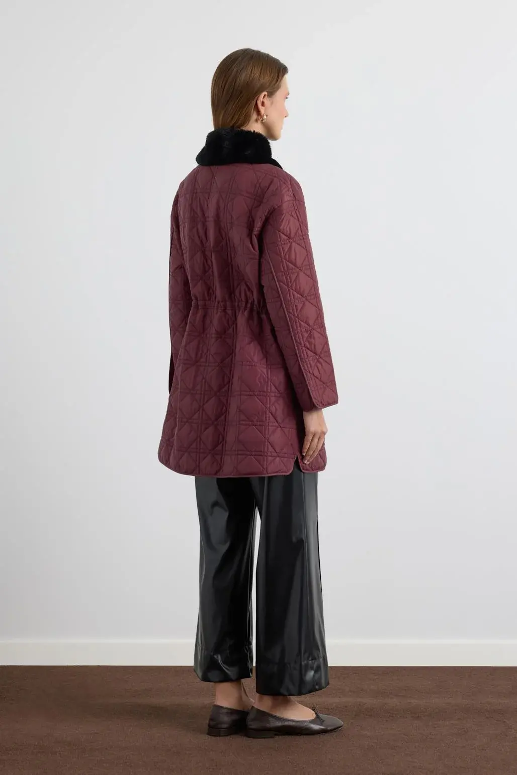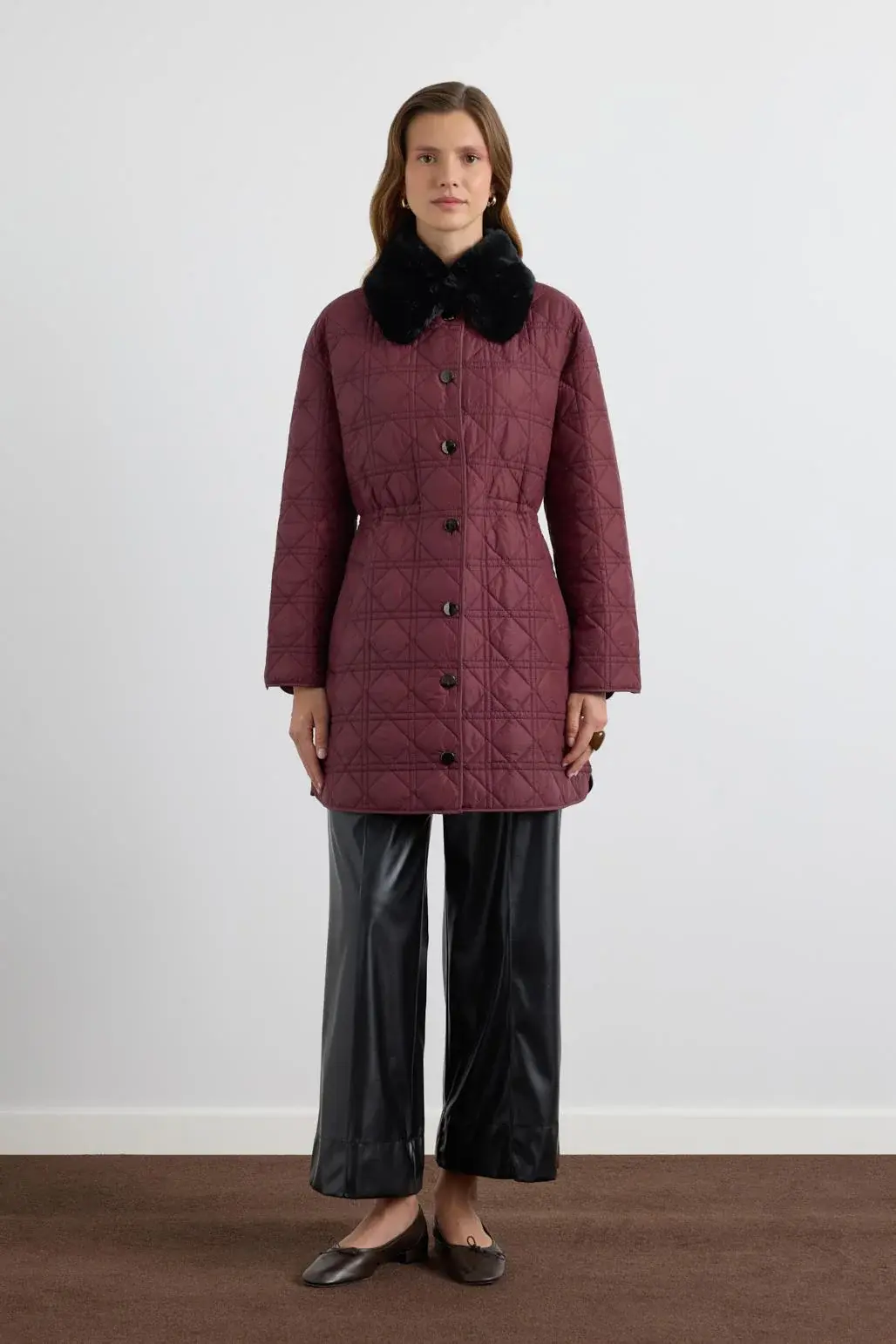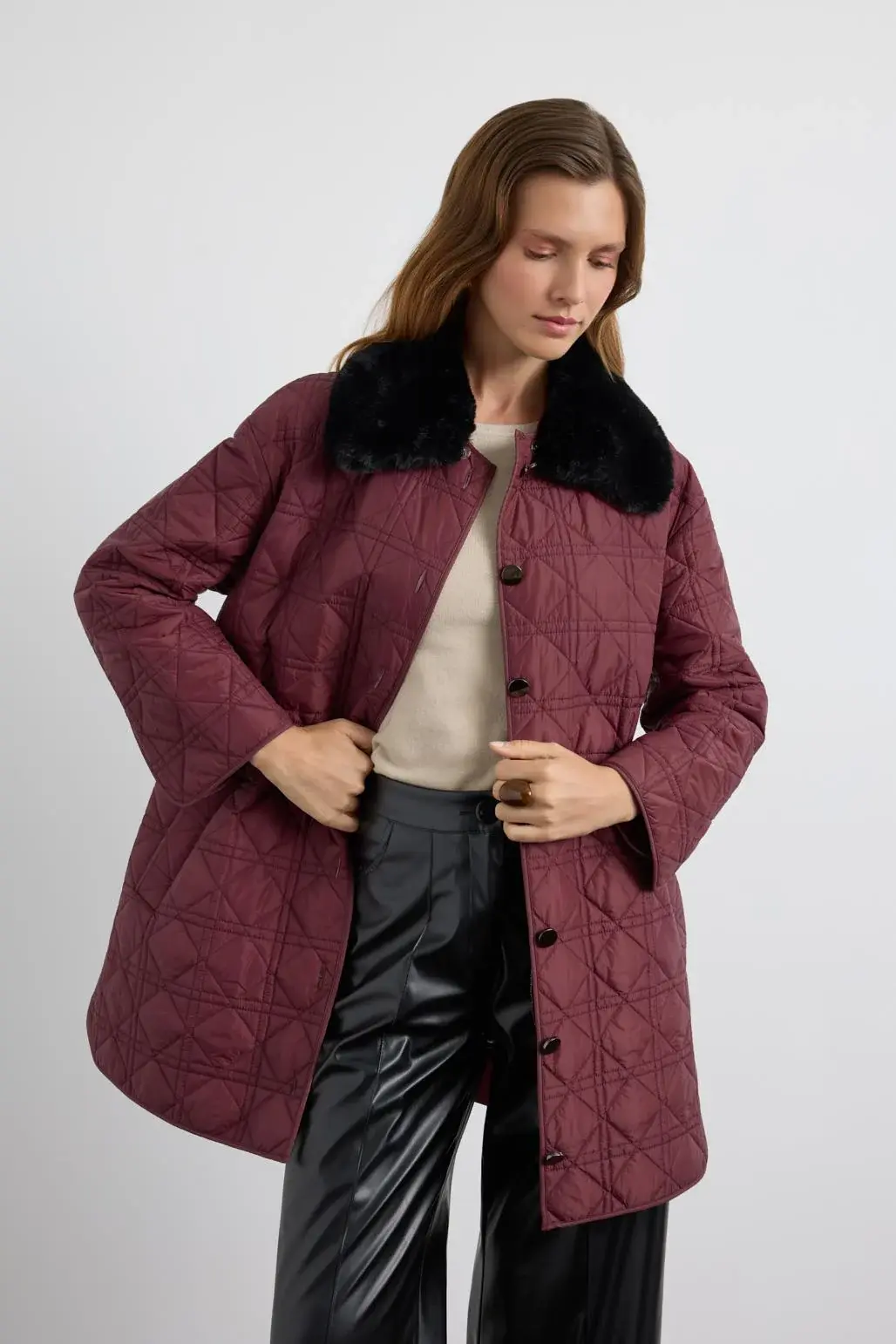 Kürk Yakalı Cepli Kapitone Mont Bordo, baklava desenli dolum kumaştan üretilmiş, düz kesim bir dış giyim modelidir. Yan fileto cepleri pratik kullanım sağlarken, suni kürk garnili yakası görünümüne sıcak ve zarif bir dokunuş katar. İçten ayarlanabilir gizli stoper detayı sayesinde vücut hatlarınıza uyum sağlar. Black nikel düğme kapaması ise tasarımı tamamlayan şık ve kullanışlı bir ayrıntıdır.