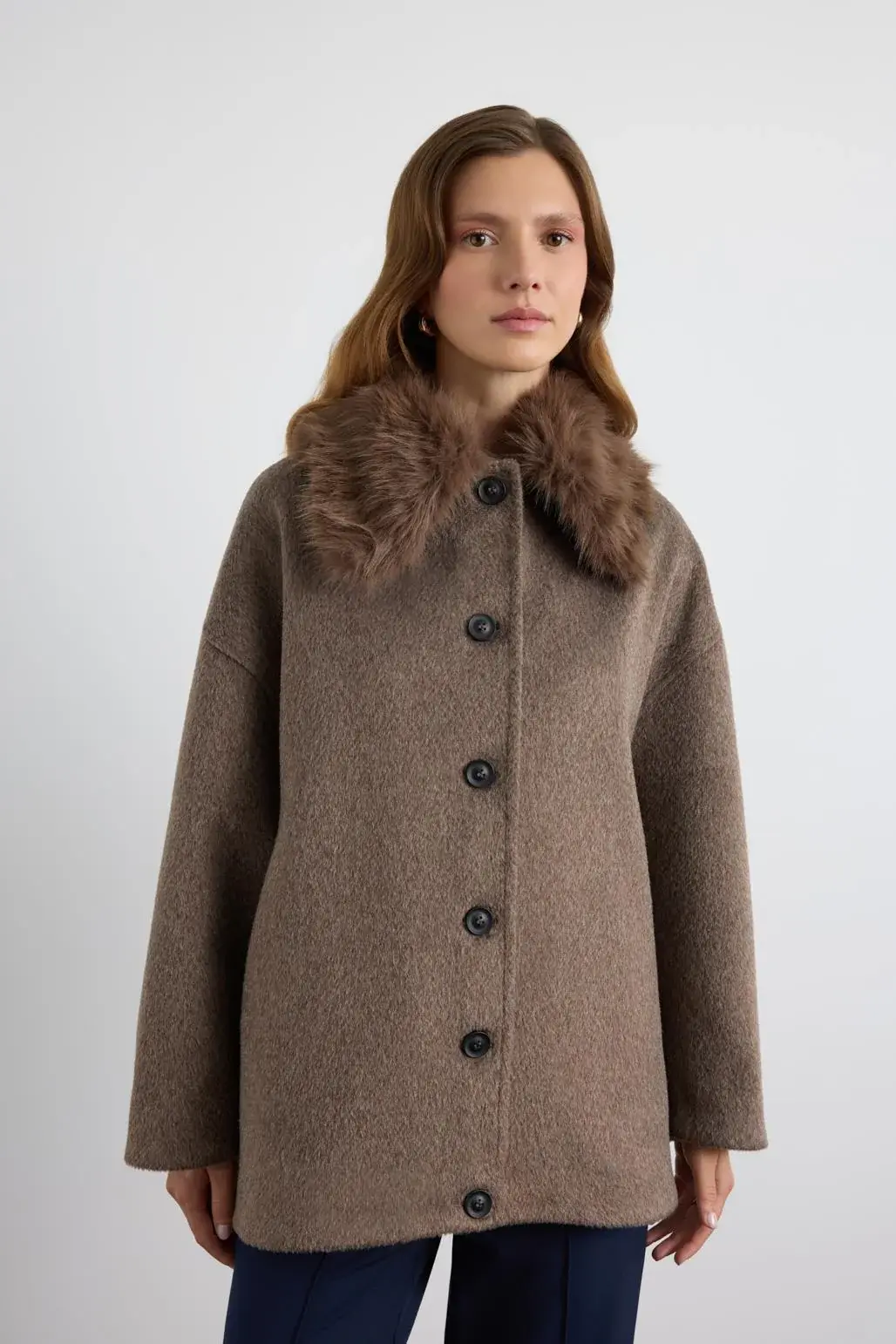 Kürk Yakalı Kaşe Ceket Kahve, yün efektli kaşe kumaştan üretilmiştir. Takma suni kürk yakası cekete sıcaklık ve şık bir dokunuş katarken, düğme kapamalı önü ve cepleri günlük kullanımda pratiklik sağlar. Bomber kesimi ise cekete modern bir hava kazandırır.