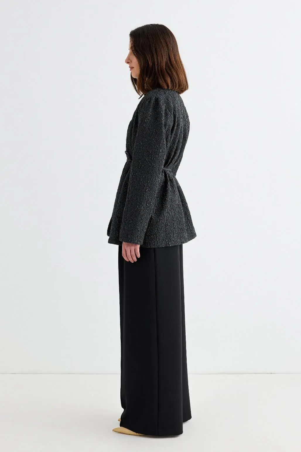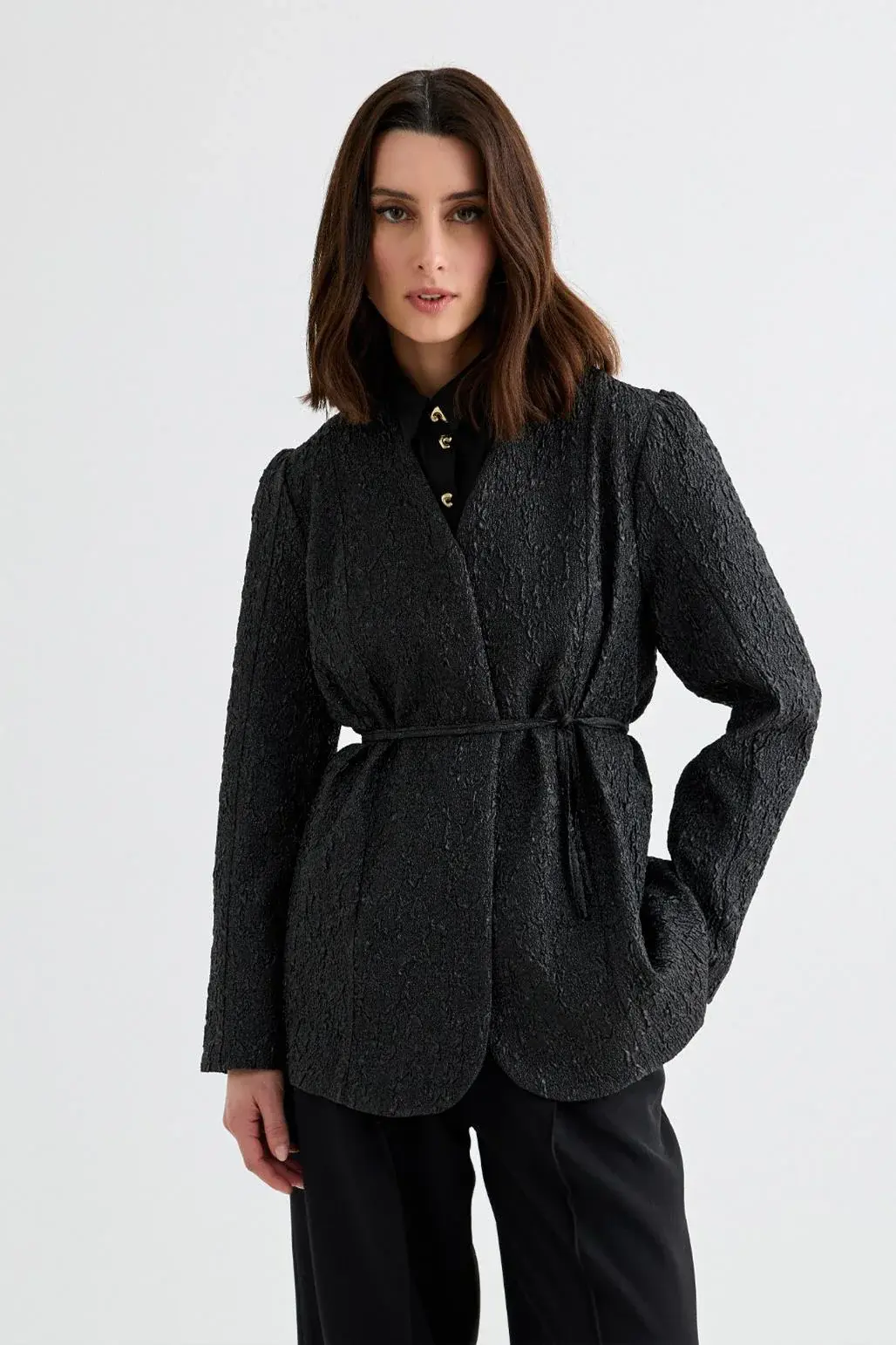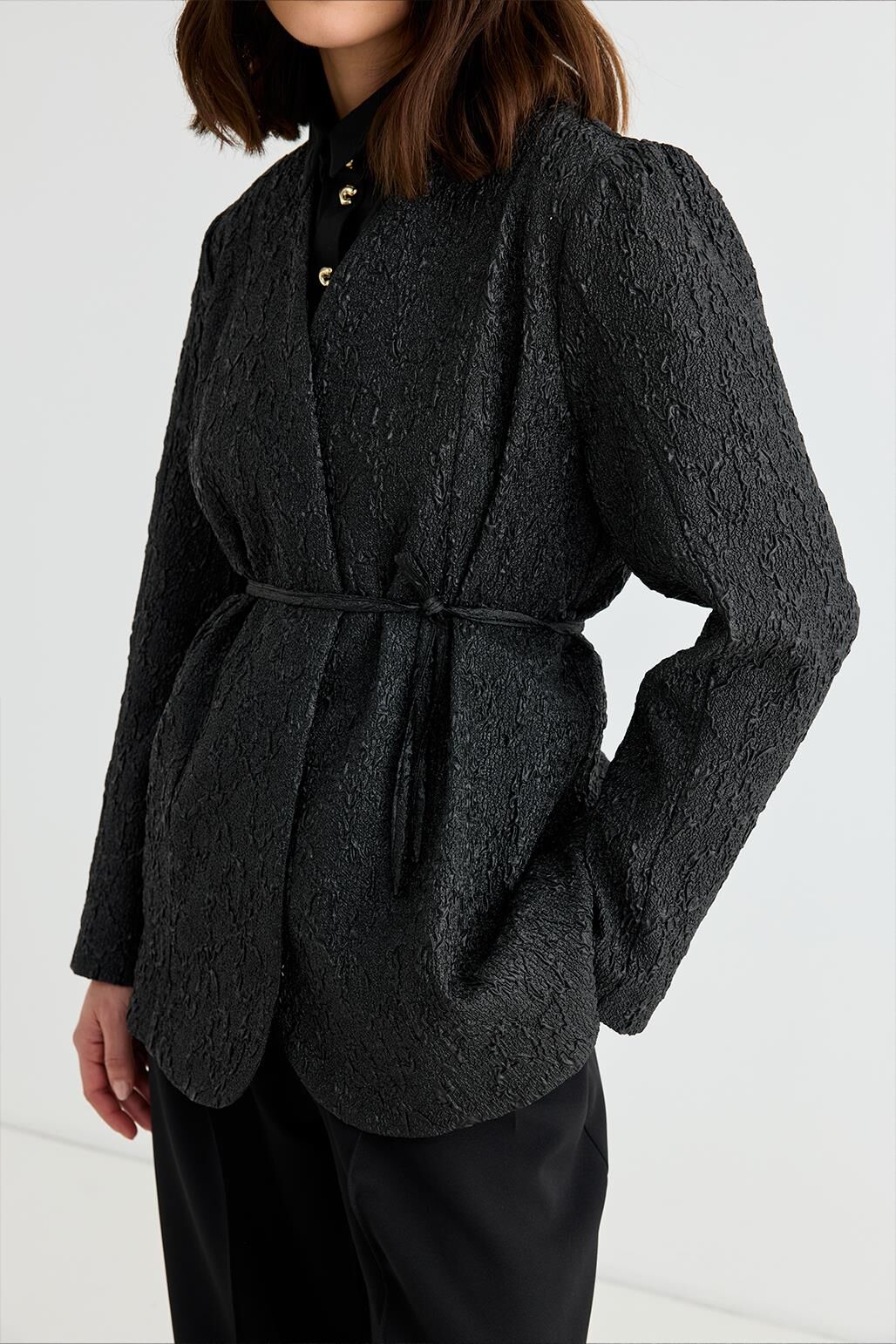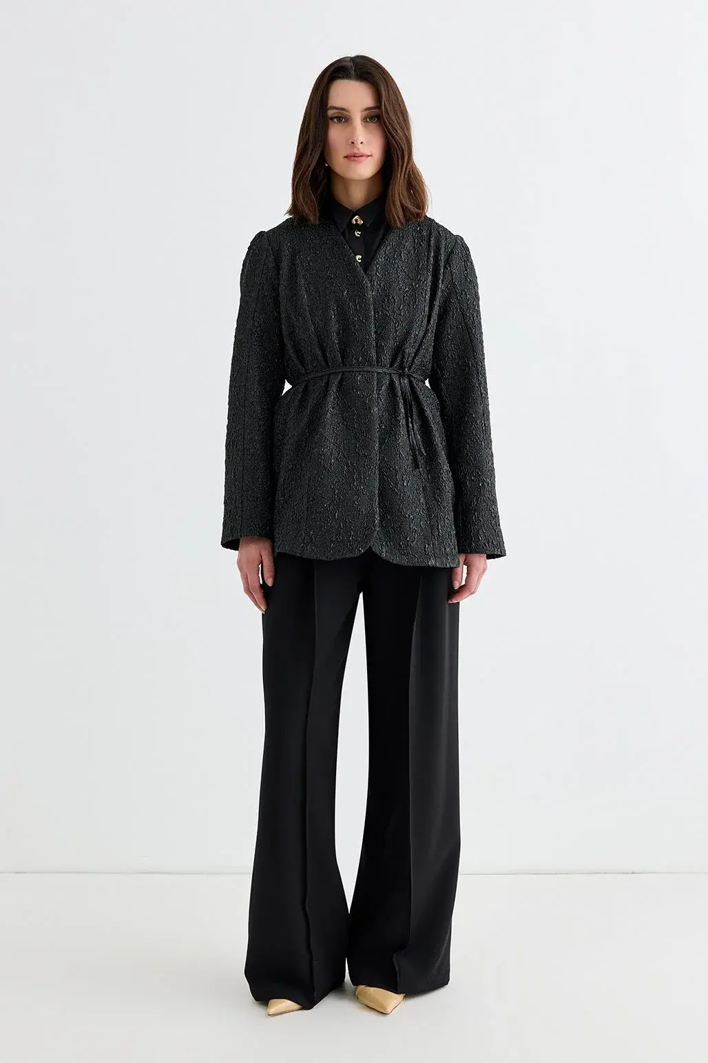 Lenia jakar ceket siyah, özel dokuma desenli jakar kumaşıyla şıklık ve zarafeti bir araya getiriyor. V yaka tasarımı ve belden oturan formuyla zayıf gösterir, kusursuz bir siluet sunarken zarif detaylarıyla özel günlerde dikkat çekmenizi sağlar. Palazzo geniş paça pantolonlarla modern bir tarz yakalayabilir ya da uzun etekle daha klasik bir görünüm oluşturabilirsiniz. Farklı dokusuyla stilinizi öne çıkaracak bu ceket, gardırobunuzun en özel parçalarından biri olmaya aday!
