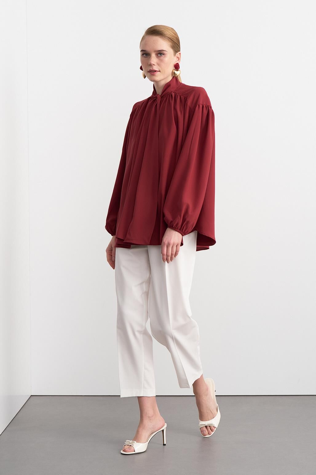 Melsa büzgülü fularlı gömlek bordo, ipek hissiyatlı kumaşı ve şık detaylarıyla zamansız bir stil sunar. Büzgü ve fular tasarımı, sade kombinlere zarif bir dokunuş katarken, ceketlerle klasik bir görünüm, pantolonlarla modern bir tarz yaratmanızı sağlar. Günlük hayatınızdan özel günlerinize kadar çok yönlü kombin imkanı vaad ederek stilinizi bir üst seviyeye taşır