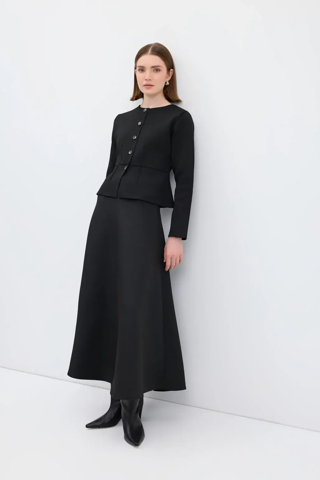 Mini Pensli Triko Ceket Siyah, viskon karışımlı dokuma kumaşıyla hafif ve yumuşak bir his sunar. Bisiklet yakası modern ve sade bir görünüm kazandırırken, pensli ve belden kesimli formu vücuda hoş bir duruş sağlar. Gold düğme detayları şıklığı artırır, düğme kapaması ise pratik kullanım sunar. Günlük kullanımdan ofis kombinlerine kadar her ortamda rahatlıkla tercih edilebilecek, stilinize zarif dokunuşlar katacak bir parçadır.