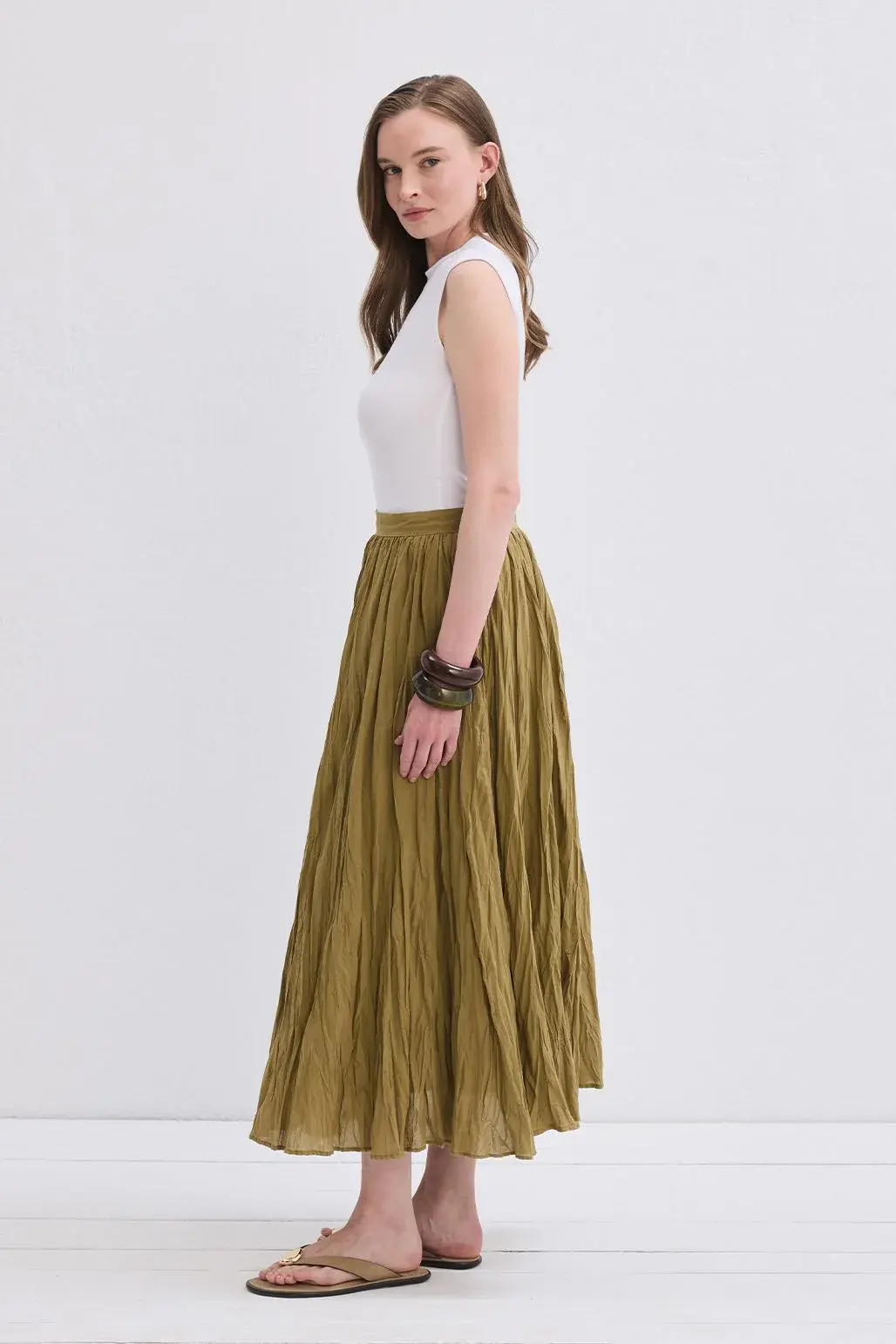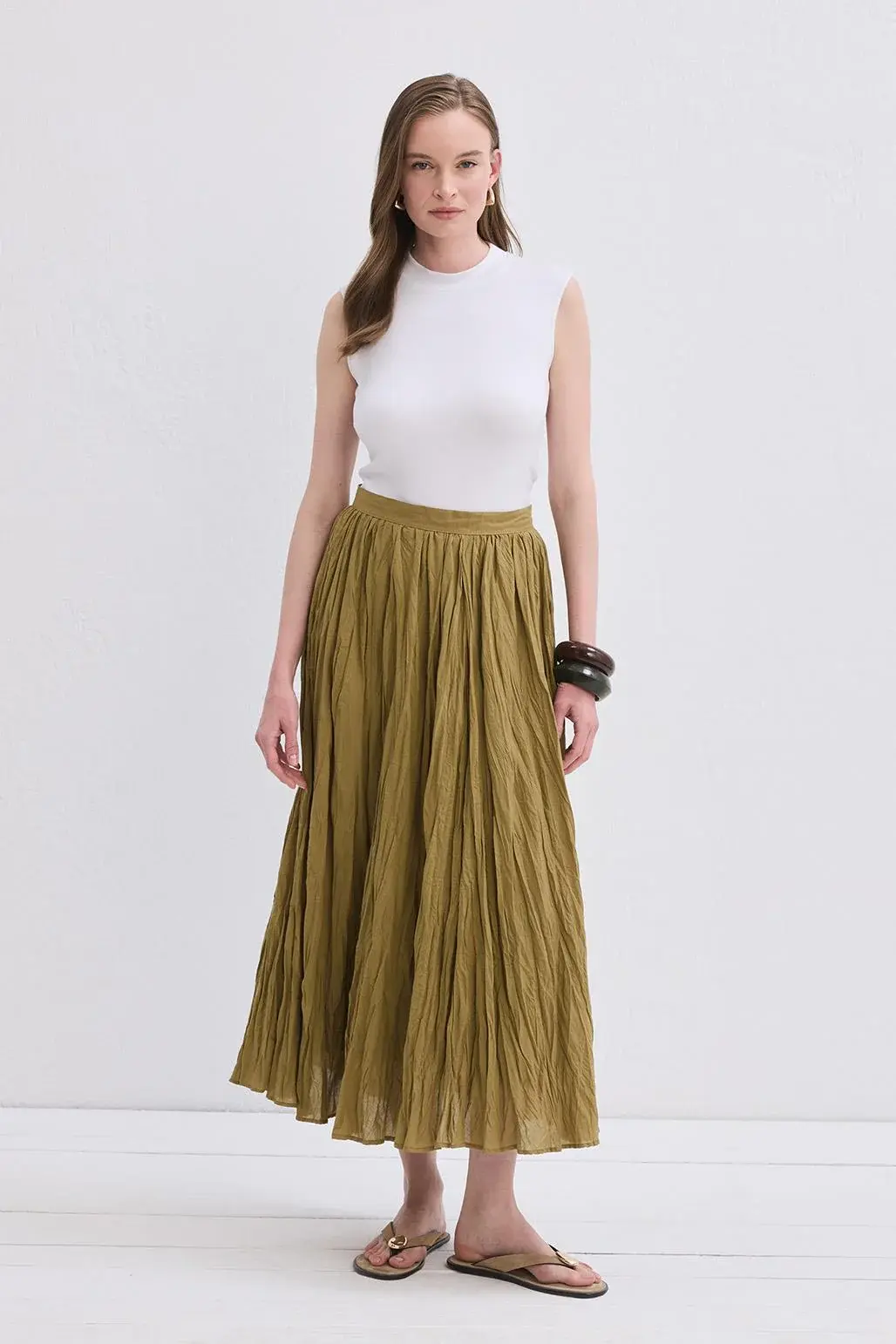Nora Pliseli Etek Yağ yeşili, zarif pliseleri ve hareketli formu ile dikkat çeken bu etek, pamuk vual kumaşı sayesinde gün boyu rahatlık sunar. Bel kısmındaki kemerli detay, etek siluetini zarifçe tamamlar. Arkada yer alan fermuar kapanma detayı, kullanım kolaylığı sağlarken, özel crush efektli kumaşı şıklığınızı artırır. Kendinden astarlı yapısı, etek boyunca oluşan dalgalı hareketle sizi özgürleştirir. Özel günlerden günlük stilinize kadar her ortamda şıklığınızla fark yaratmanızı sağlayacak çok yönlü bir parça olarak dolabınızda yerini alacak.