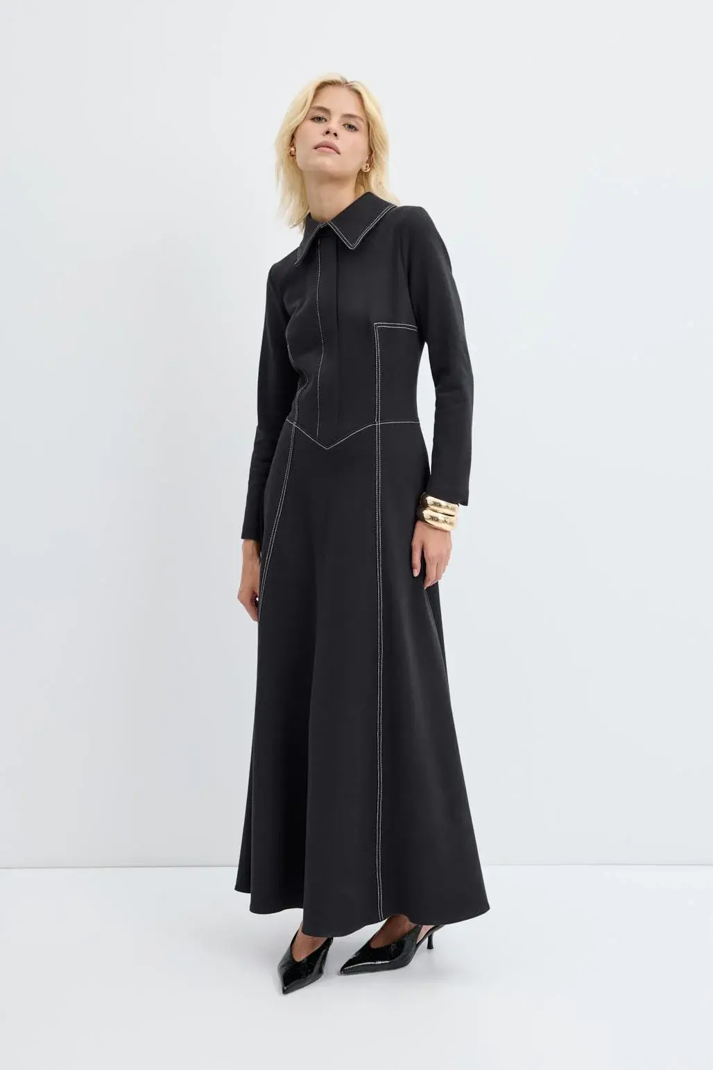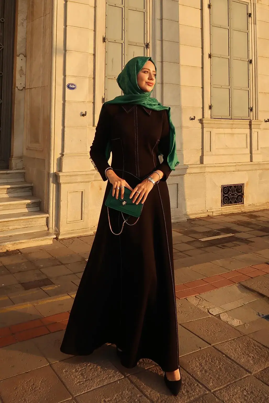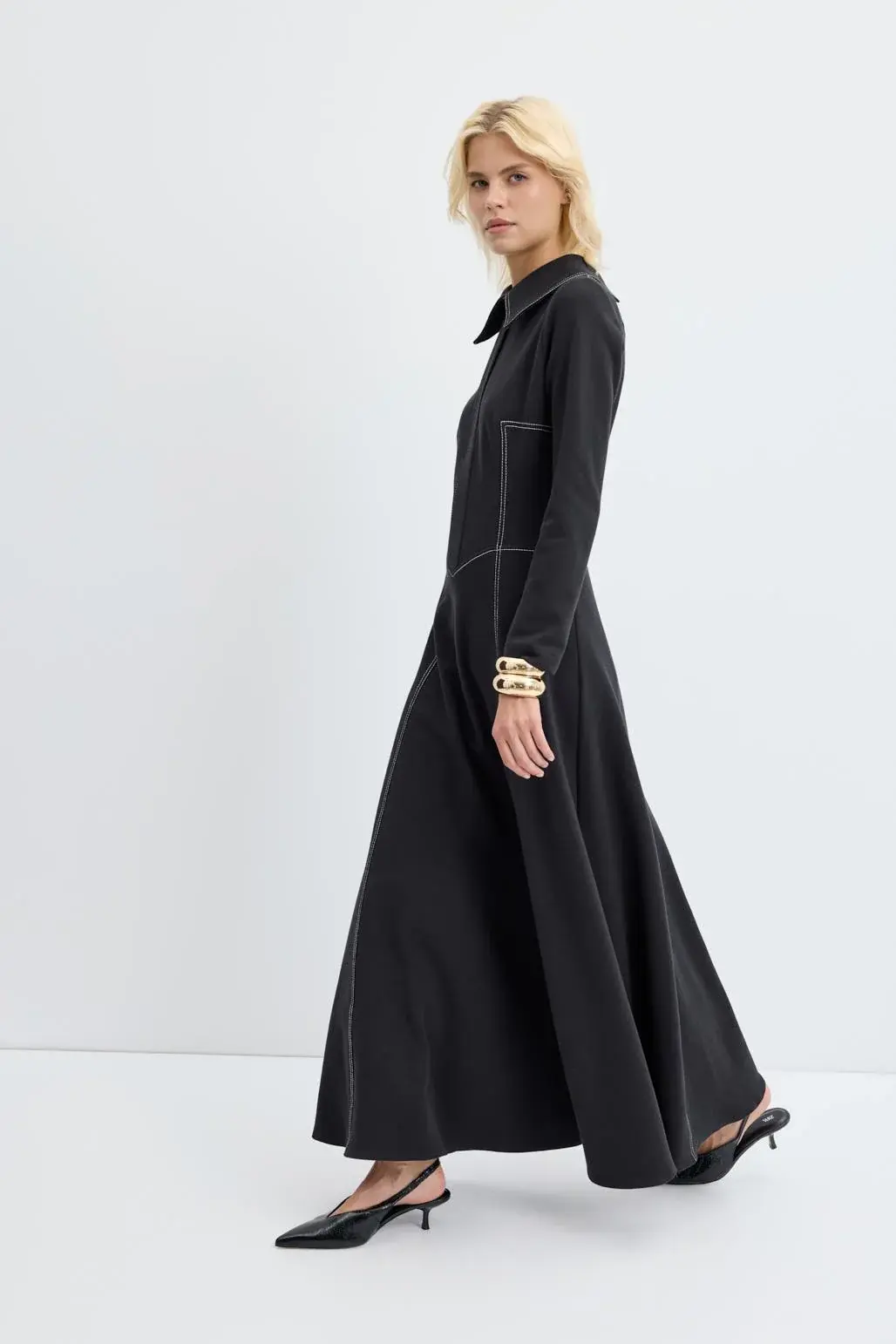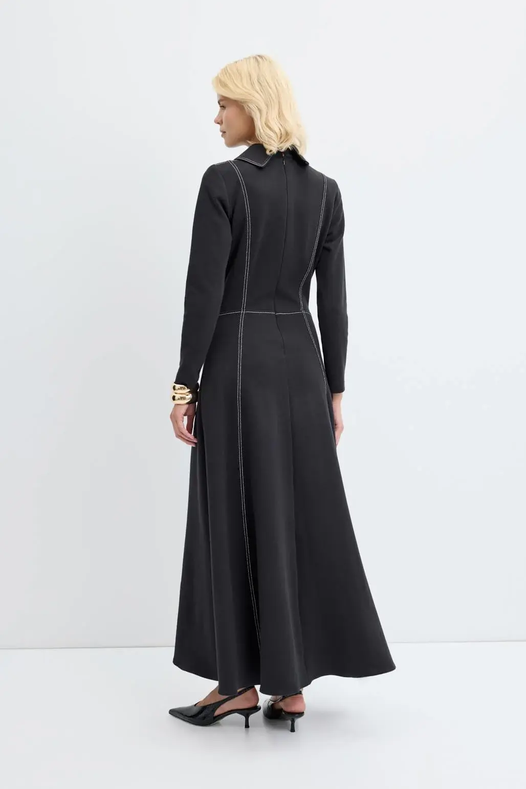 Punto Dikişli Örme Elbise Siyah, double face pamuk kumaşıyla rahat ve kaliteli bir kullanım sunar. Geniş yakası ve ön bedendeki süs pat detayıyla şık bir görünüm kazanırken, arka fermuar kapaması pratiklik sağlar. Kesikli ve kontrast dikişleri modern bir dokunuş katarken, uzun kloş kesimi hareketli ve feminen bir duruş yaratır.