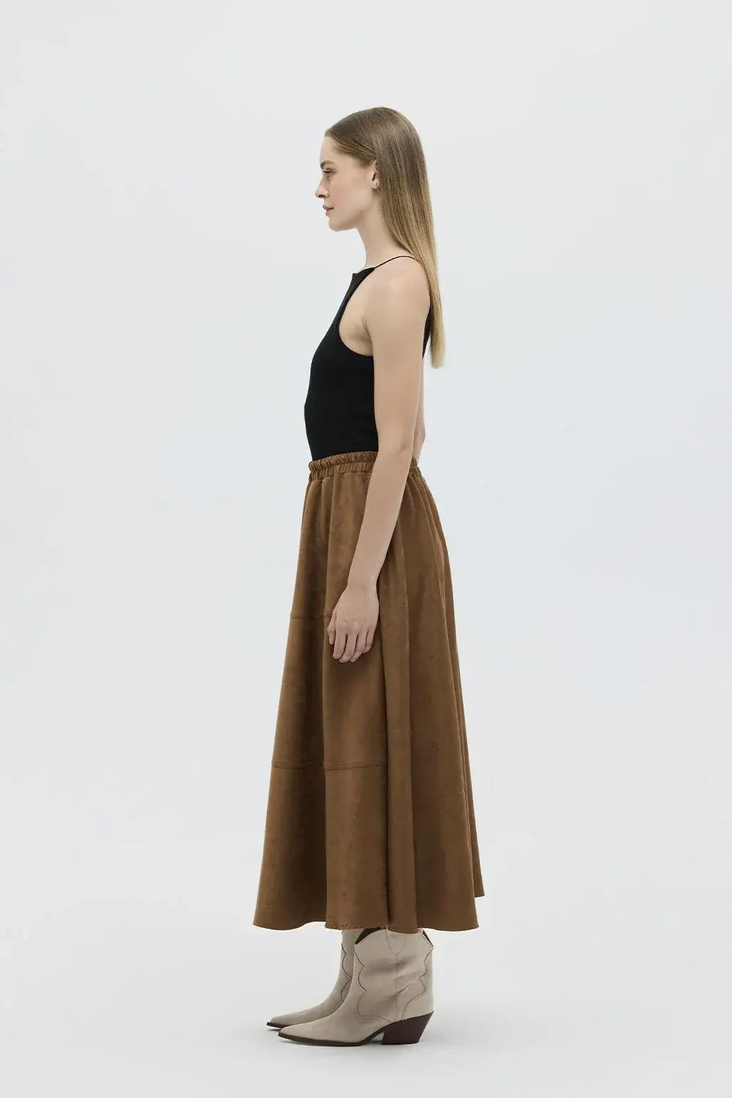 Süet dikiş detaylı kloş etek taba, kaliteli süet kumaşı ve zarif dikiş detaylarıyla dikkat çeker, retro ve bohem bir hava yaratır. Desenli montlar, dokulu trikolar, çizmeler veya düz ayakkabılarla tamamlayarak stilinizi bir üst seviyeye taşıyabilirsiniz. Hem şık hem de rahat kombinler için ideal bir parça.