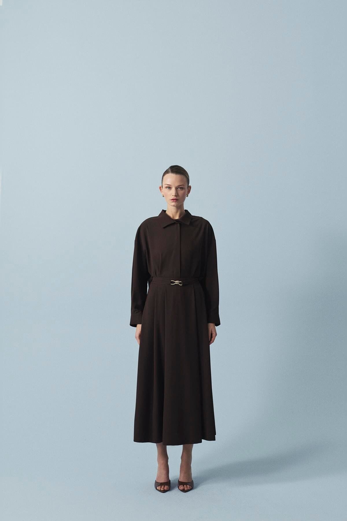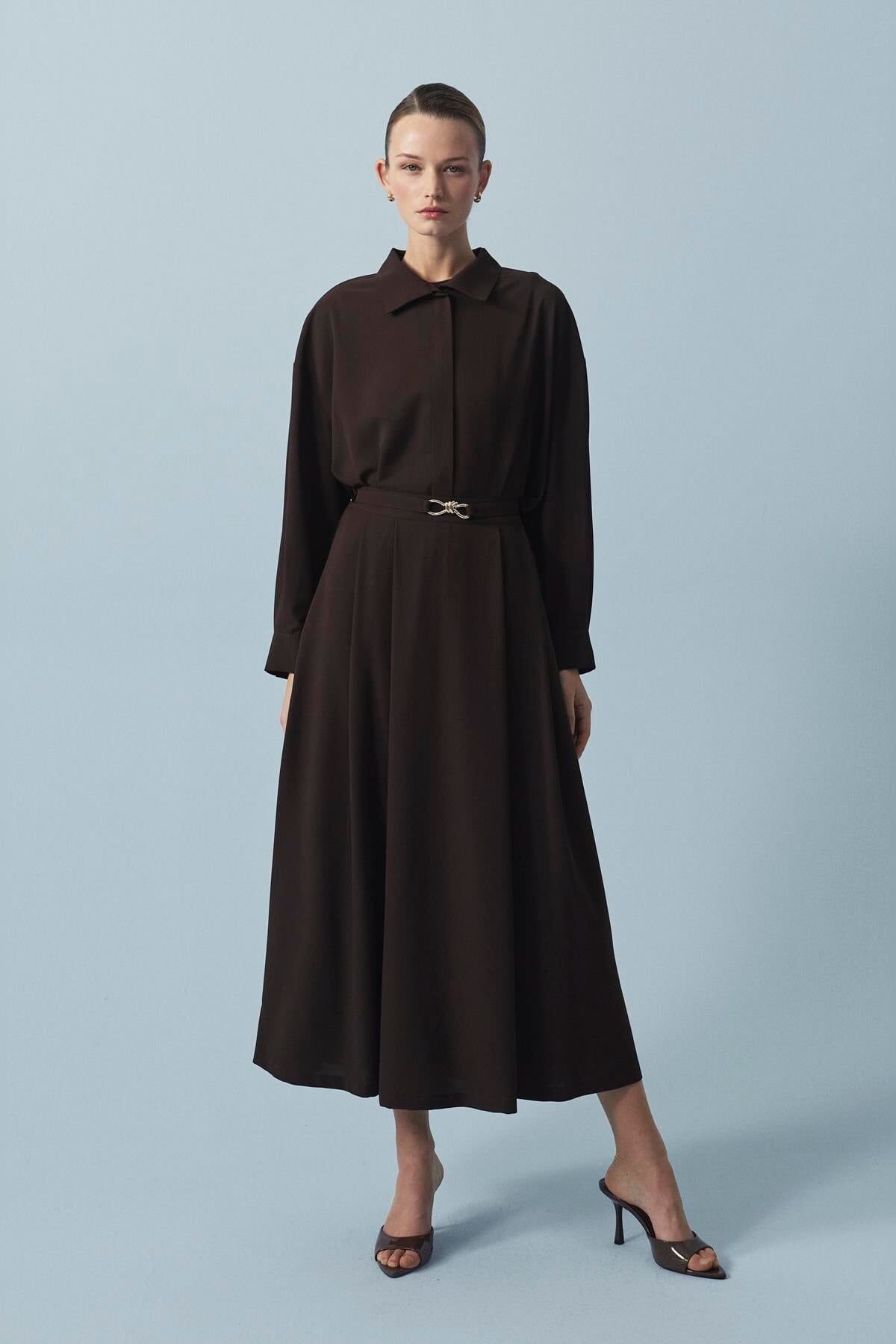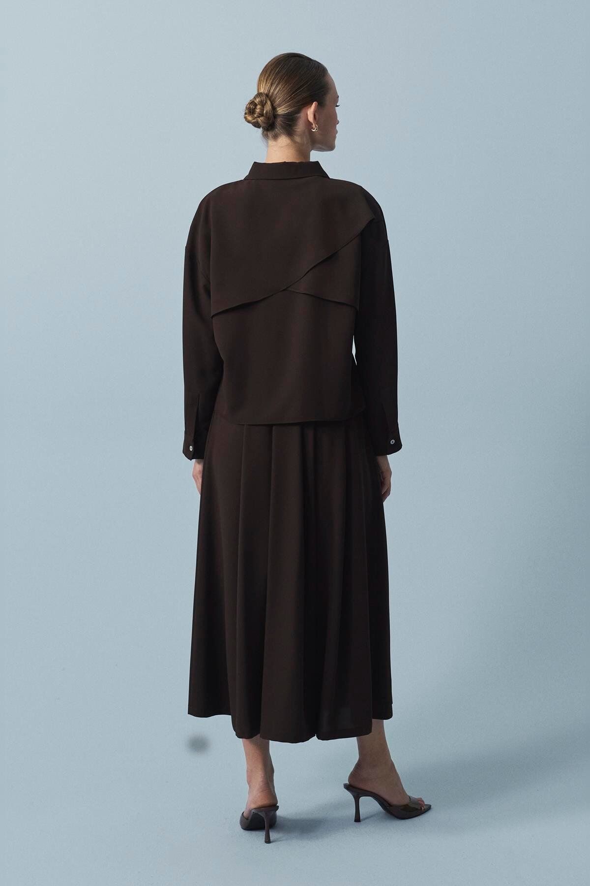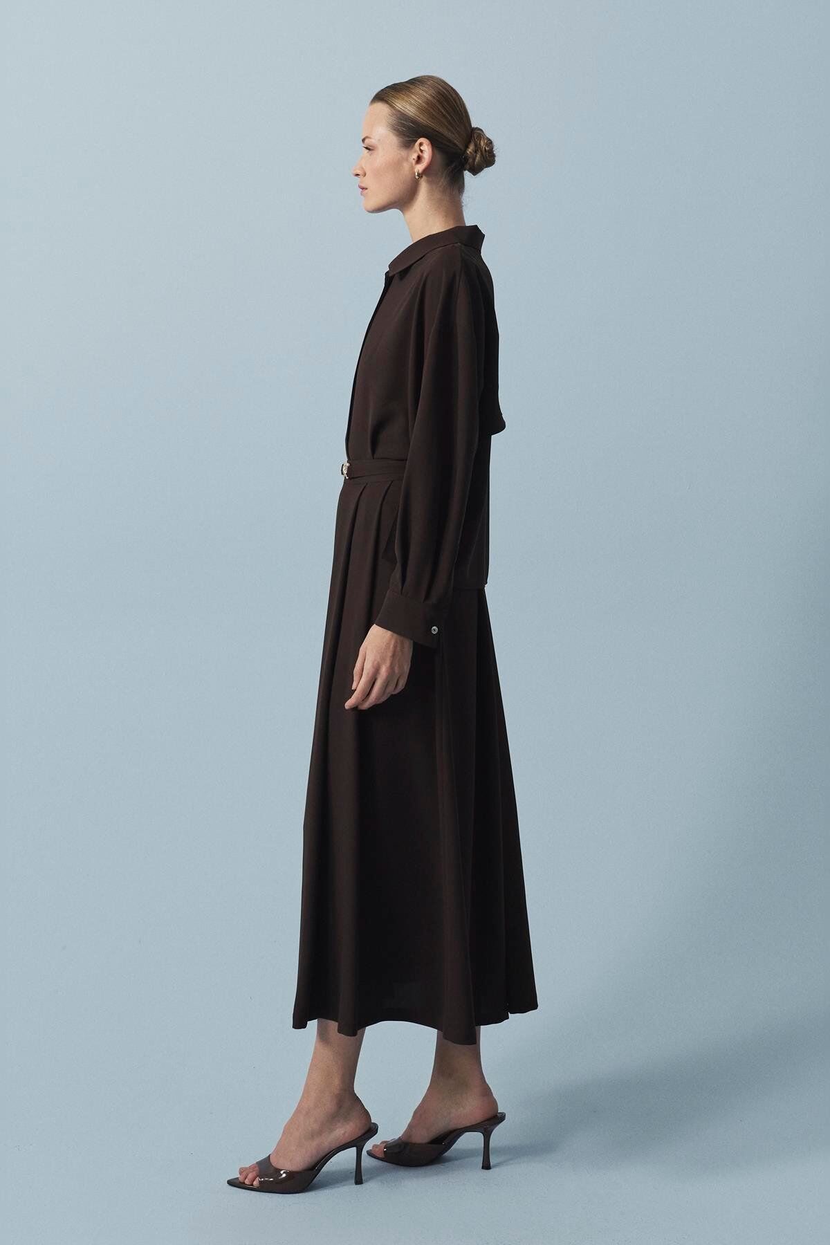 TERZİ DÜKKANI GOLD DÜĞÜM KEMER DETAYLI KREP ETEKLİ TAKIM KAHVE