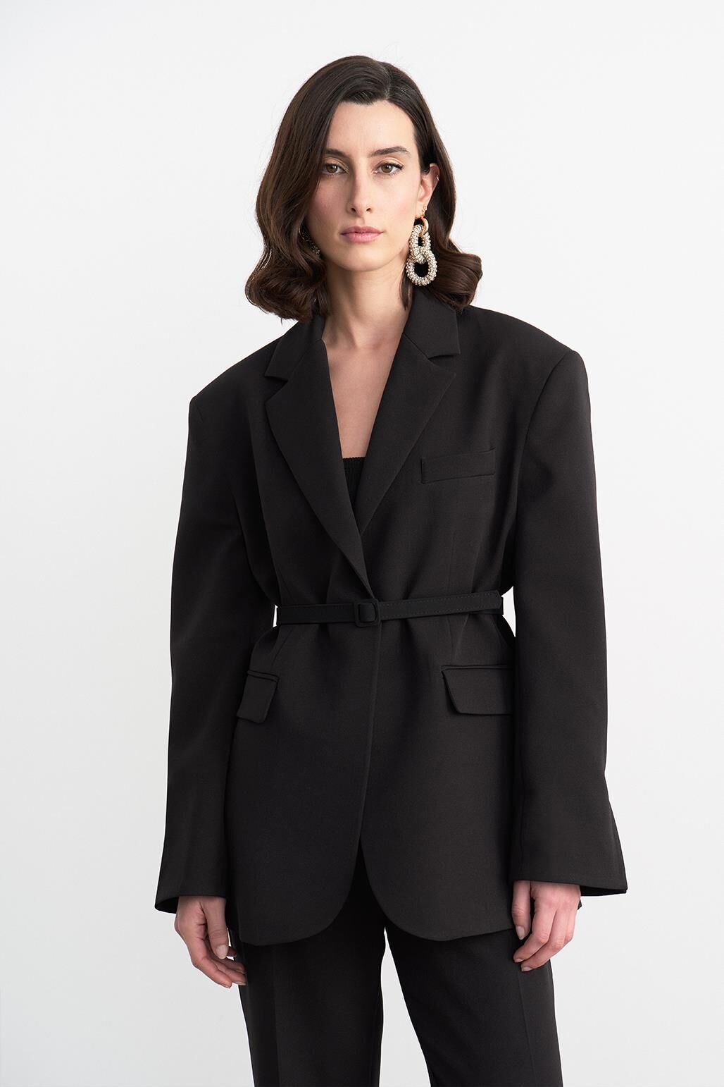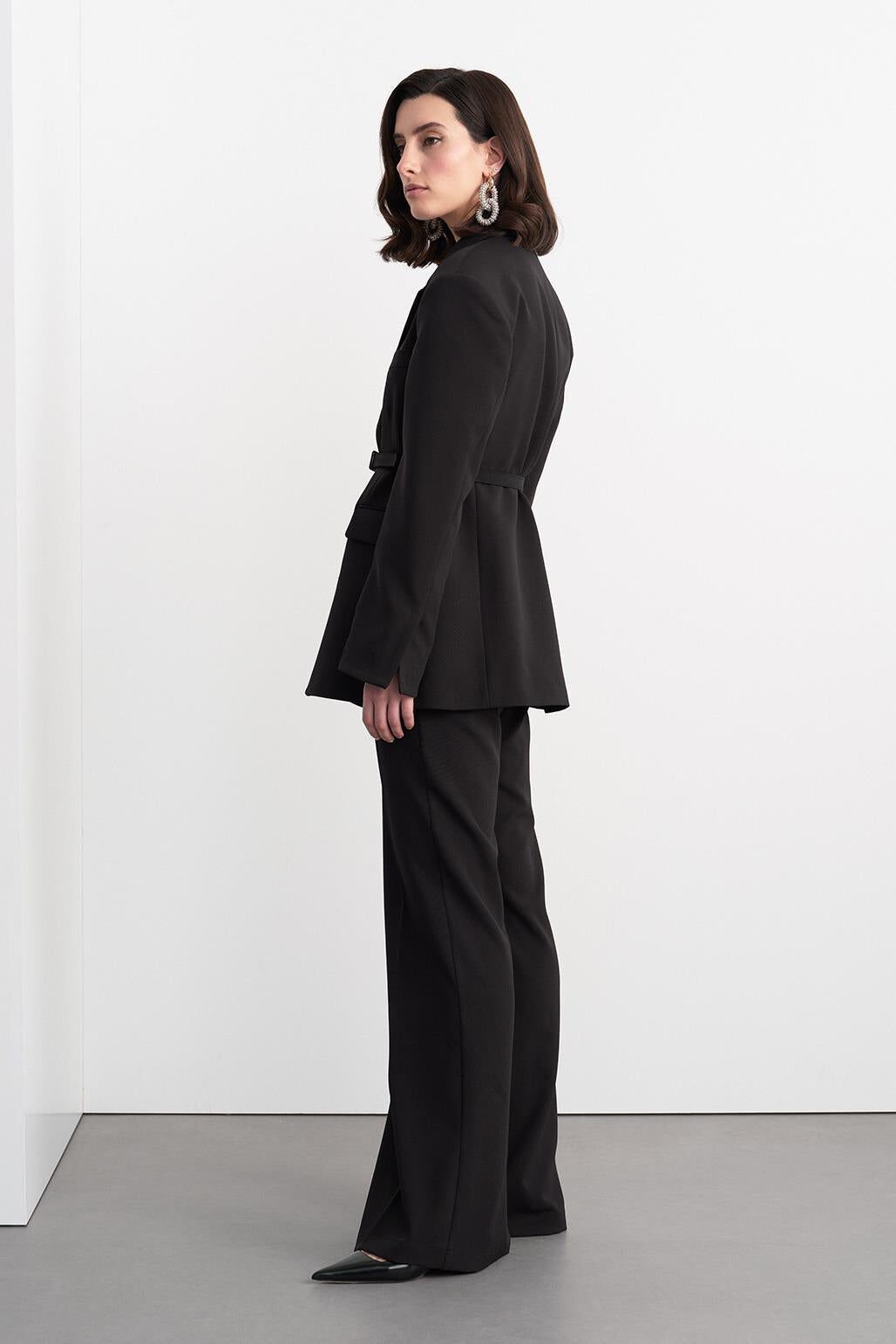 Fit kesim vatkalı ceket pantolon takım siyah, pamuk karışımlı double kumaşı, astarlı yapısı ve kapaklı cepleriyle zarif bir duruş sunar. Katlamalı yaka ve gizli düğme kapama detayıyla tamamlanan takım, hem iş hem de özel gün kombinleriniz için ideal bir seçim.