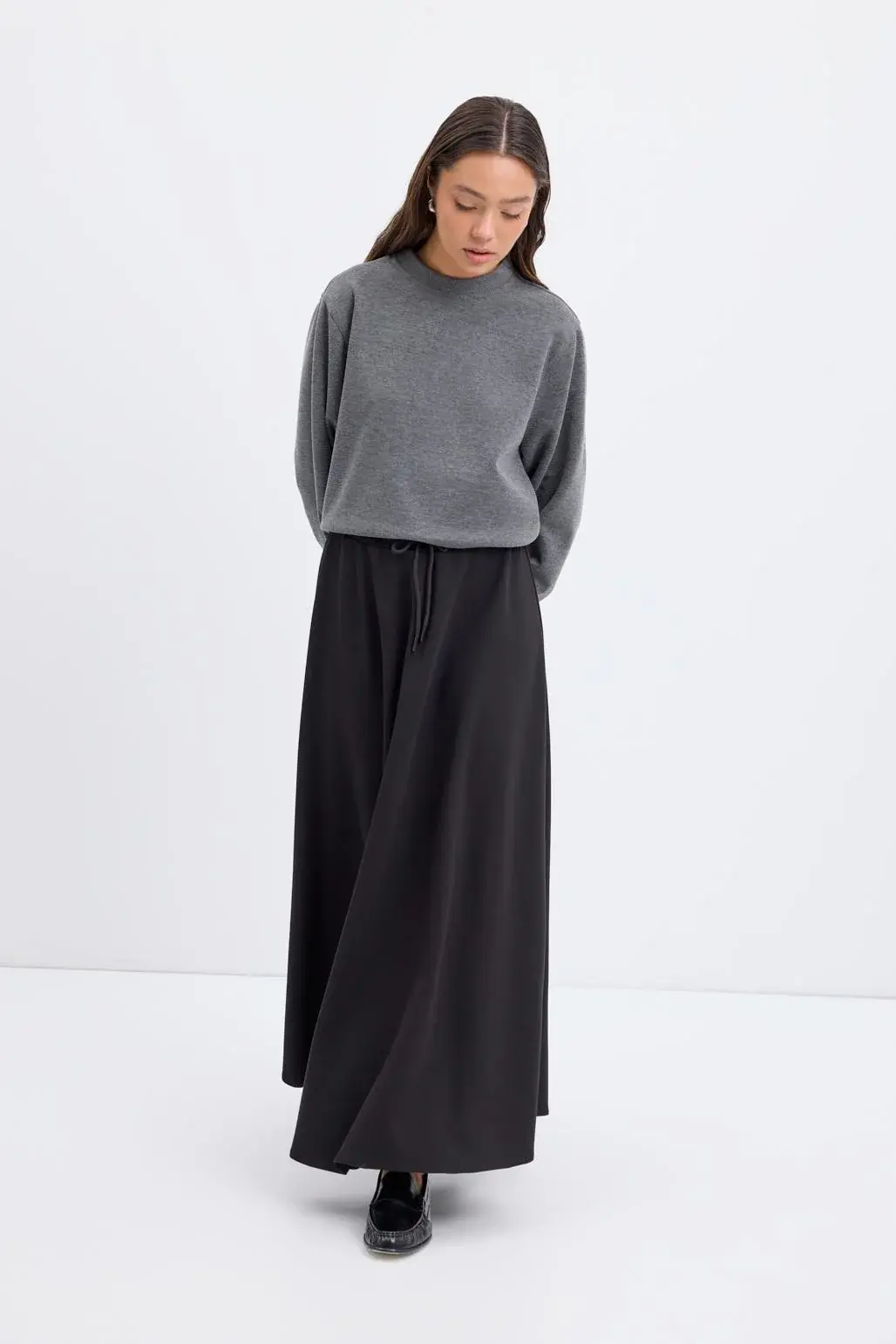 Yüksek Bel Bağcıklı Geniş Form Kloş Etek Siyah, çift taraflı interlok kumaştan üretilmiş, rahat ve şık bir parçadır. Tam tur lastikli yüksek beli ve ayarlanabilir bağcık detayı konforlu kullanım sağlar. Geniş form ve kloş kesimi hareket özgürlüğünü artırırken, şık duruşuyla günlük ve özel kombinlerinizi tamamlar. Gardırobunuzda hem rahat hem zarif bir seçenek olarak yer alacak.