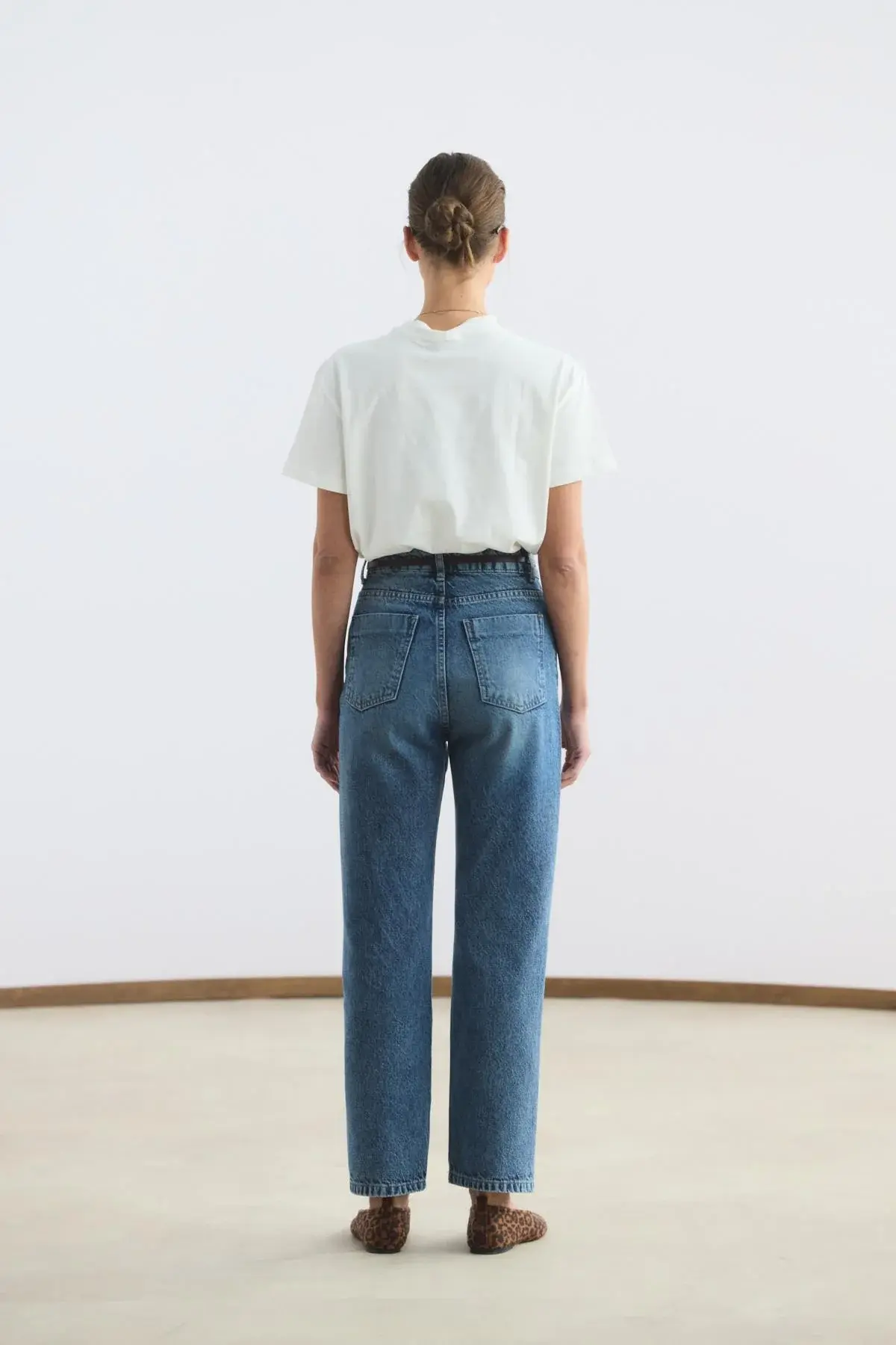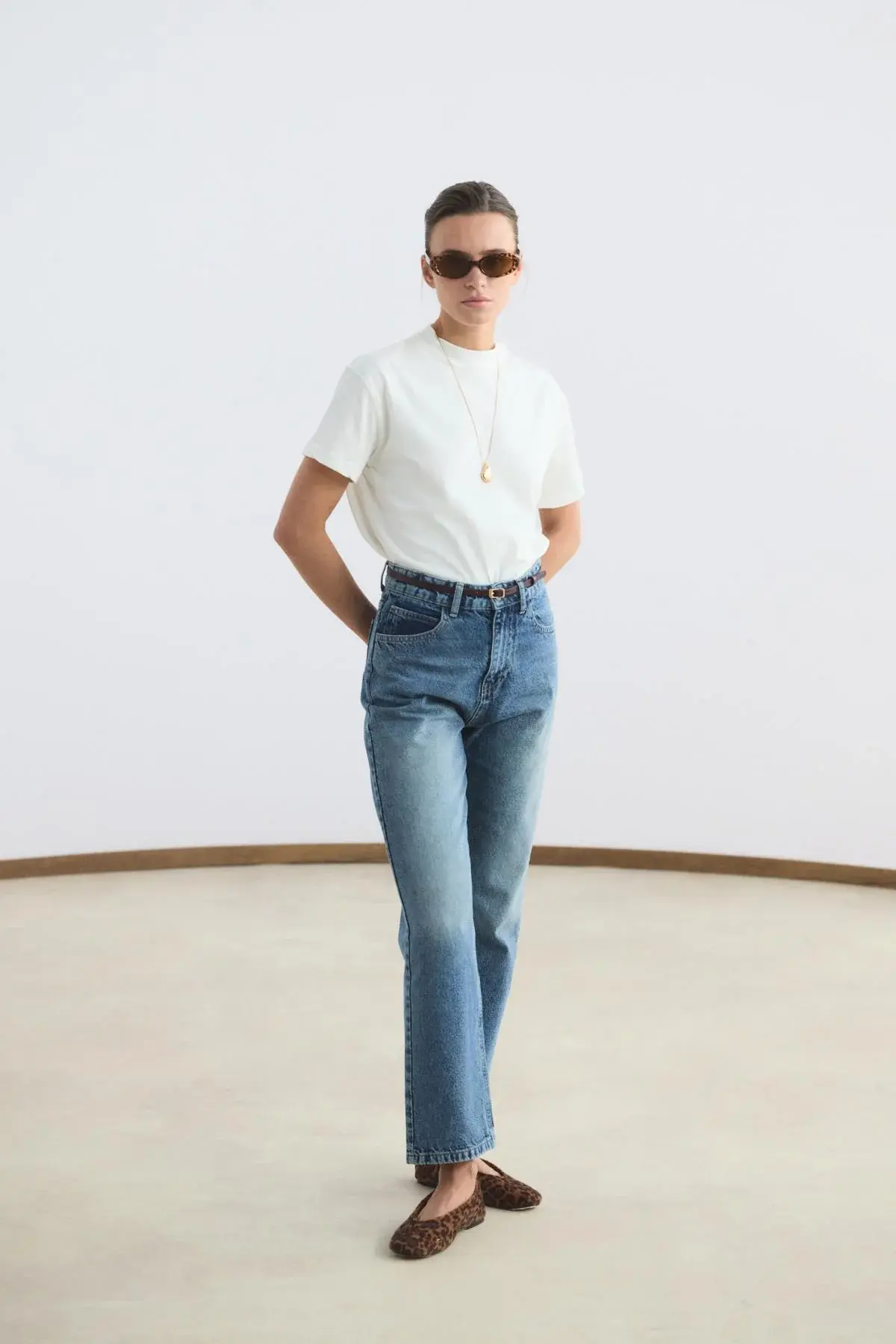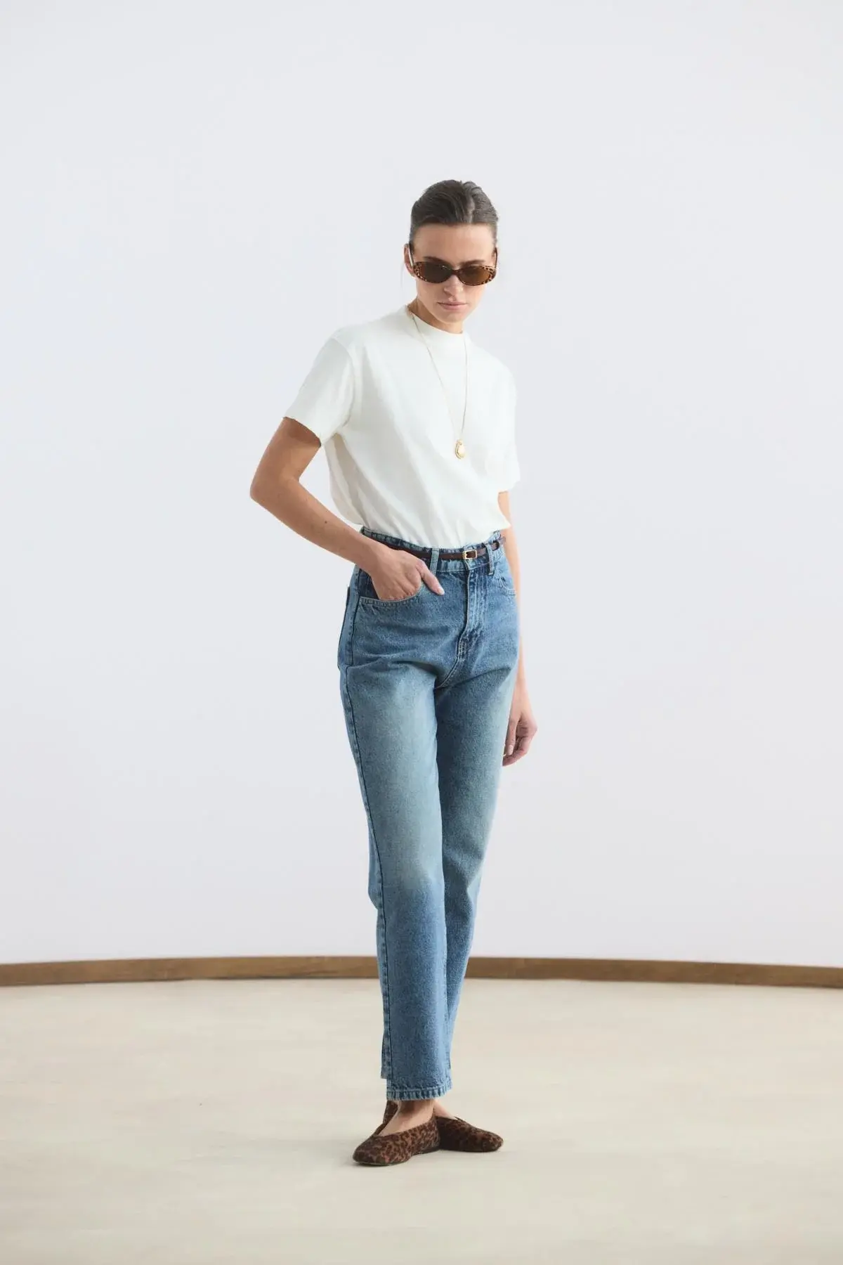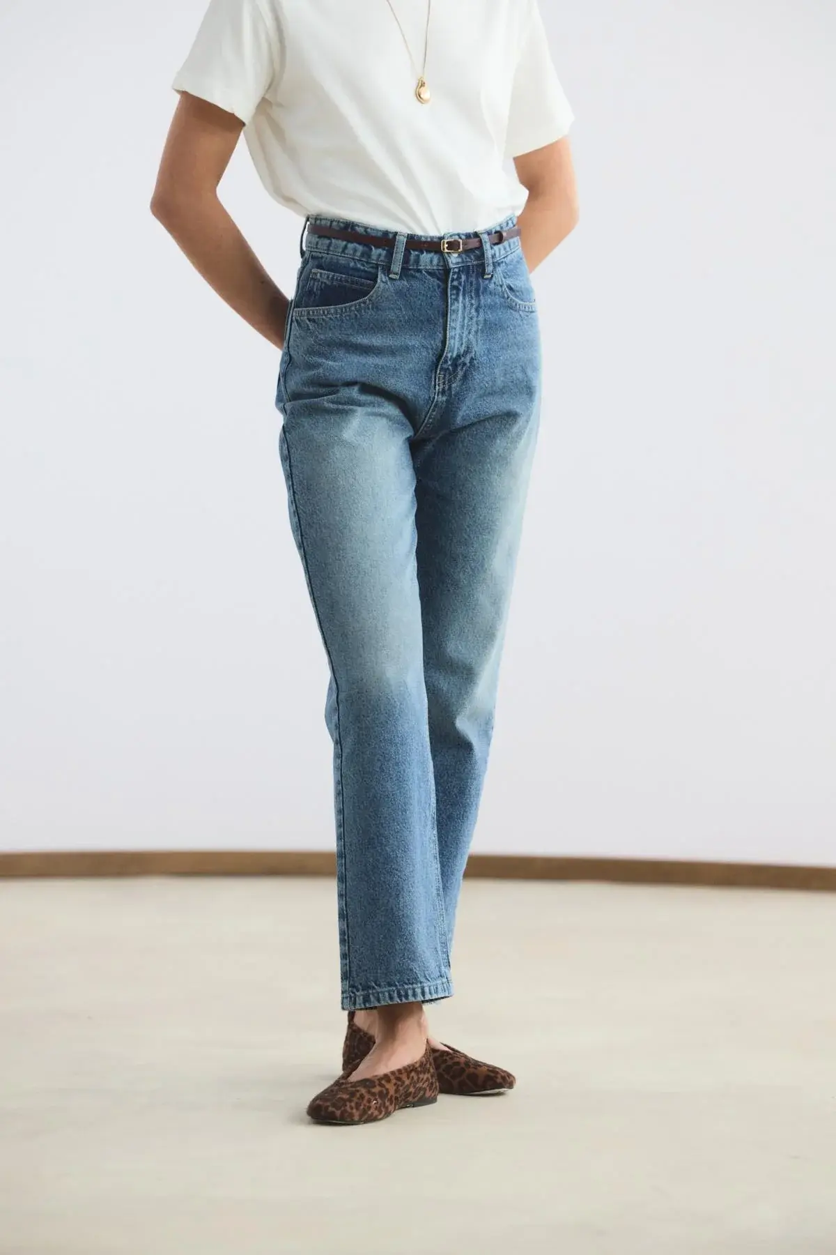 Yüksek Bel Düz Paça Kot Pantolon Orta Mavi, gabardin kumaşının dayanıklı ve formunu koruyan yapısıyla stilinize güçlü bir temel oluşturur. Bel hattını zarifçe vurgulayan yüksek bel tasarımı, düz paça kesimiyle birleşerek bacak boyunu daha uzun ve dengeli gösteren zamansız bir silüet sunar. Cepli klasik yapısı ve sağlam fermuar kapaması, günlük kullanımda işlevselliği ön plana çıkarır.
