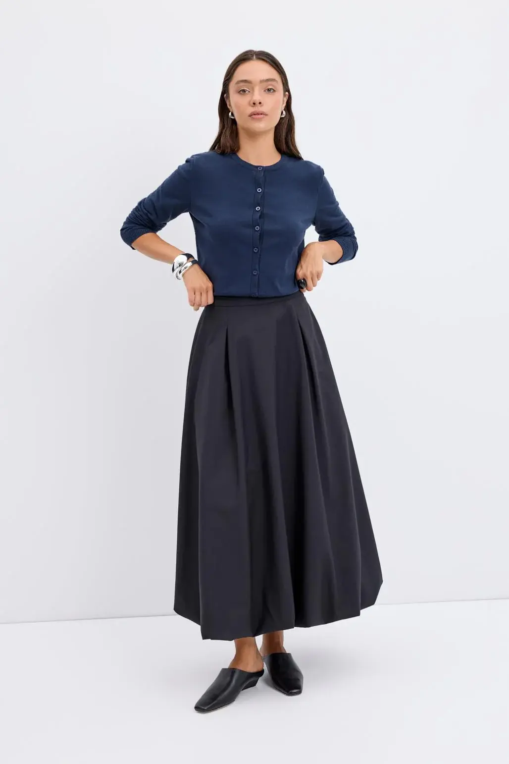 Yüksek Bel Pile Detaylı Balon Etek Siyah, poplin kumaştan üretilmiş, şıklık ve rahatlığı bir arada sunan bir parçadır. Yüksek bel kesimi zarif bir siluet yaratırken, önden pile detayları eteğe hareket ve hacim katar. Fermuarlı kapaması kolay kullanım sağlar. Astarlı yapısı konforu artırır. Hem günlük hem özel kombinlerinizde rahatlıkla tercih edebileceğiniz şık bir seçenektir.